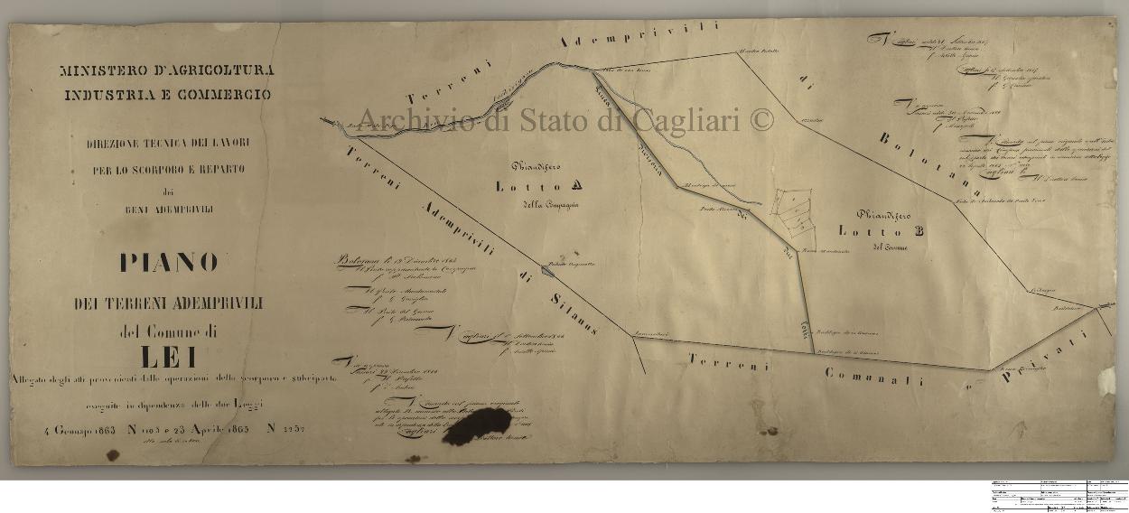 Descrizione contenuto: Ministero di Agricoltura Industria e Commercio - Direzione tecnica dei lavori per lo scorporo e reparto dei beni ademprivili. Piano dei terreni ademprivili del Comune di Lei. |