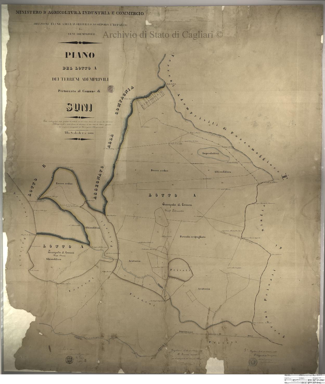 Descrizione contenuto: Ministero di Agricoltura Industria e Commercio - Direzione tecnica dei lavori per lo scorporo e reparto dei beni ademprivili. Piano del lotto A dei terreni ademprivili pertoccato al Comune di Suni colla indicazione delle qualità di coltura in cui venne divisa la massa dei terreni ademprivili, e della linea di divisione in due lotti di valore eguale e dei compensi assegnati ai cussorgiali ademprivisti. |