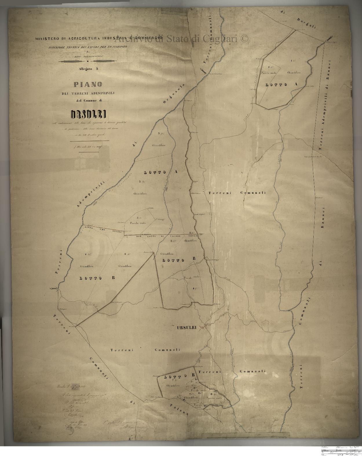 Descrizione contenuto: Ministero di Agricoltura Industria e Commercio - Direzione tecnica dei lavori per lo scorporo dei beni ademprivili. Piano dei terreni ademprivili del Comune di Ursulei coll'indicazione delle linee che separano le diverse qualità di produzione e della linea divisoria del terreno in due lotti di valore eguale. |