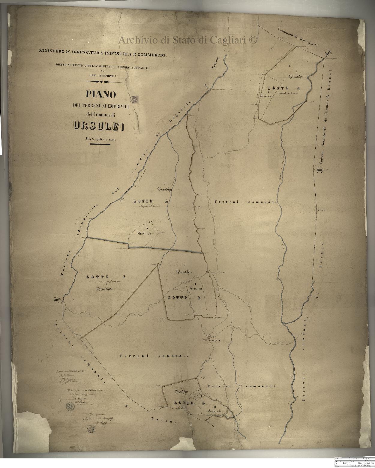 Descrizione contenuto: Ministero di Agricoltura Industria e Commercio - Direzione tecnica dei lavori per lo scorporo e reparto dei beni ademprivili. Piano dei terreni ademprivili del Comune di Ursulei. |
