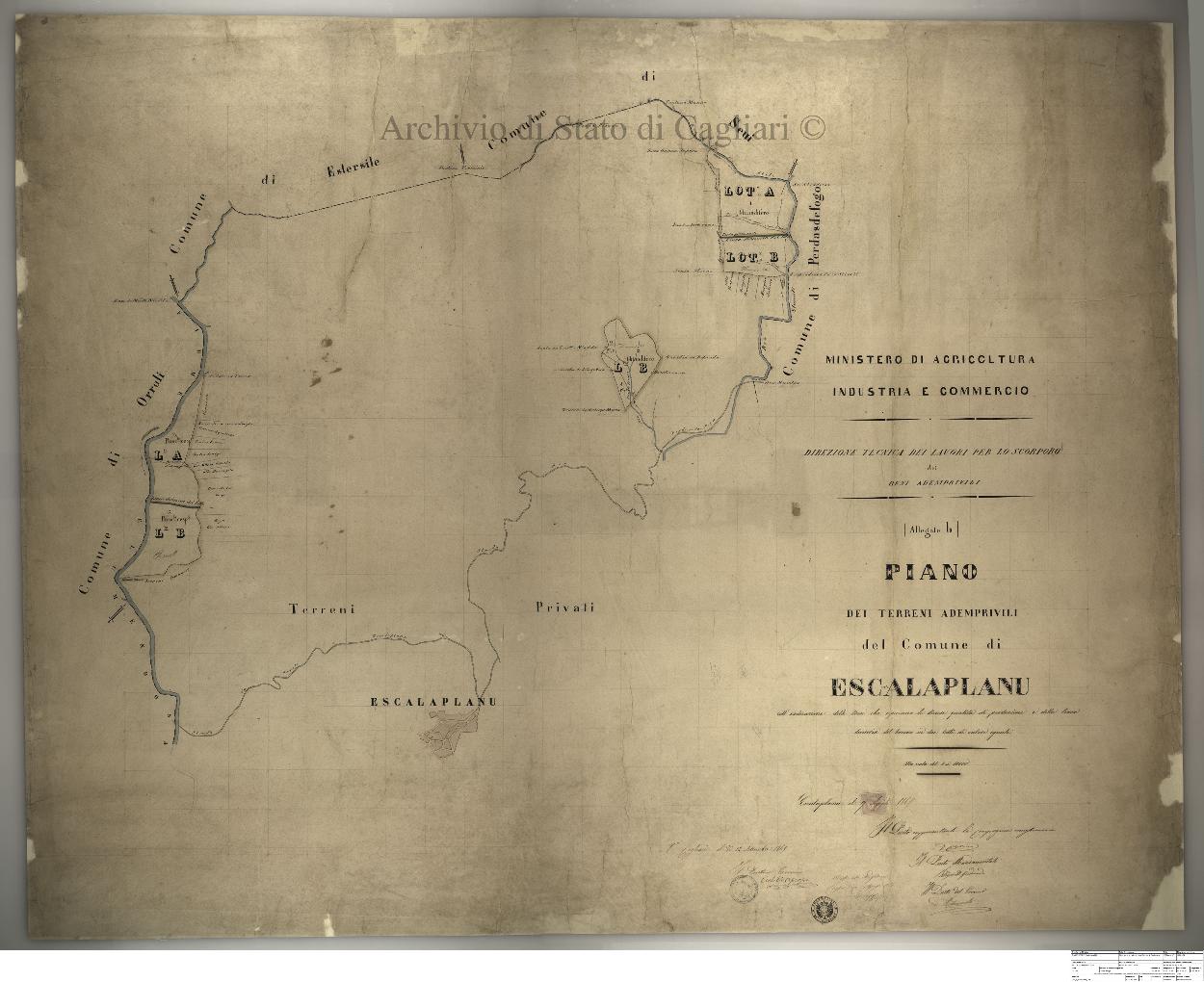 Descrizione contenuto: Ministero di Agricoltura Industria e Commercio - Direzione tecnica dei lavori per lo scorporo dei beni ademprivili. Piano dei terreni ademprivili del Comune di Escalaplanu coll'indicazione delle linee che separano le diverse qualità di produzione e della linea divisoria del terreno in due lotti di valore eguale. |