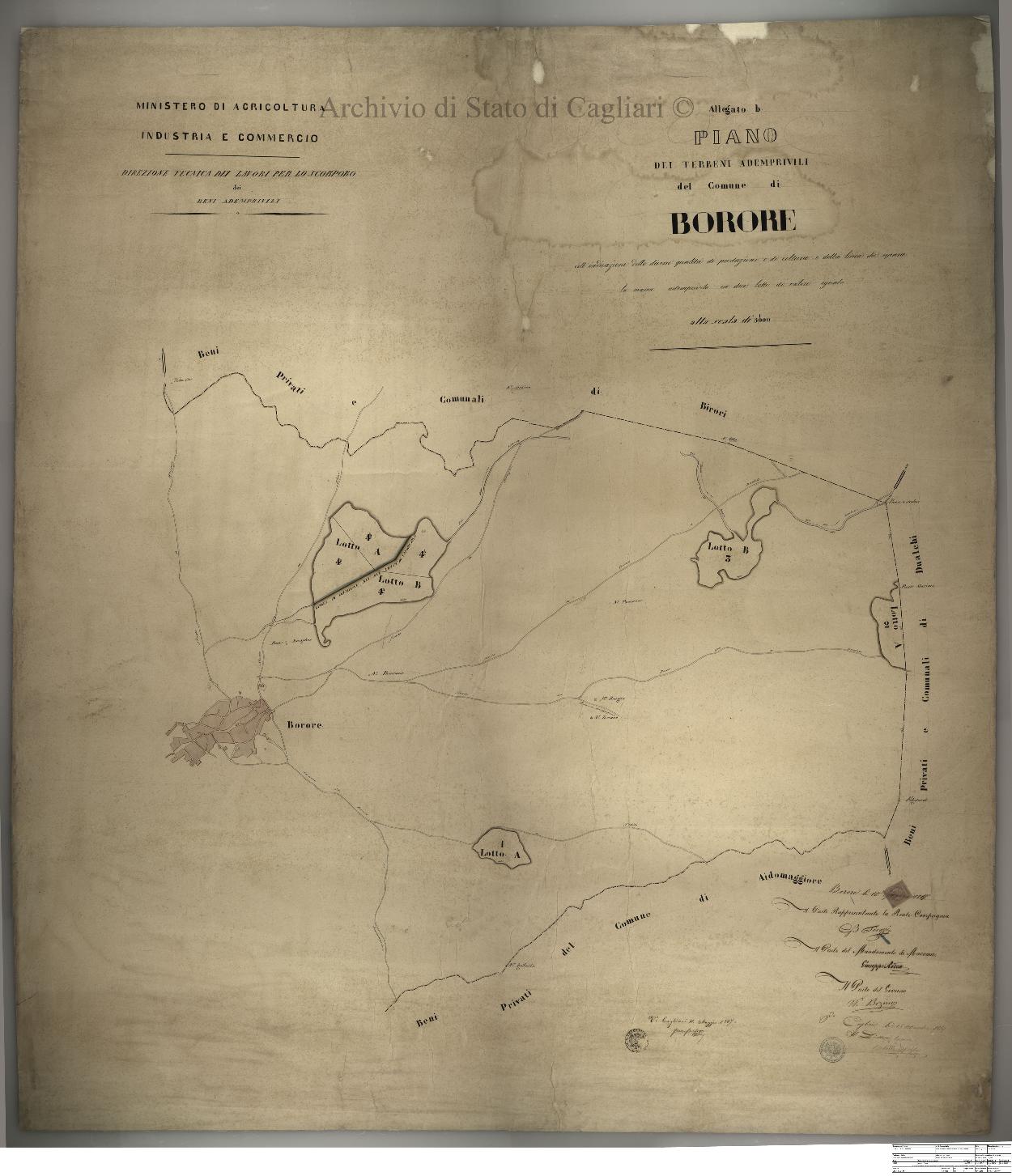 Descrizione contenuto: Ministero di Agricoltura Industria e Commercio - Direzione tecnica dei lavori per lo scorporo dei beni ademprivili. Piano dei terreni ademprivili del Comune di Borore coll'indicazione delle diverse qualità di produzione di coltura e della linea che separa la massa ademprivile in due lotti di valore eguale. |