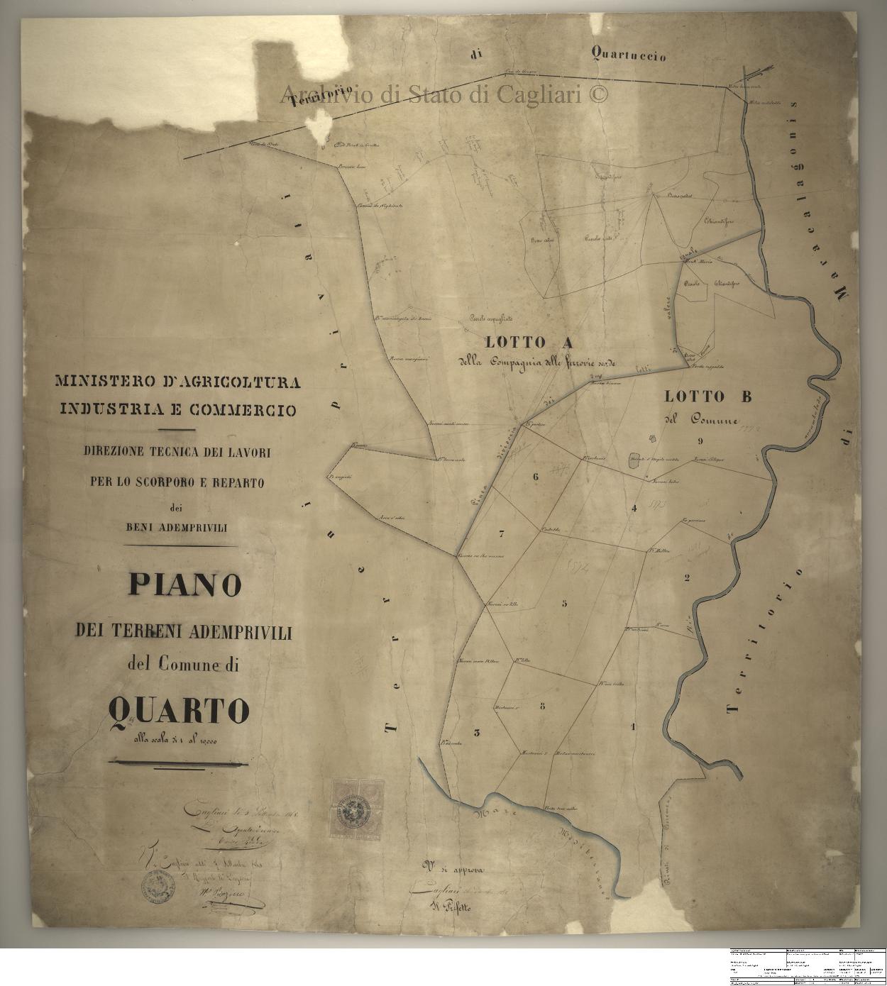 Descrizione contenuto: Ministero d'Agricoltura Industria e Commercio - Direzione tecnica dei lavori per lo scorporo e reparto dei beni ademprivili. Piano dei terreni ademprivili del Comune di Quarto. |