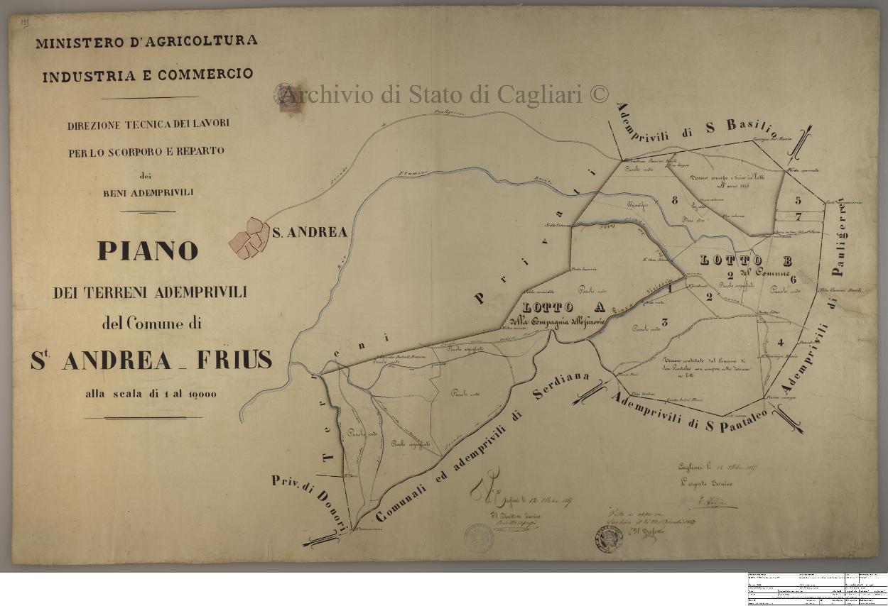 Descrizione contenuto: Ministero d'Agricoltura Industria e Commercio - Direzione tecnica dei lavori per lo scorporo e reparto dei beni ademprivili. Piano dei terreni ademprivili del Comune di Sant'Andrea Frius. |