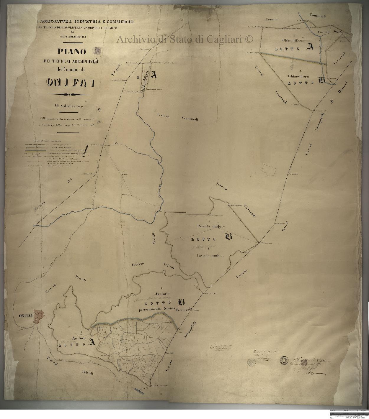 Descrizione contenuto: Ministero d'Agricoltura Industria e Commercio - Direzione tecnica dei lavori per lo scorporo e reparto dei beni ademprivili. Piano dei terreni ademprivili del Comune di Onifai coll'indicazione dei compensi stati assegnati in dipendenza della Legge del 23 aprile 1865. |