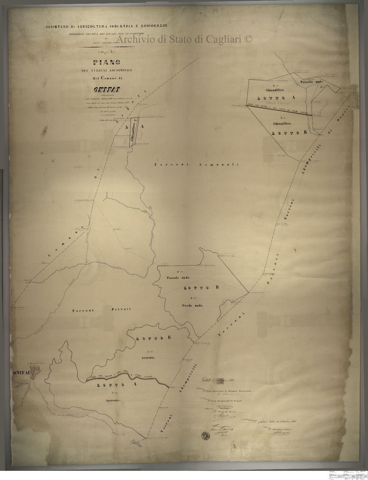 Descrizione contenuto: Ministero di Agricoltura Industria e Commercio - Direzione tecnica dei lavori per lo scorporo dei beni ademprivili. Piano dei terreni ademprivili del Comune di Onifai coll'indicazione delle qualità di produzione in cui venne divisa la massa dei terreni ademprivili e della linea divisoria dei terreni in due lotti di valore eguale. |