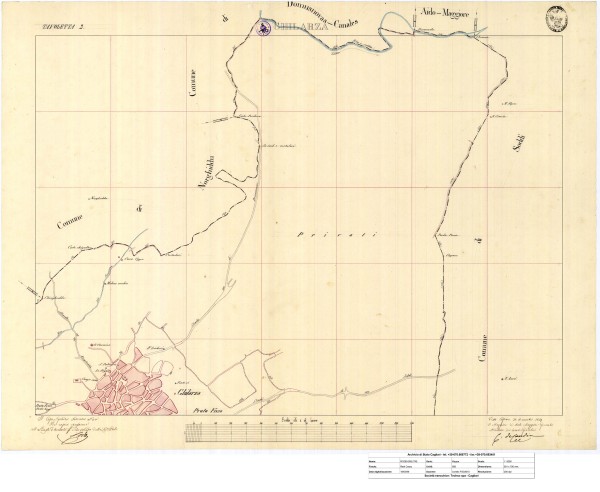 Descrizione contenuto: Delimitazione del Prato fisso [comunale] "Perda longa", di un Prato Fisso [comunale], di terreni privati e parte del centro abitato |