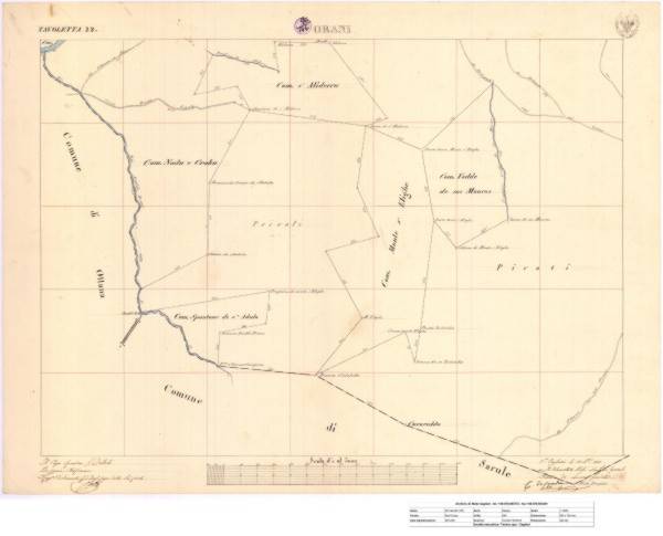 Descrizione contenuto: Delimitazione dei terreni comunali "S'Aliderru", ["Monte Nieddu"], "Nodu e Crobu", "Vadde de sas Mancas", "Monte s'Elighe", "Spuntone de Sadula" e di terreni privati |