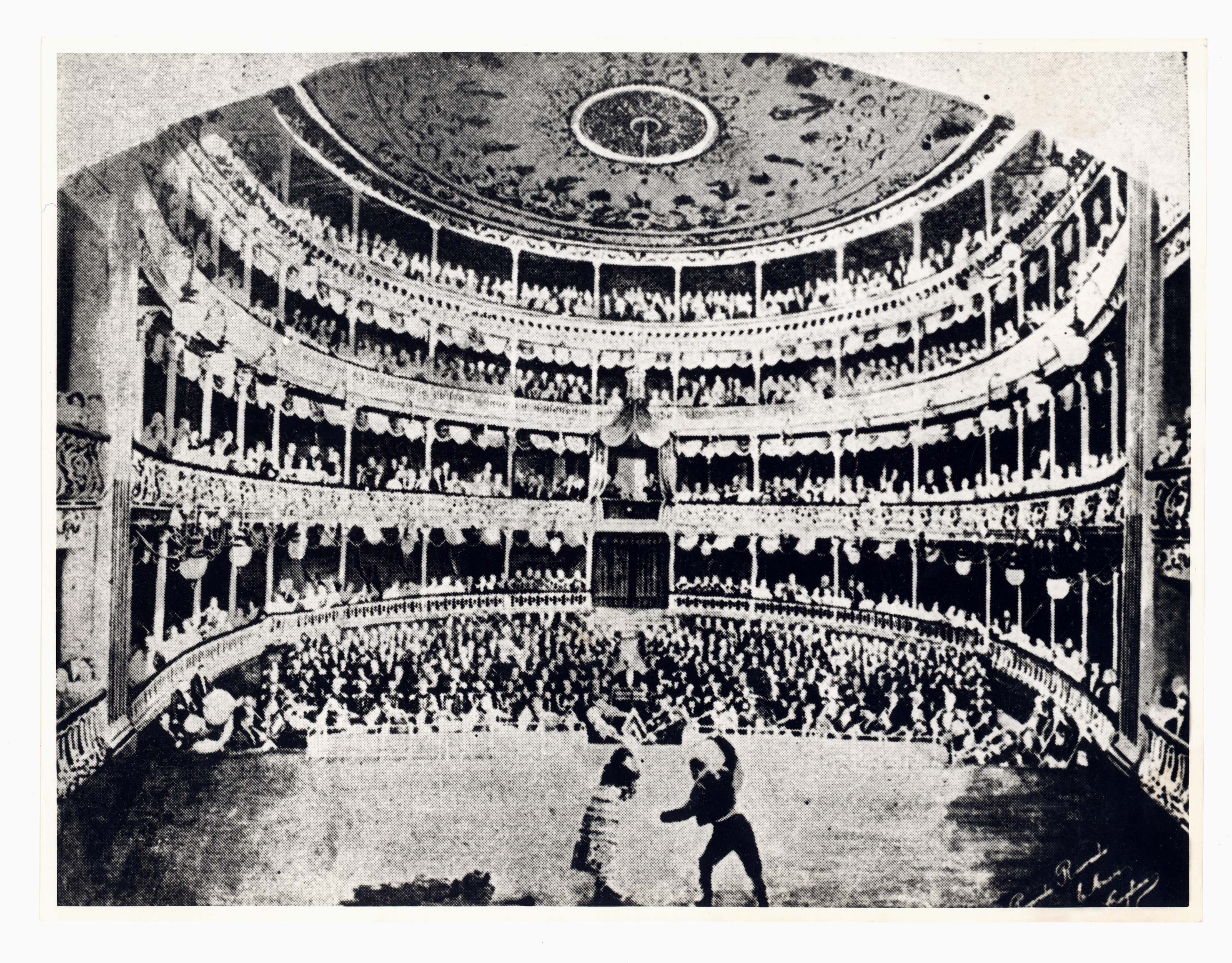 - Si tratta della riproduzione di una fotografia che costituisce uno dei primi foto montaggi e che riguardo l'interno del teatro Politeama di Cagliari.