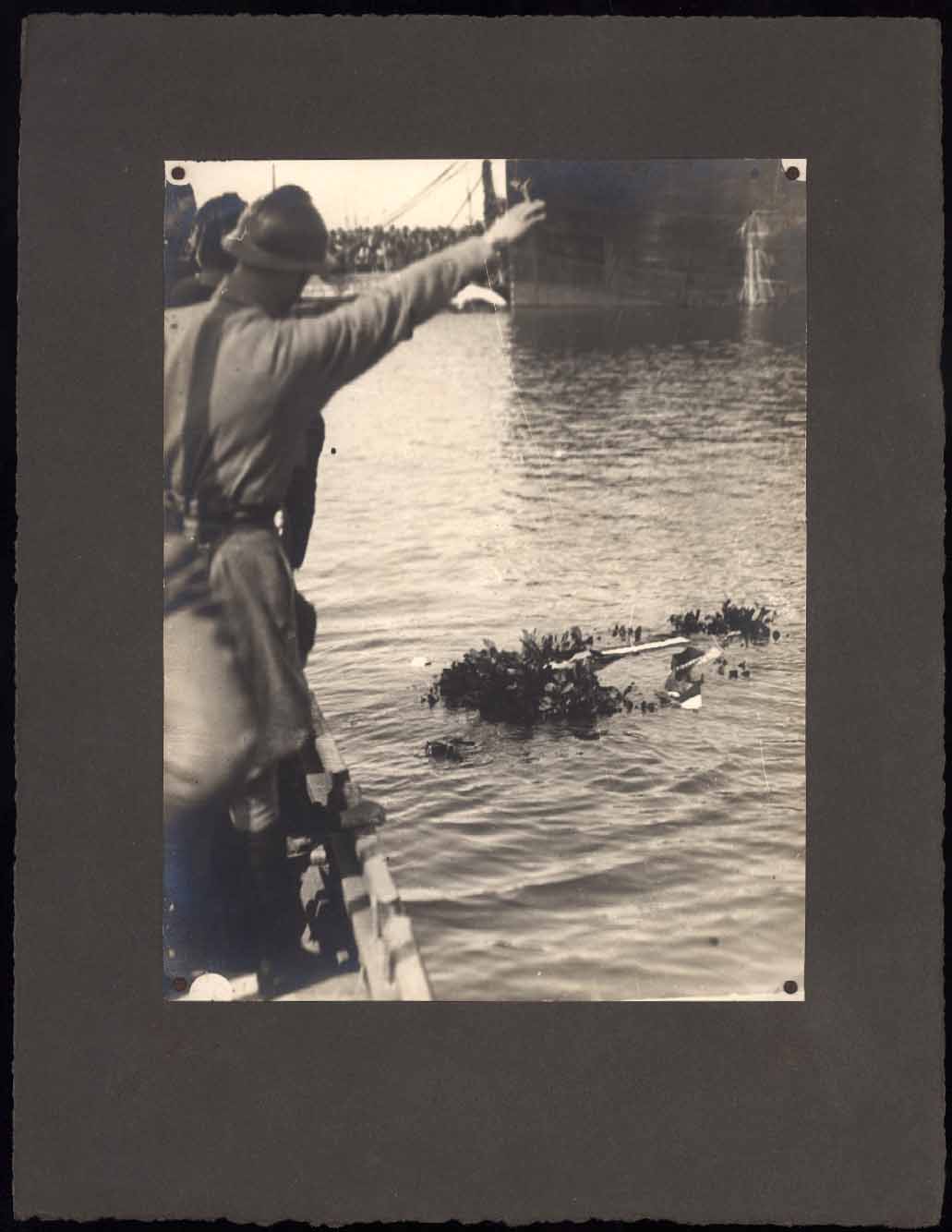 - Nella foto vediamo dei militari su un imbarcazione in occasione di una cerimonia commemorativa in onore dei caduti in mare svoltasi nel 1924.