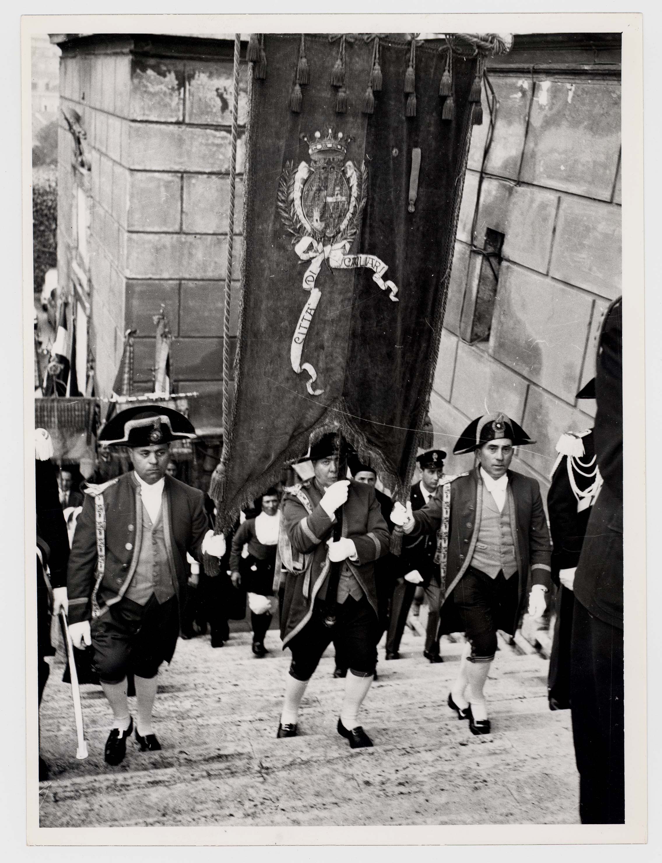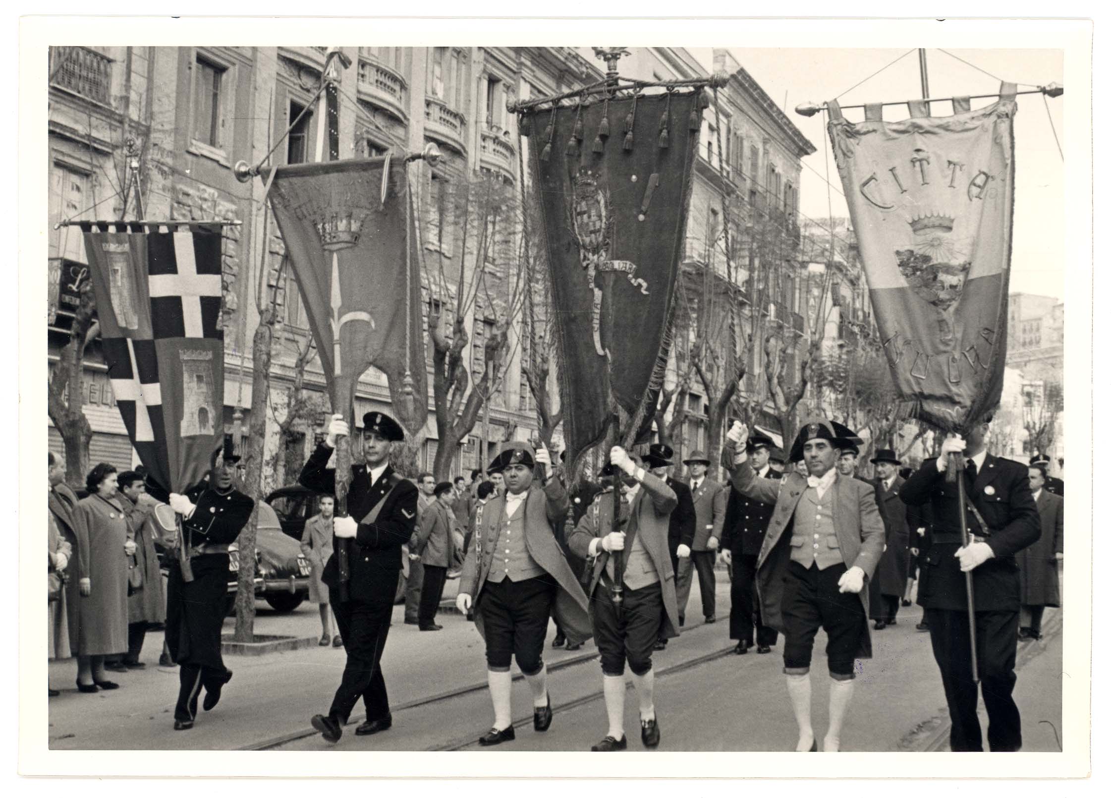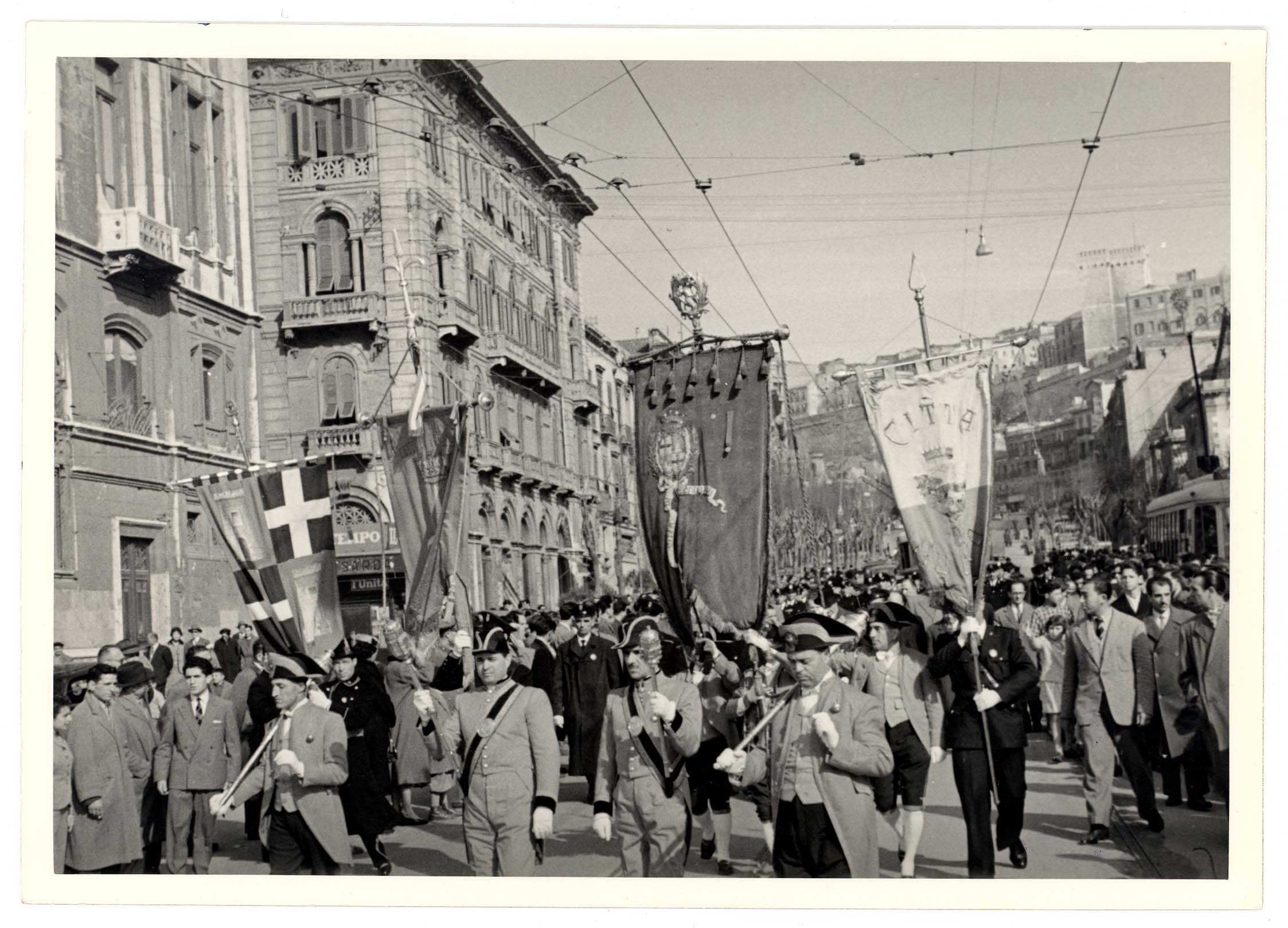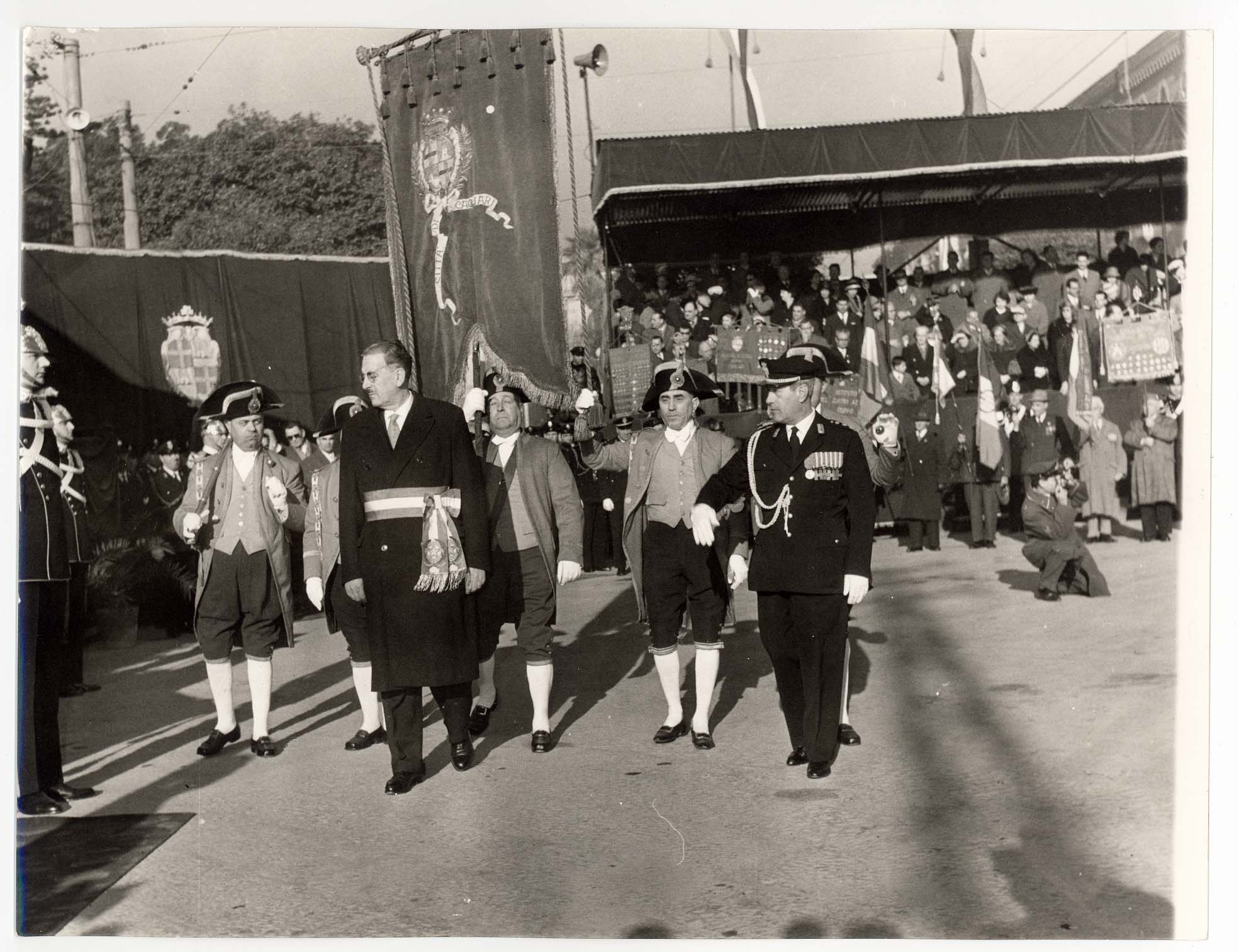 - Sfilata nella Via Roma dei rappresentanti dell'amministrazione comunale in occasione della festività di San Sebastiano, patrono dei vigili urbani. Nella foto sono visibili a partire da destra: Bonaccorso Fontana, Maria Teresa Atzori, Mario Floris, Luigi Fantola, Enrico Garu, Brunello Massazza, Michele Romagnino assessori del Comune di Cagliari sino al 1960