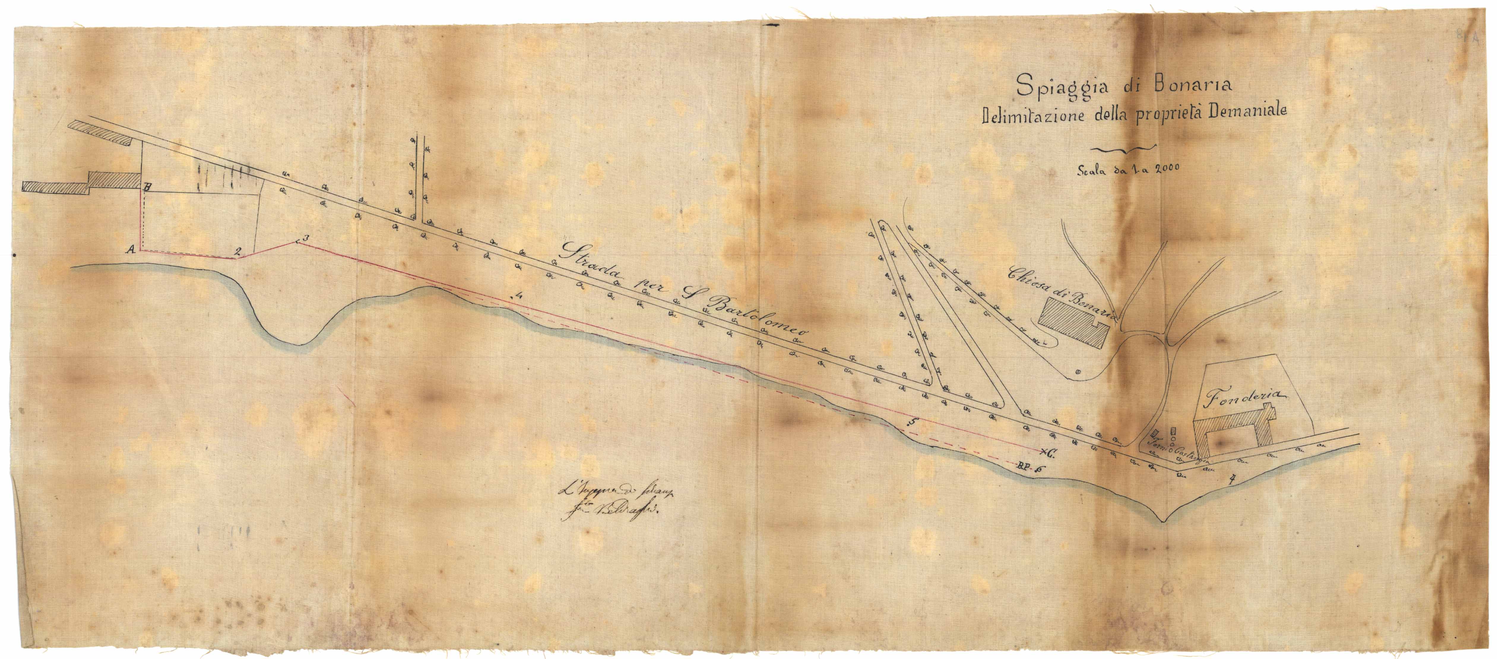 - Il disegno rappresenta il limite demaniale della "Spiaggia di Bonaria" non ancora urbanizata. Oltre alla chiesa di Bonaria il disegno comprende l'edificio della Fonderia e i forni Castangia di calce.