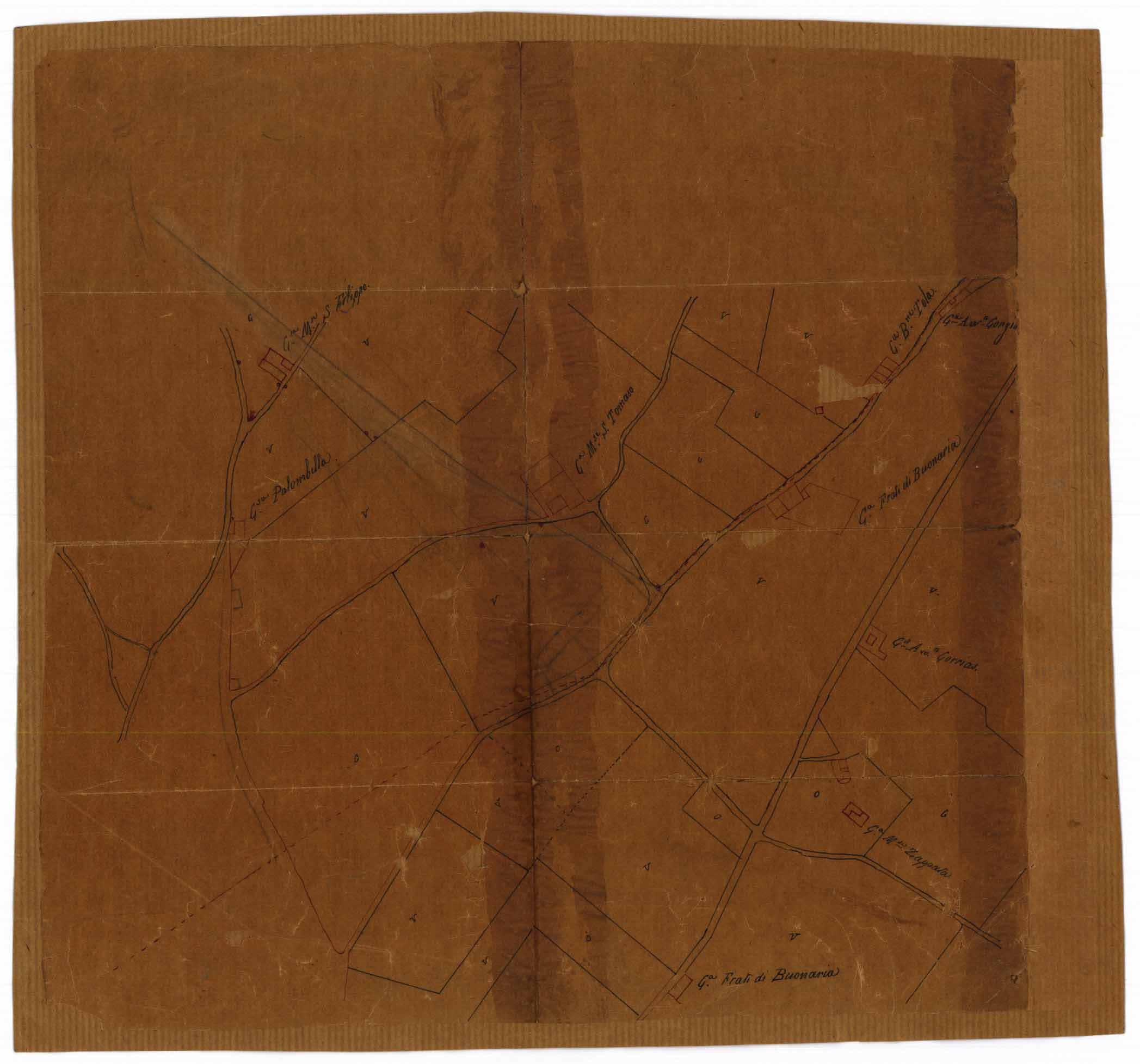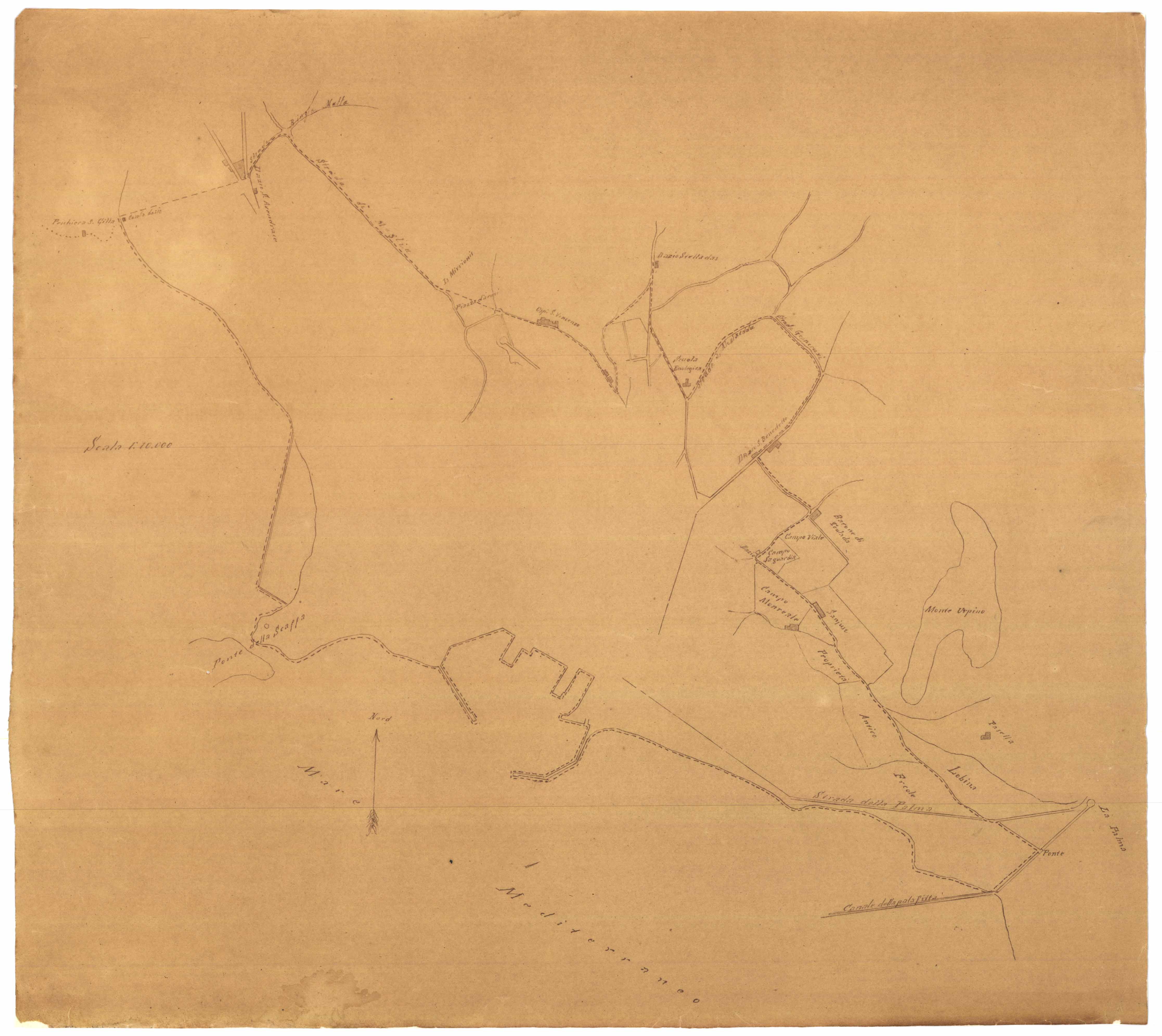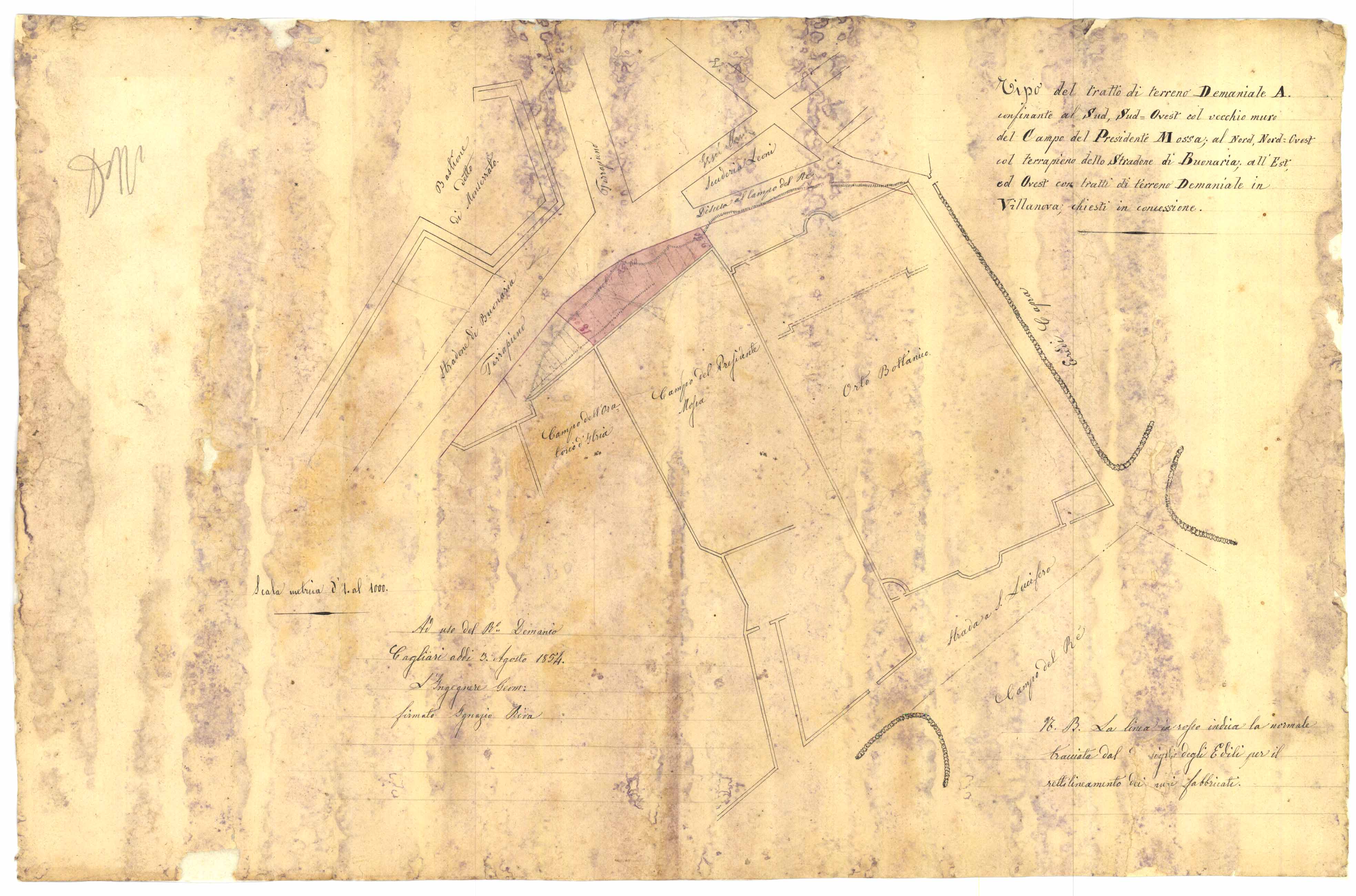 - Tipo del tratto di terreno demaniale A. confinante al sud, sud-ovest col vecchio muro del Campo del Presidente Mossa; al Nord, Nord-Ovest col terrapieno dello stradone di Buonaria;all'Est ed Ovest con trati di terreno Demaniale in Villanova chiesti in concessione.