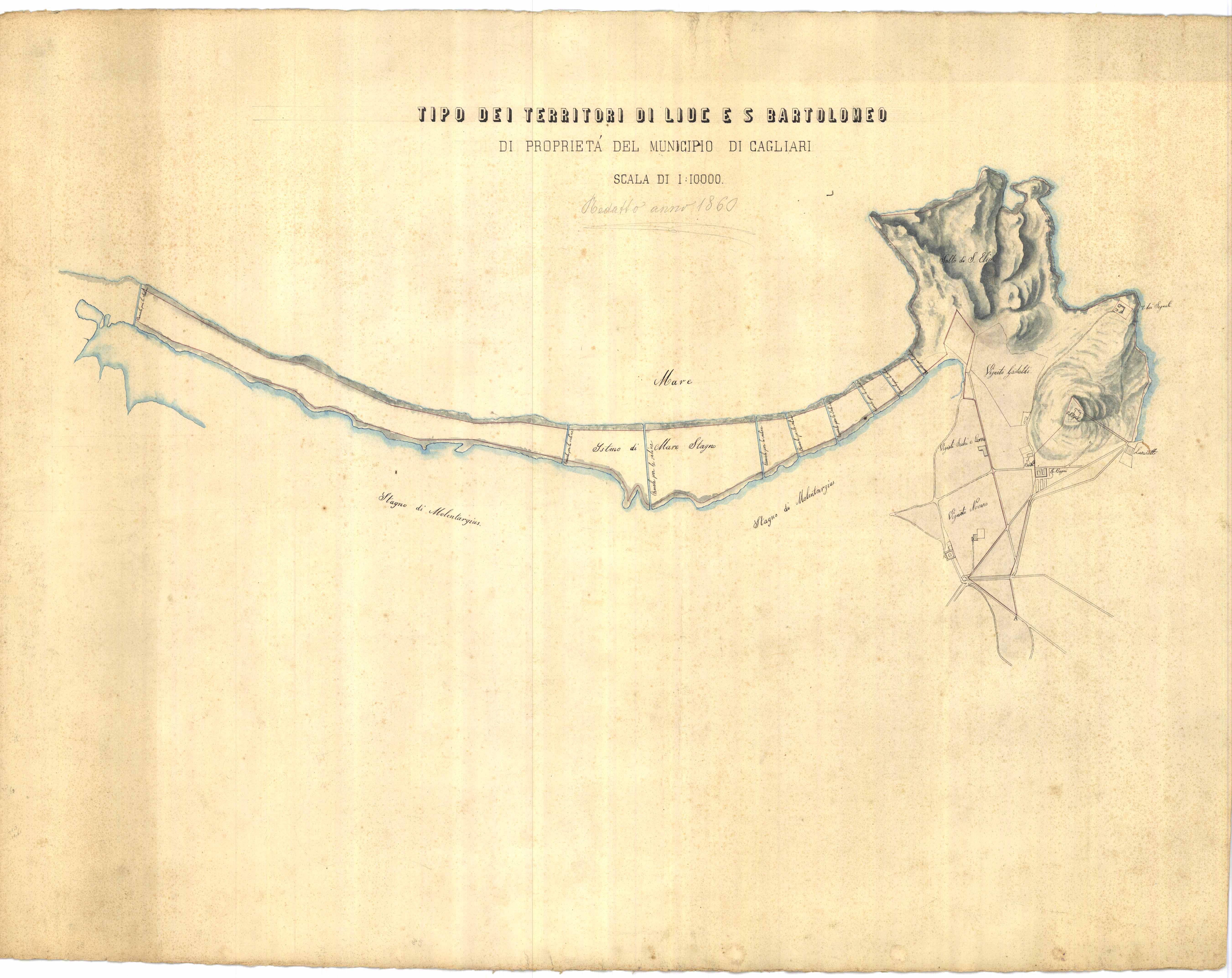 - Pianta nella quale sono individuate le proprietà del Comune di Cagliari nei quartieri di S. Bartolomeo e di Liuc, e comprende le saline e il salto di Sant'Elia.