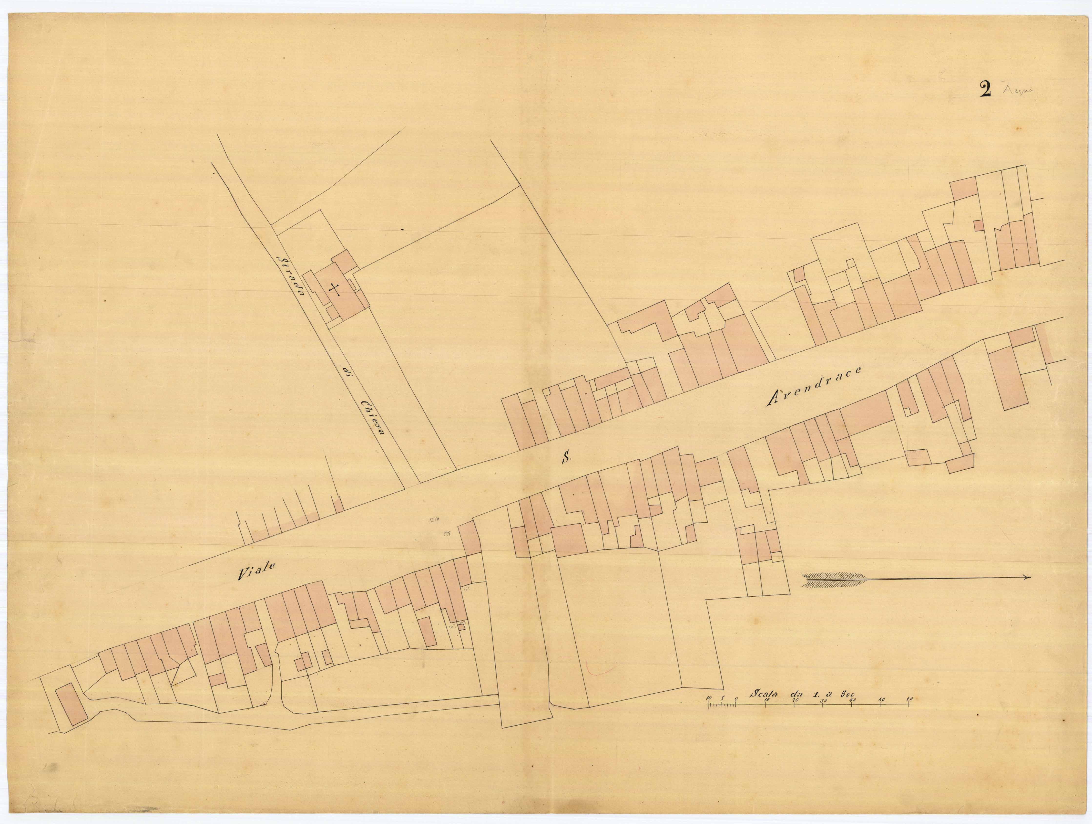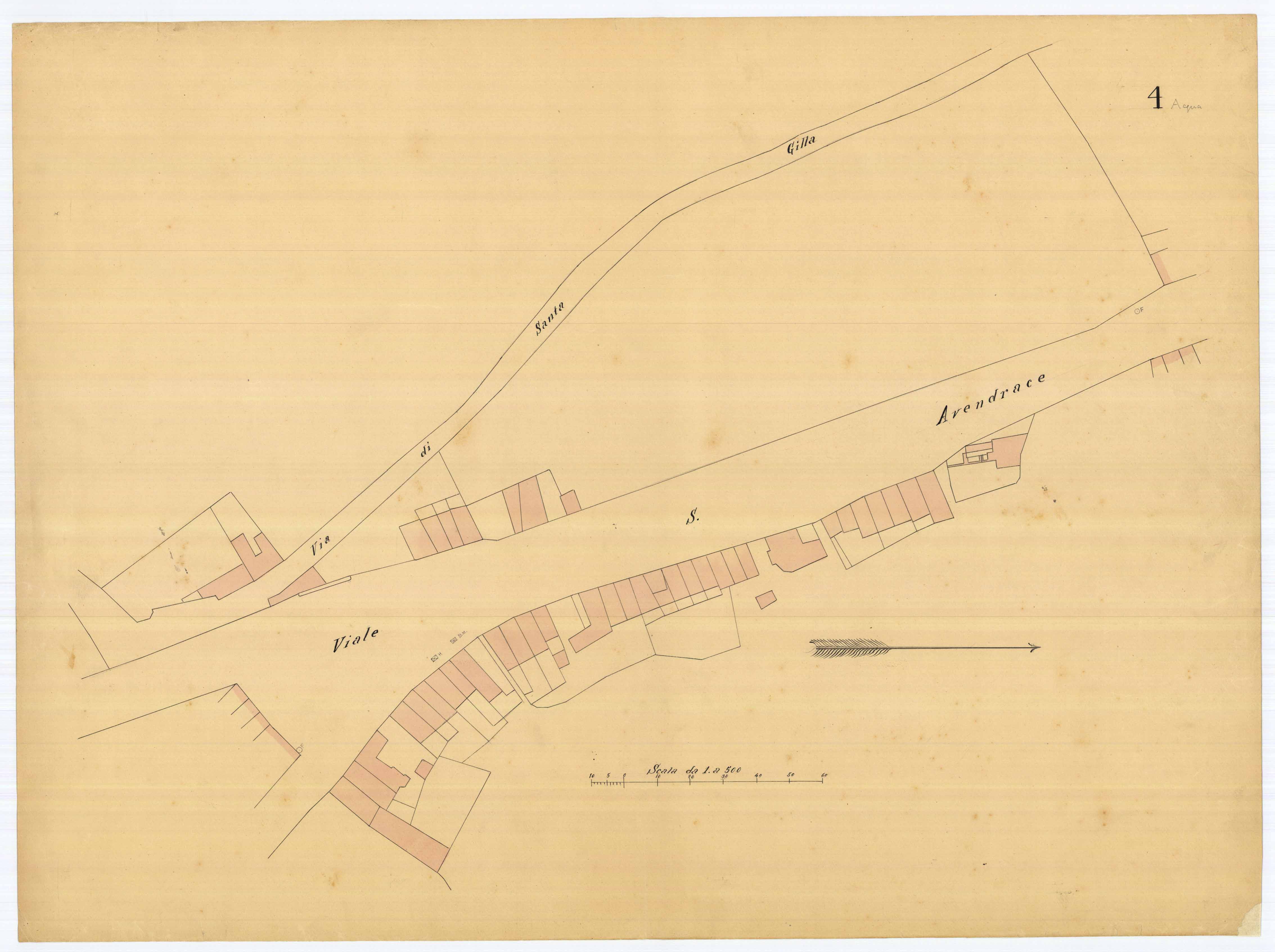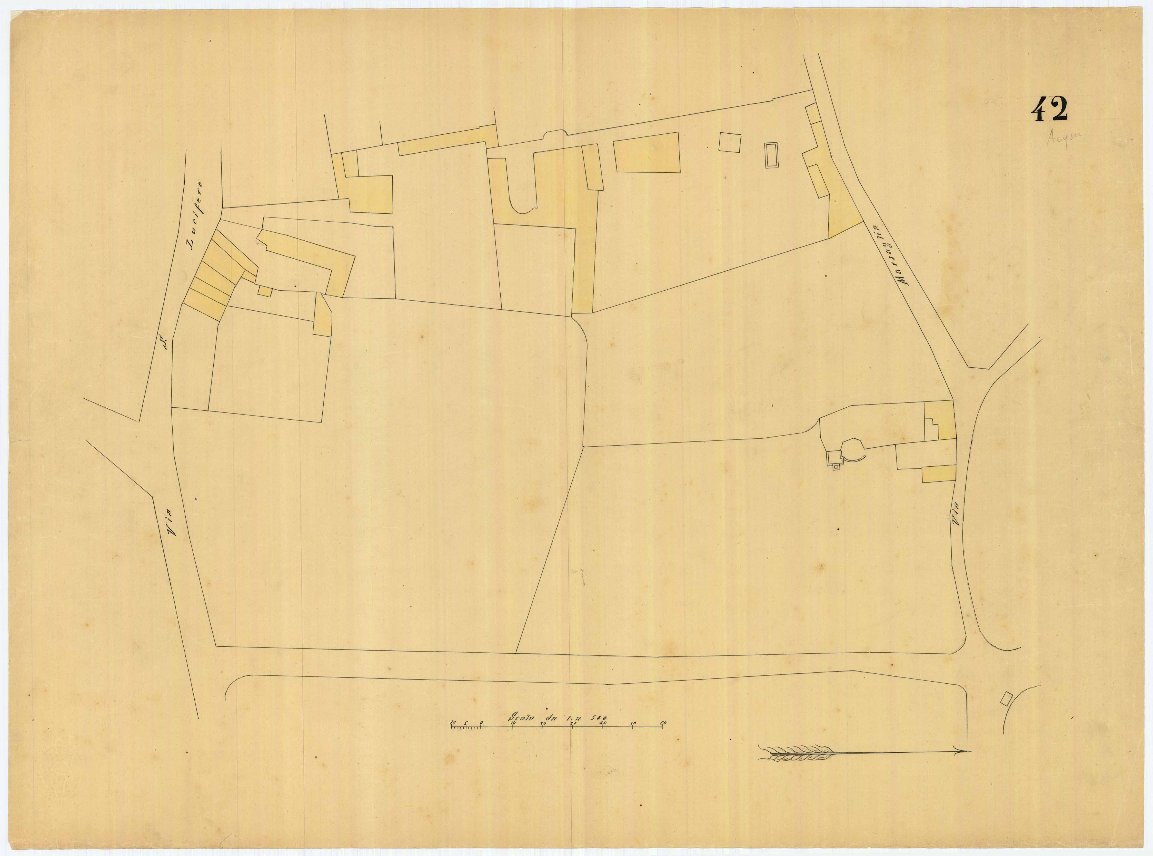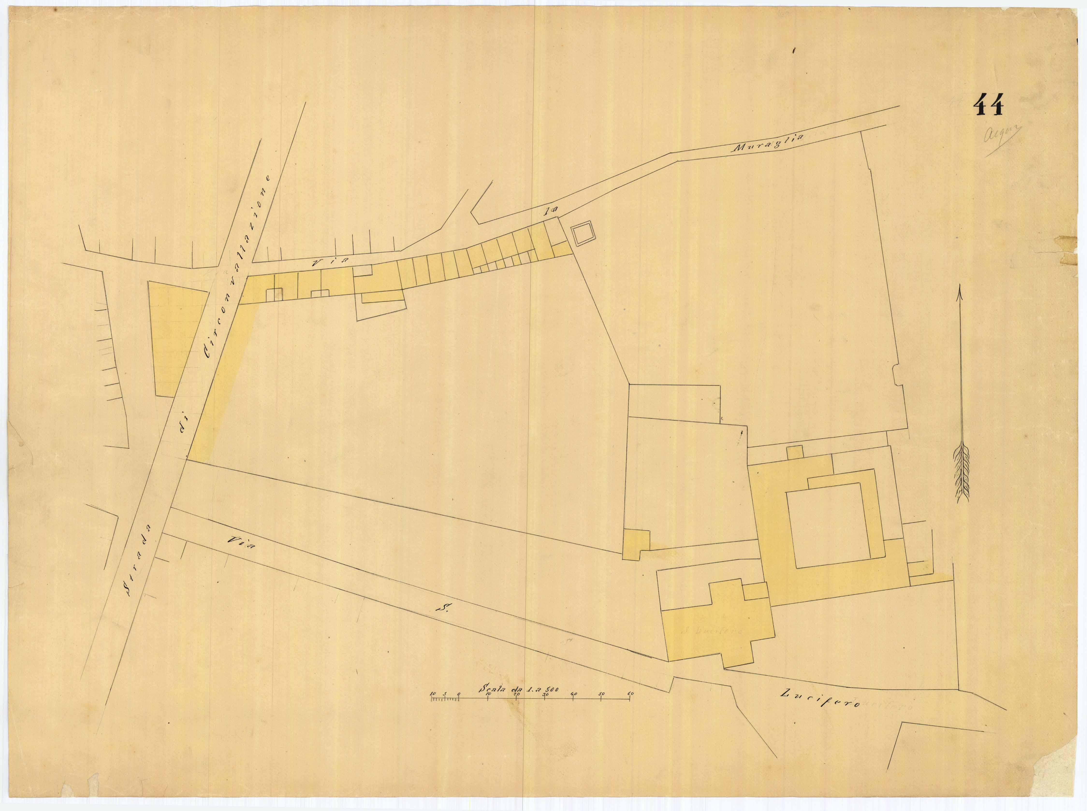 - La pianta comprende l'area estesa tra la strada di circonvallazione (attuale via Sonnino), via la Muraglia (attuale via Iglesias) e via S. Lucifero.
