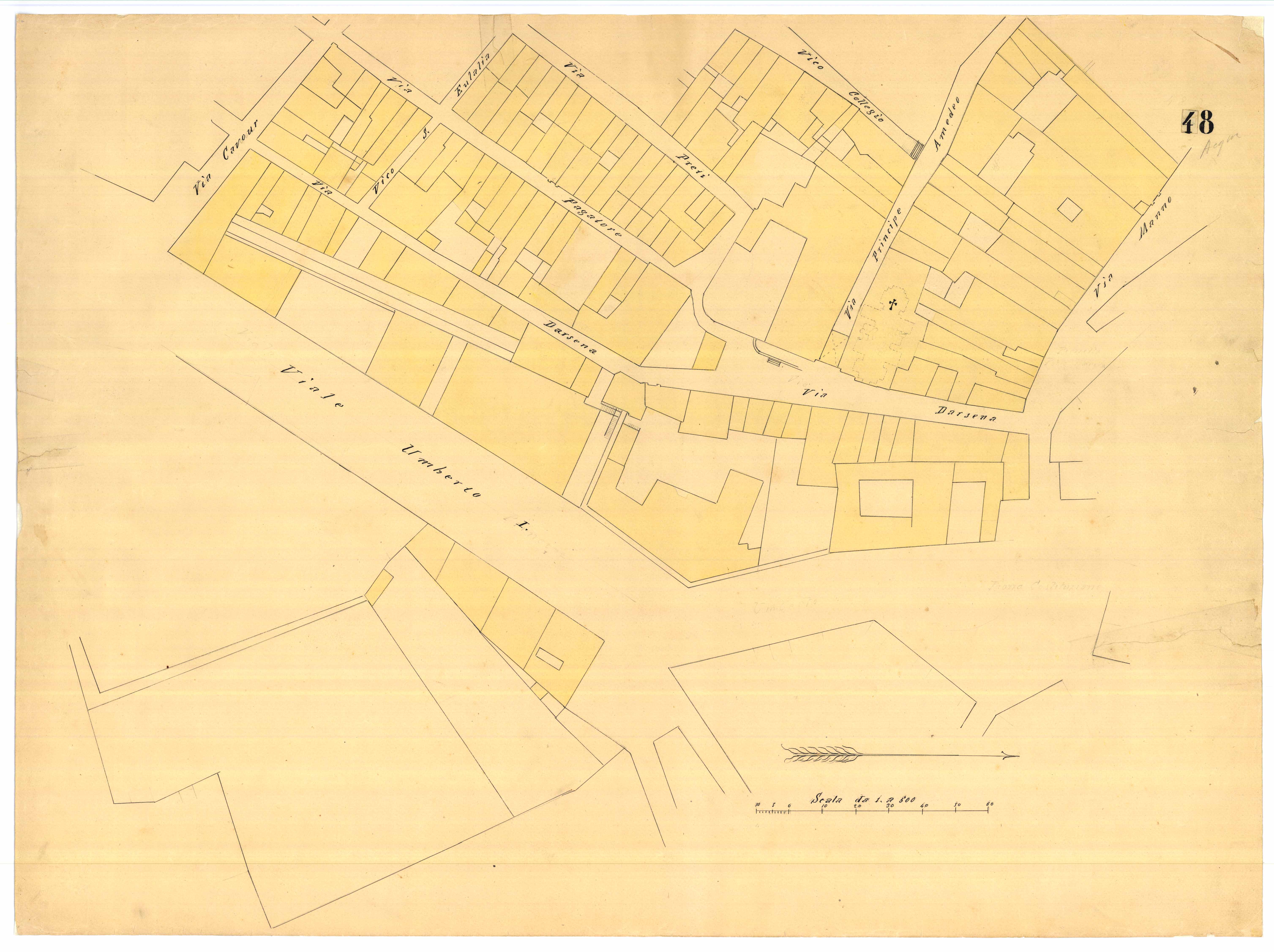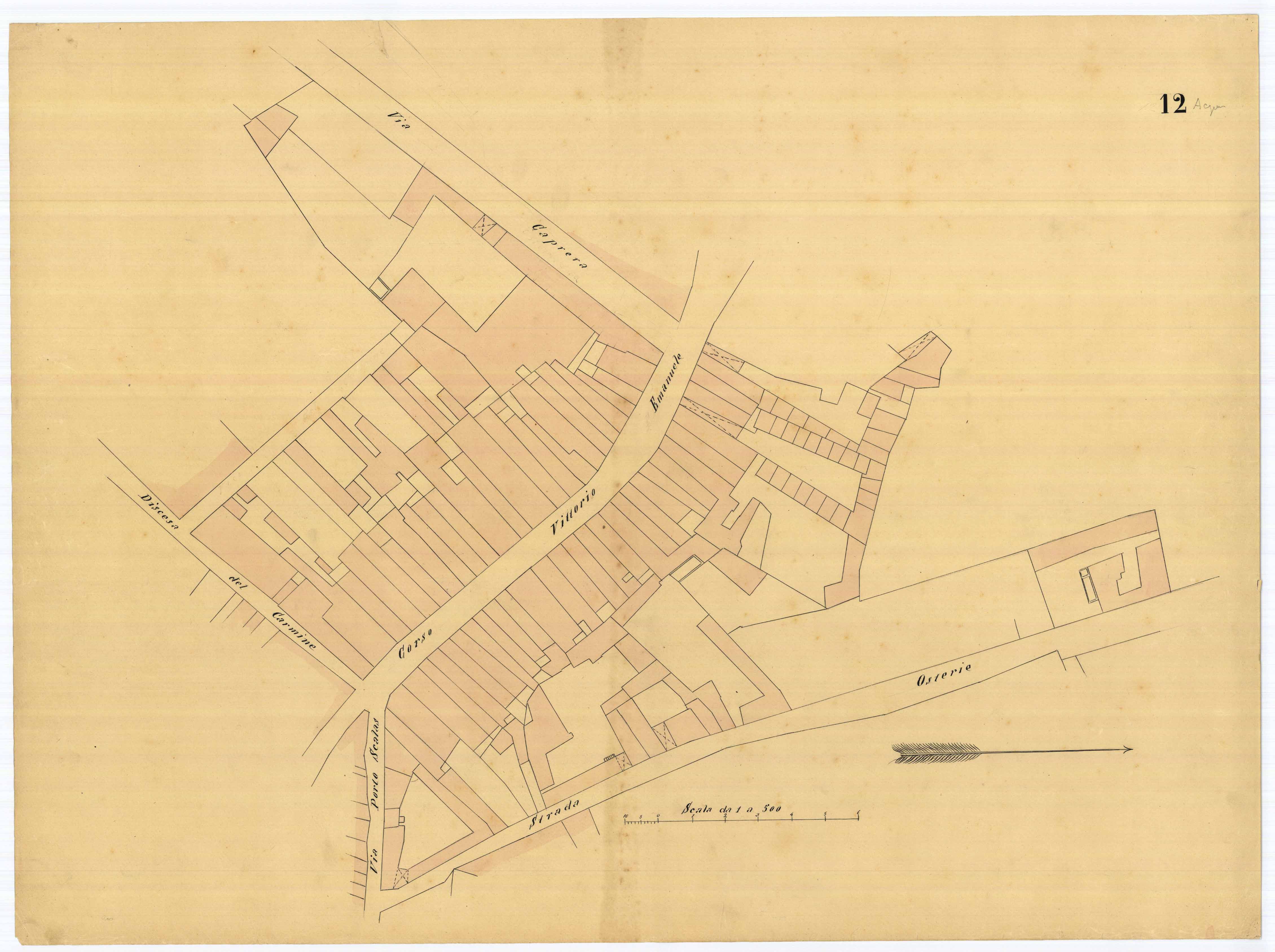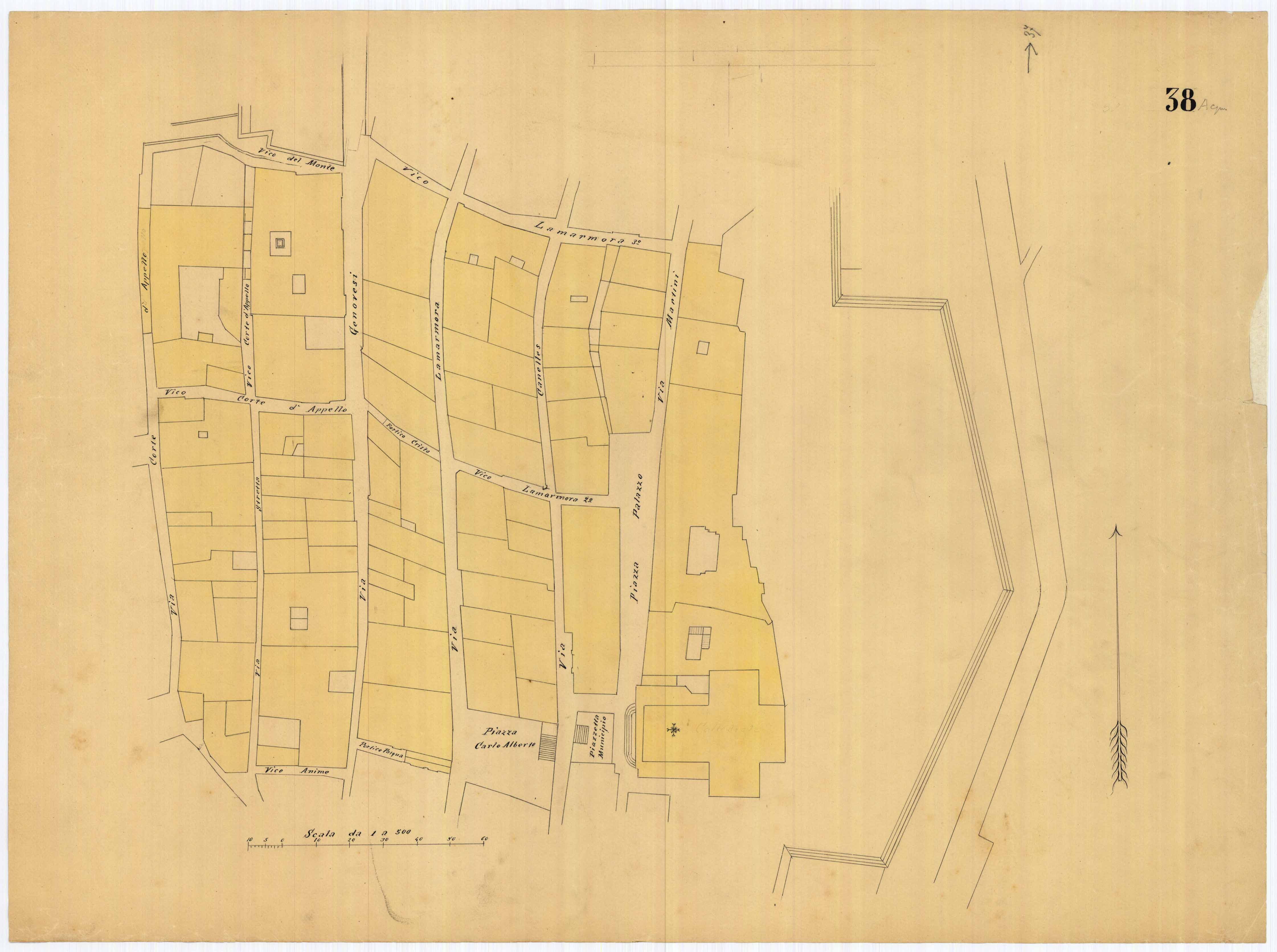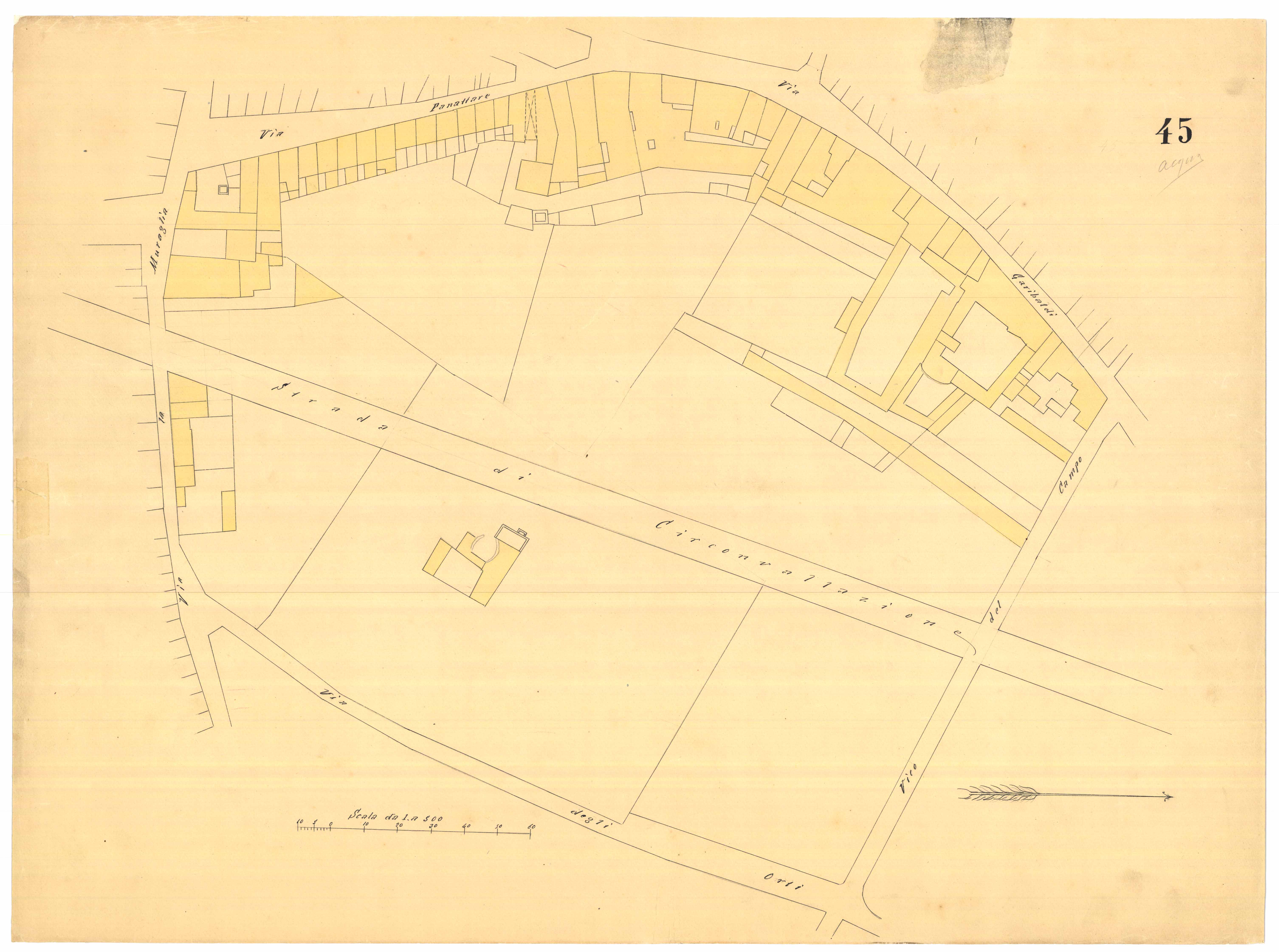 - La pianta comprende l'area estesa tra via roma, vico Circonvallazine (attuale via Concezione), via Cavour, via Darsena (attuale via Porcile)