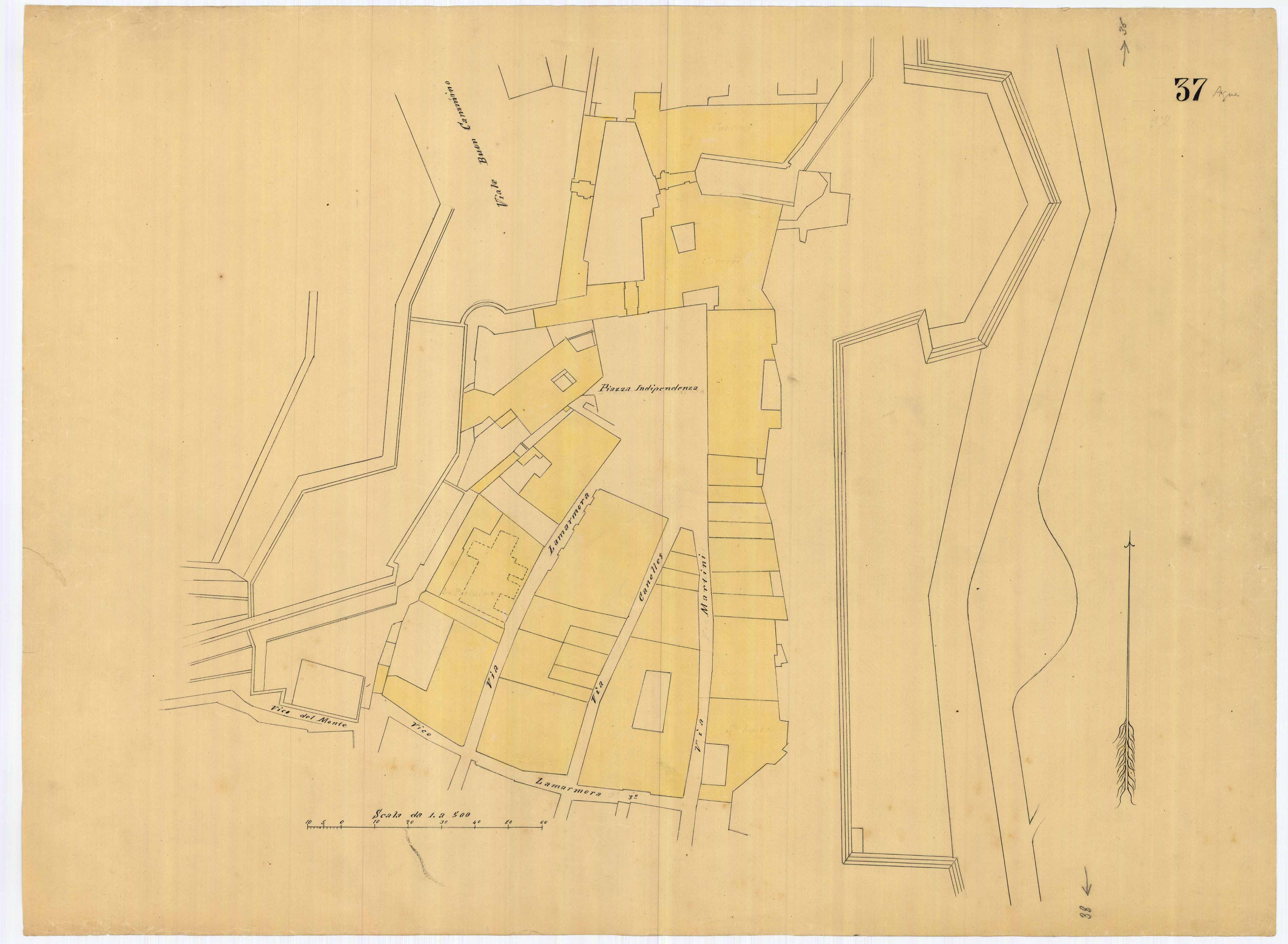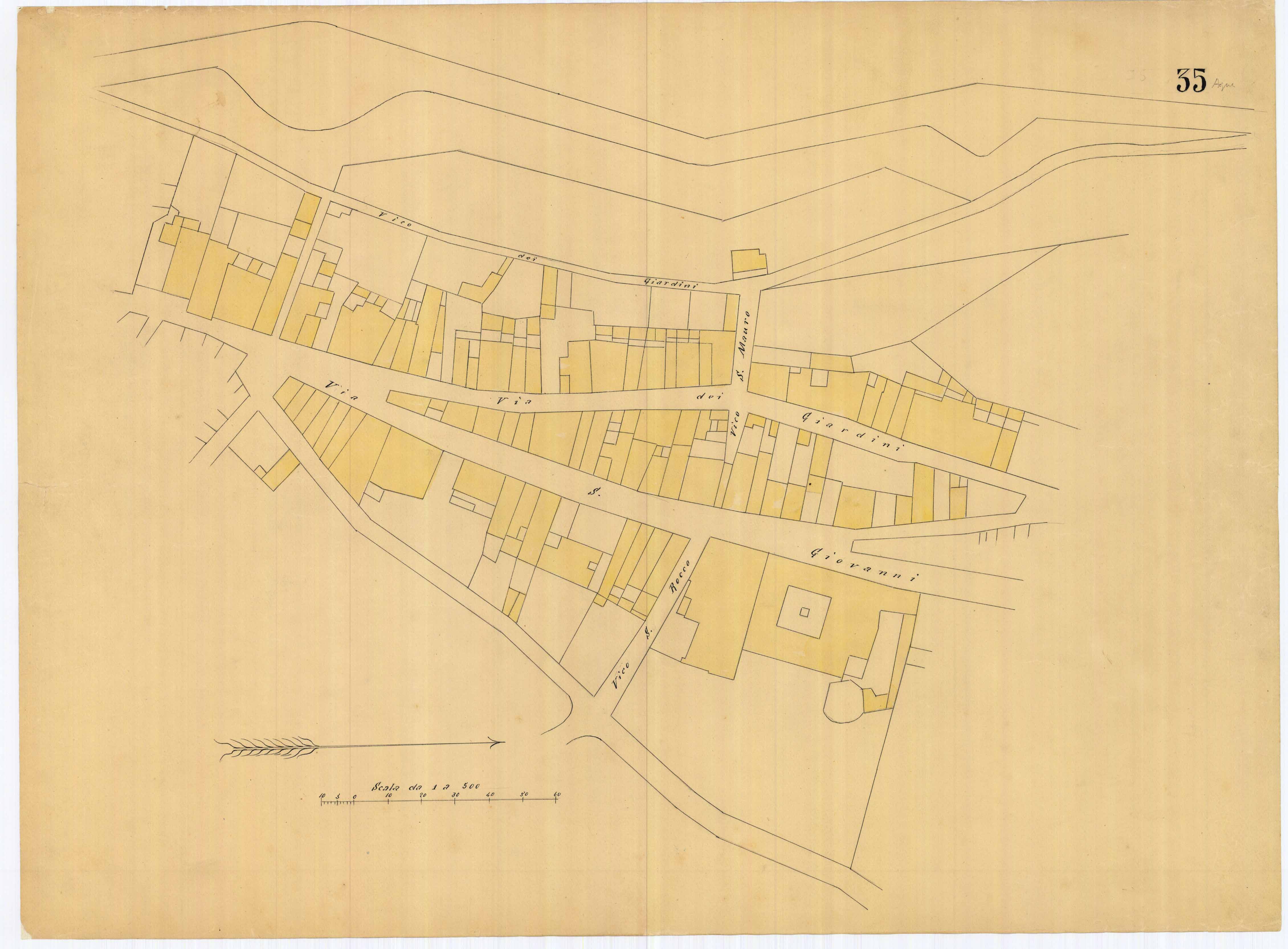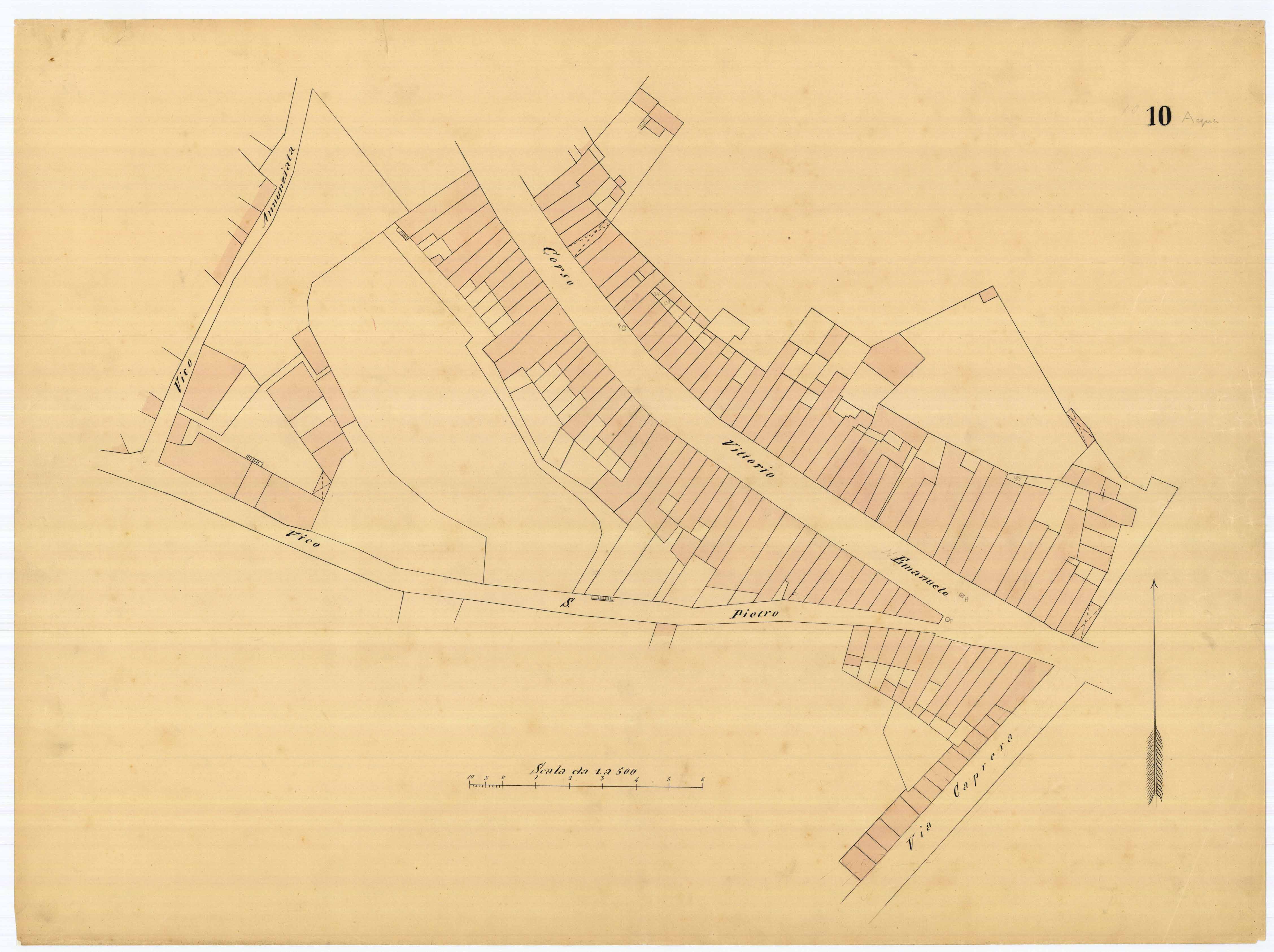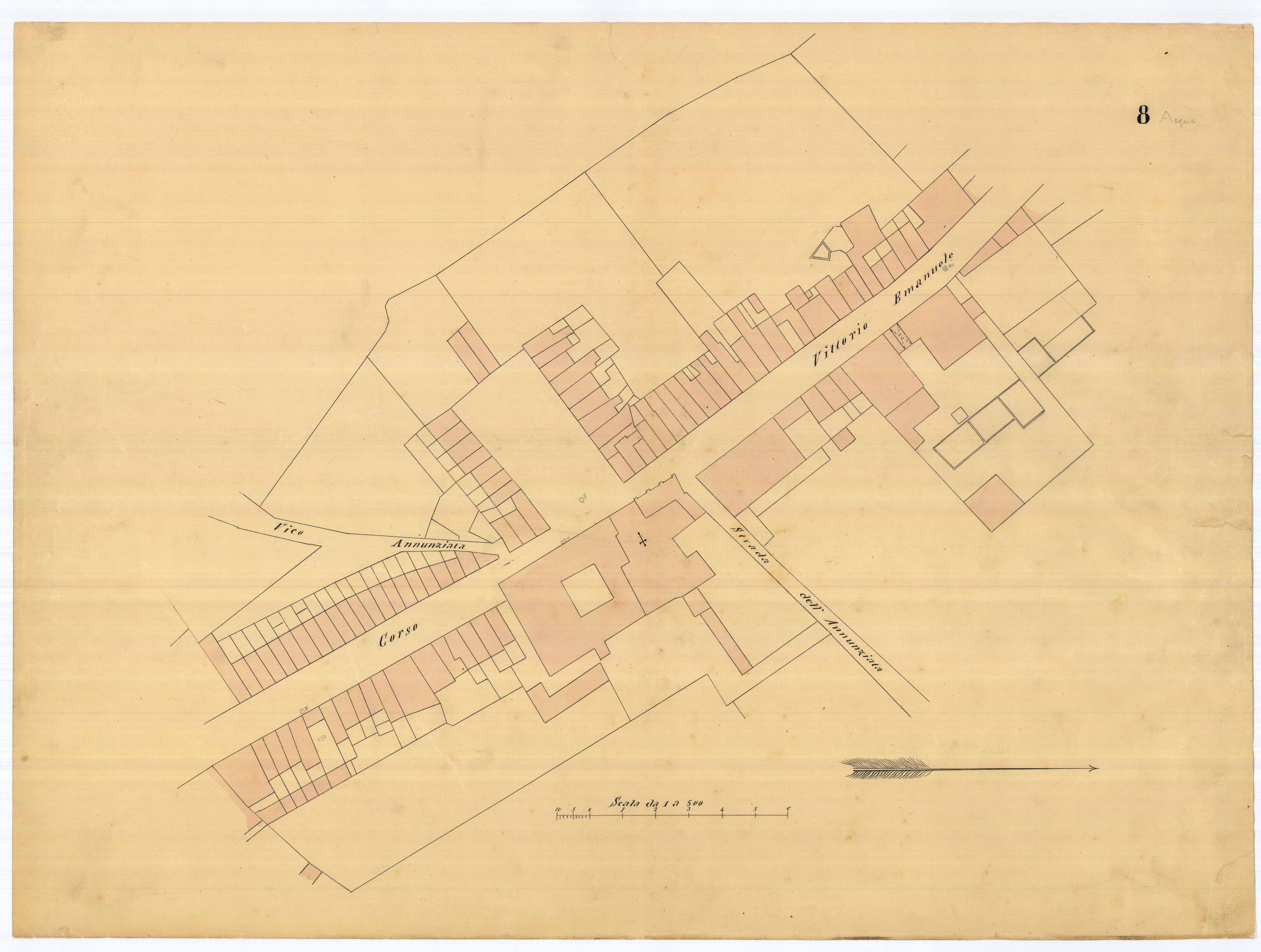 - La pianta comprende l'area estesa tra via roma, vico Circonvallazine (attuale via Concezione), via Cavour, via Darsena (attuale via Porcile)