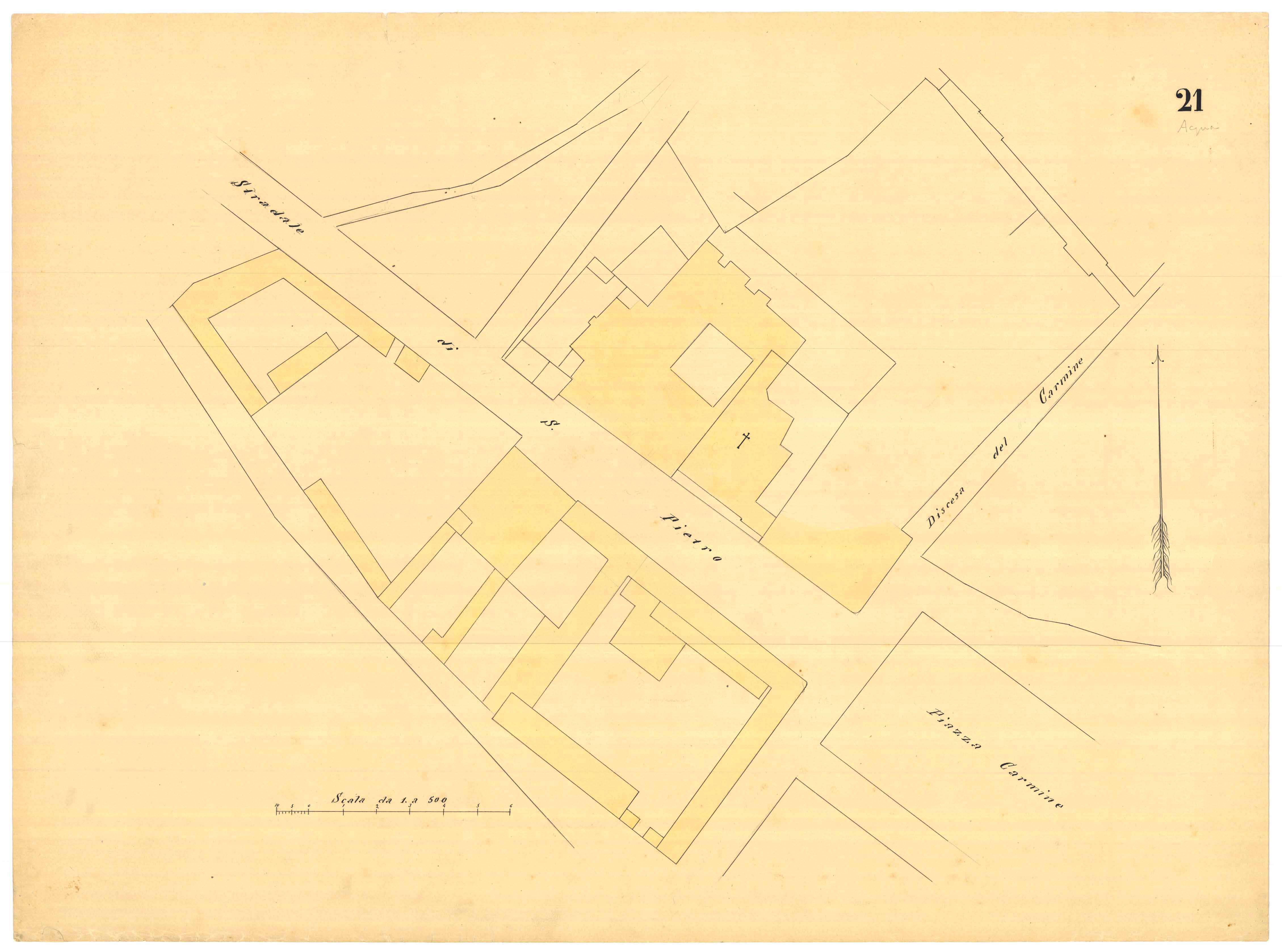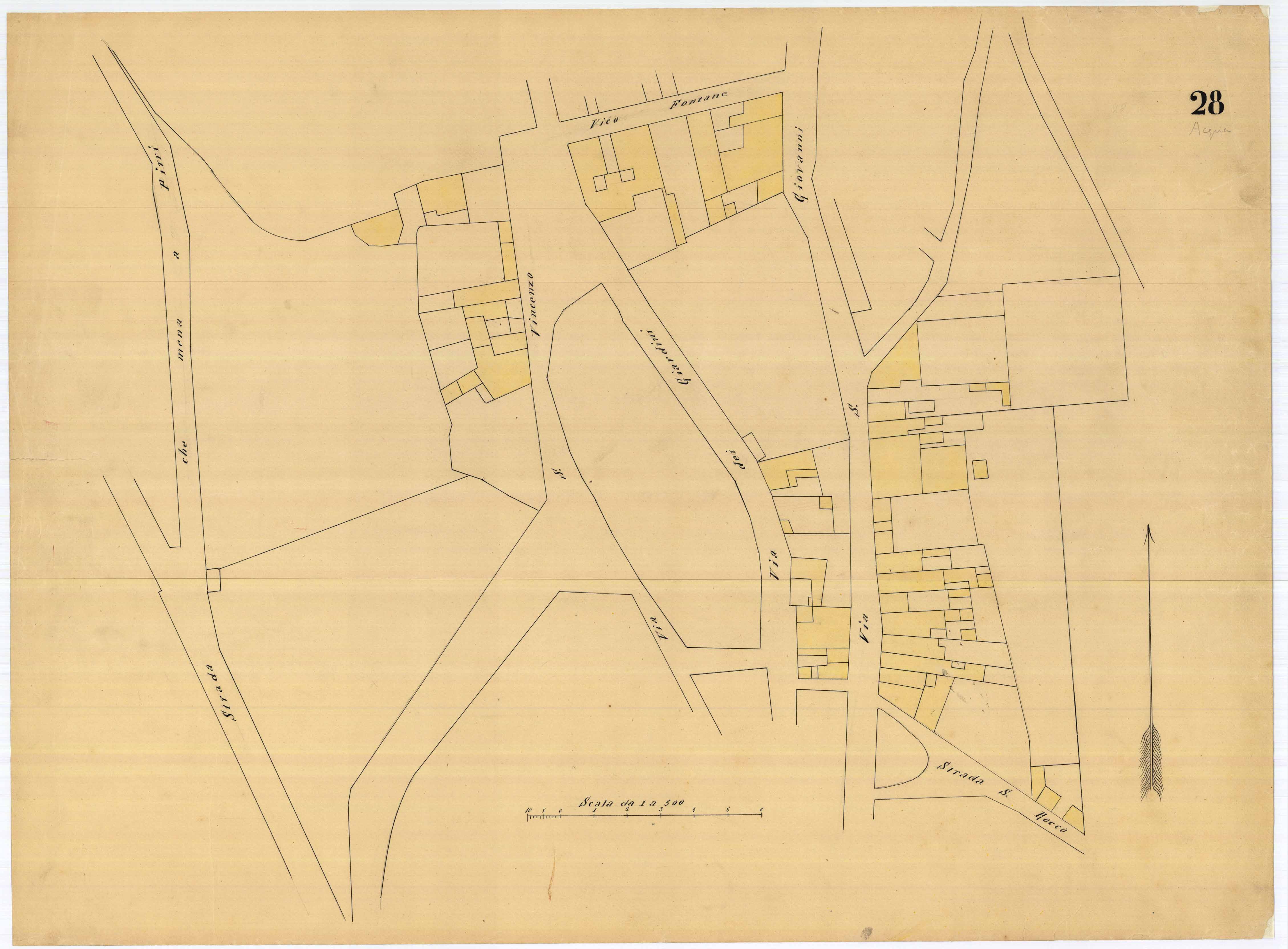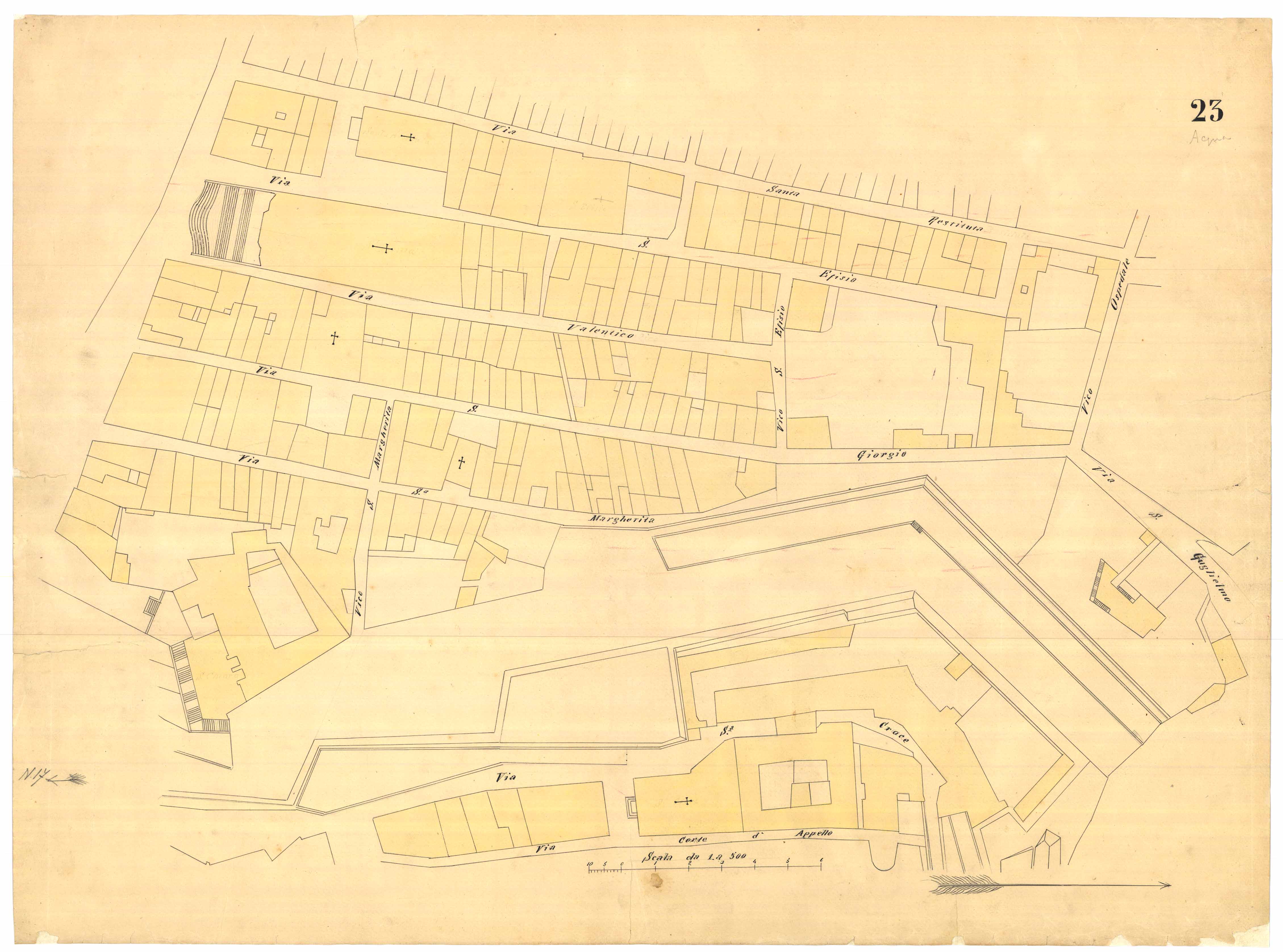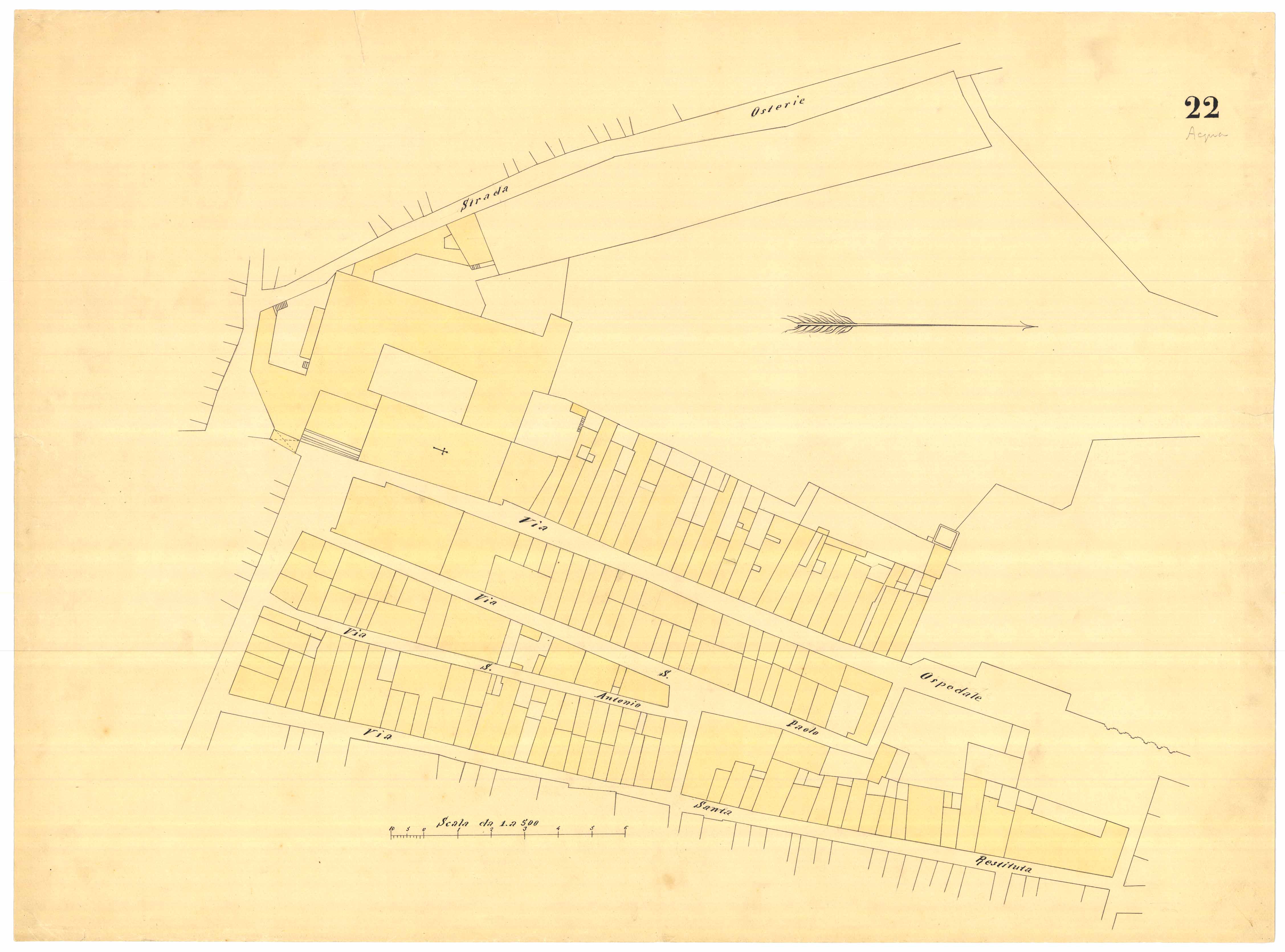 - La pianta comprende l'area estesa tra via roma, vico Circonvallazine (attuale via Concezione), via Cavour, via Darsena (attuale via Porcile)
