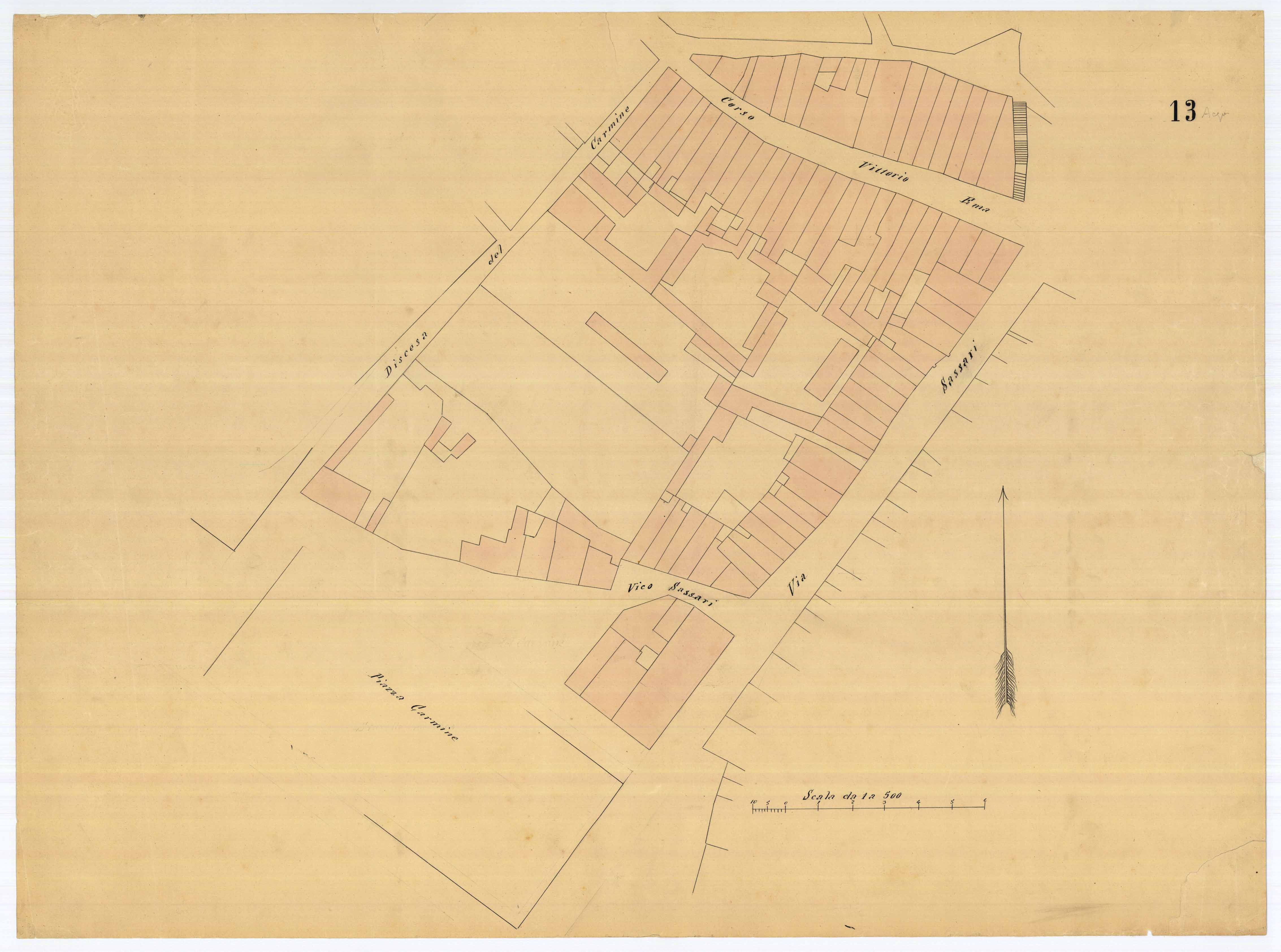 - La pianta comprende l'area estesa tra via la Muraglia (attuale via Iglesias), via Panattare ( atuale via Oristano), via Garibaldi, vico del Campo (attuale via Alghero) e via degli Orti (attuale via S. Satta).
