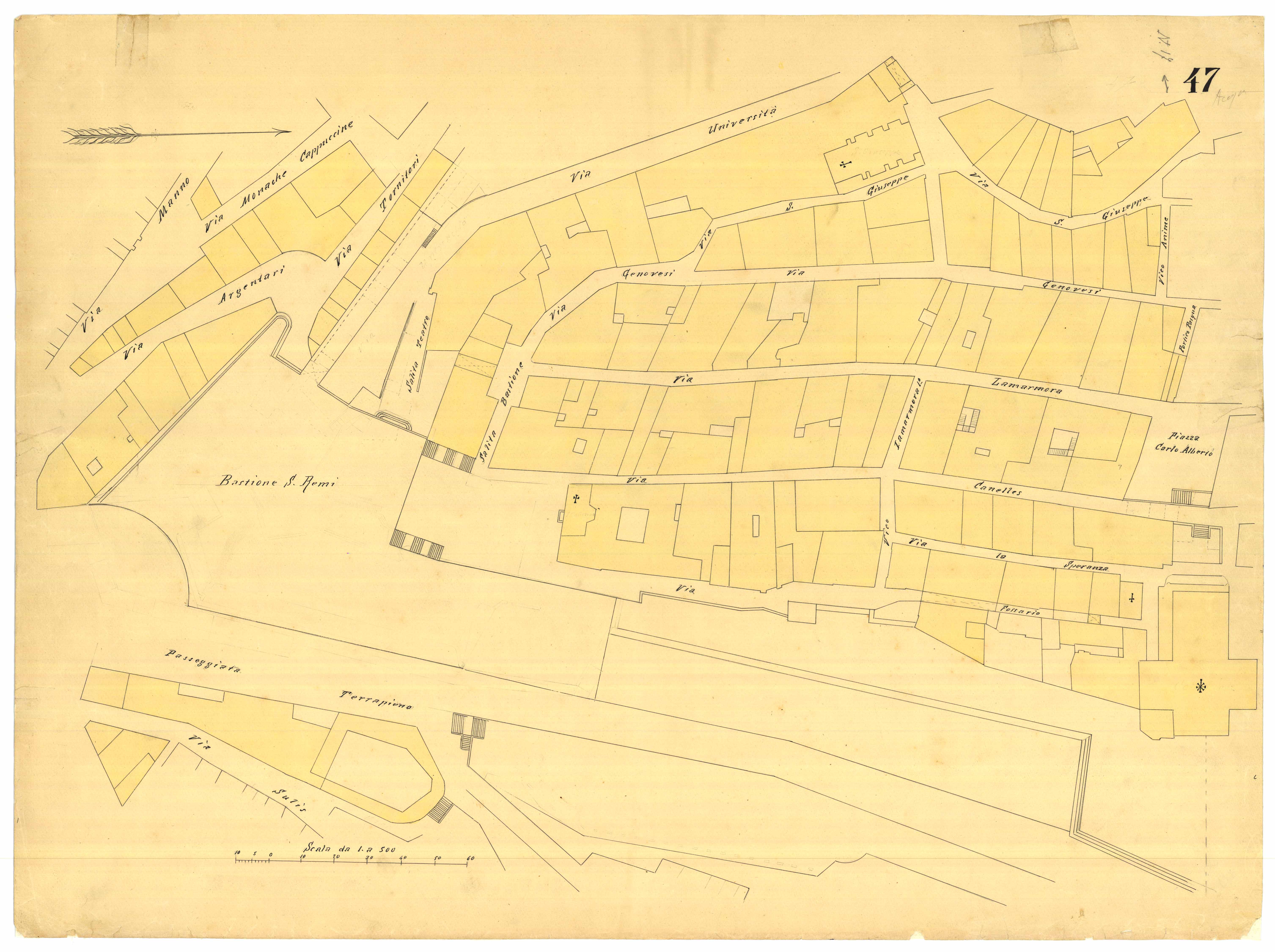- La pianta comprende l'area estesa tra via Cavour, vico Collegio (attuale via Collegio), via Manno, via Umberto I (attuale viale Regina Margherita)