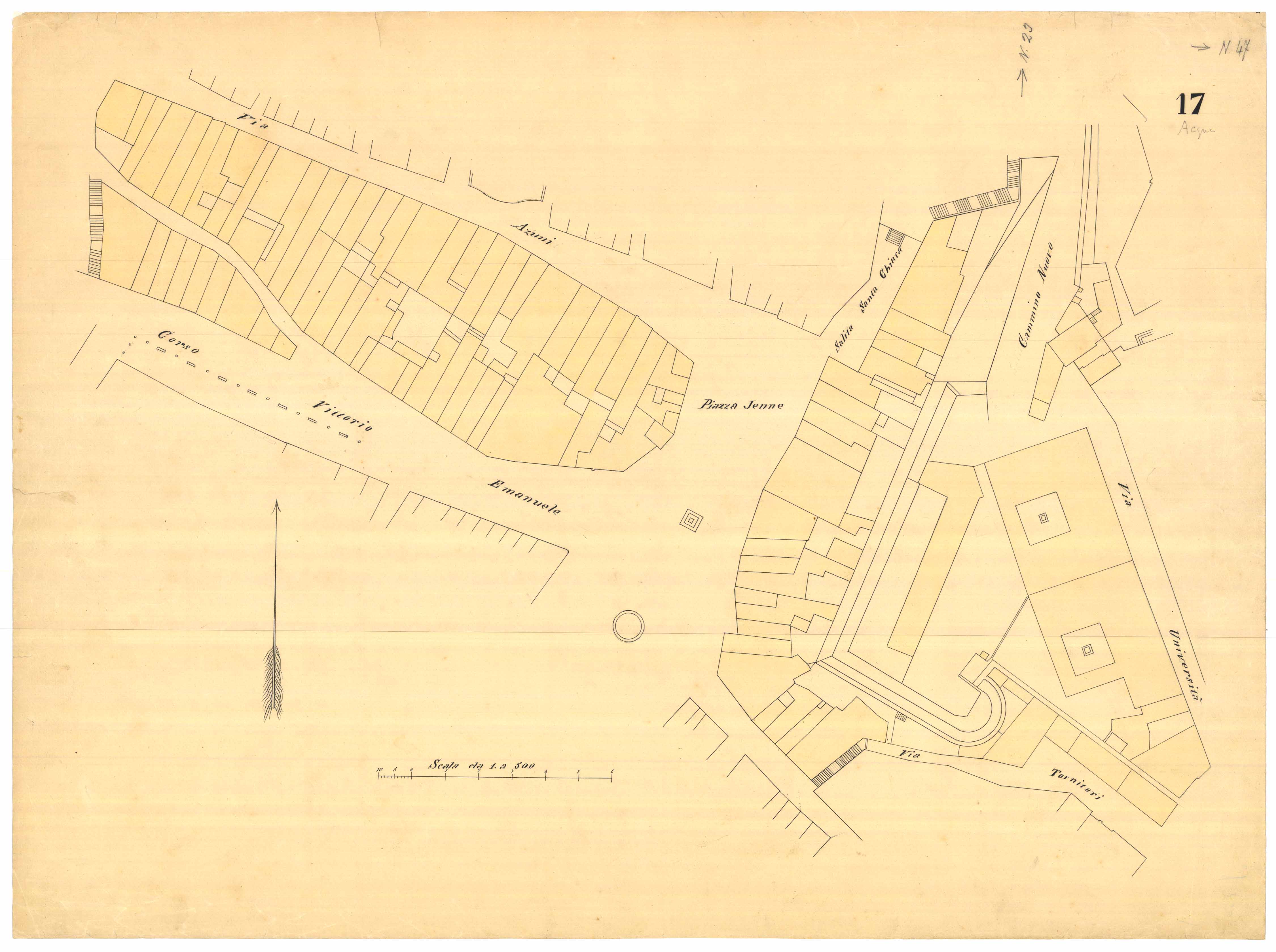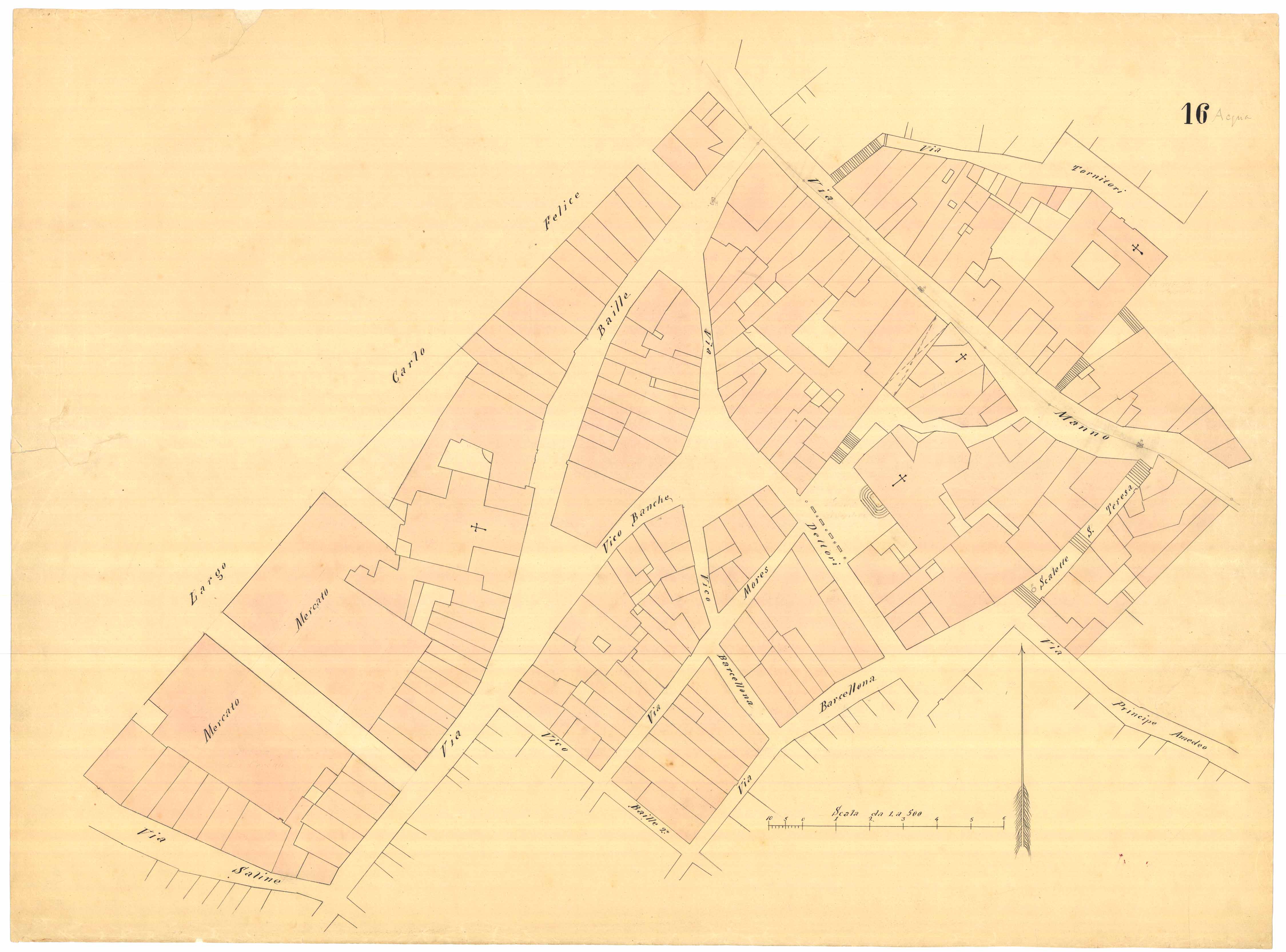 - La pianta comprende l'area estesa tra via Manno, via Monache Cappuccine e via Tornitori (attuale via Spano), con parte del quartiere Castello.