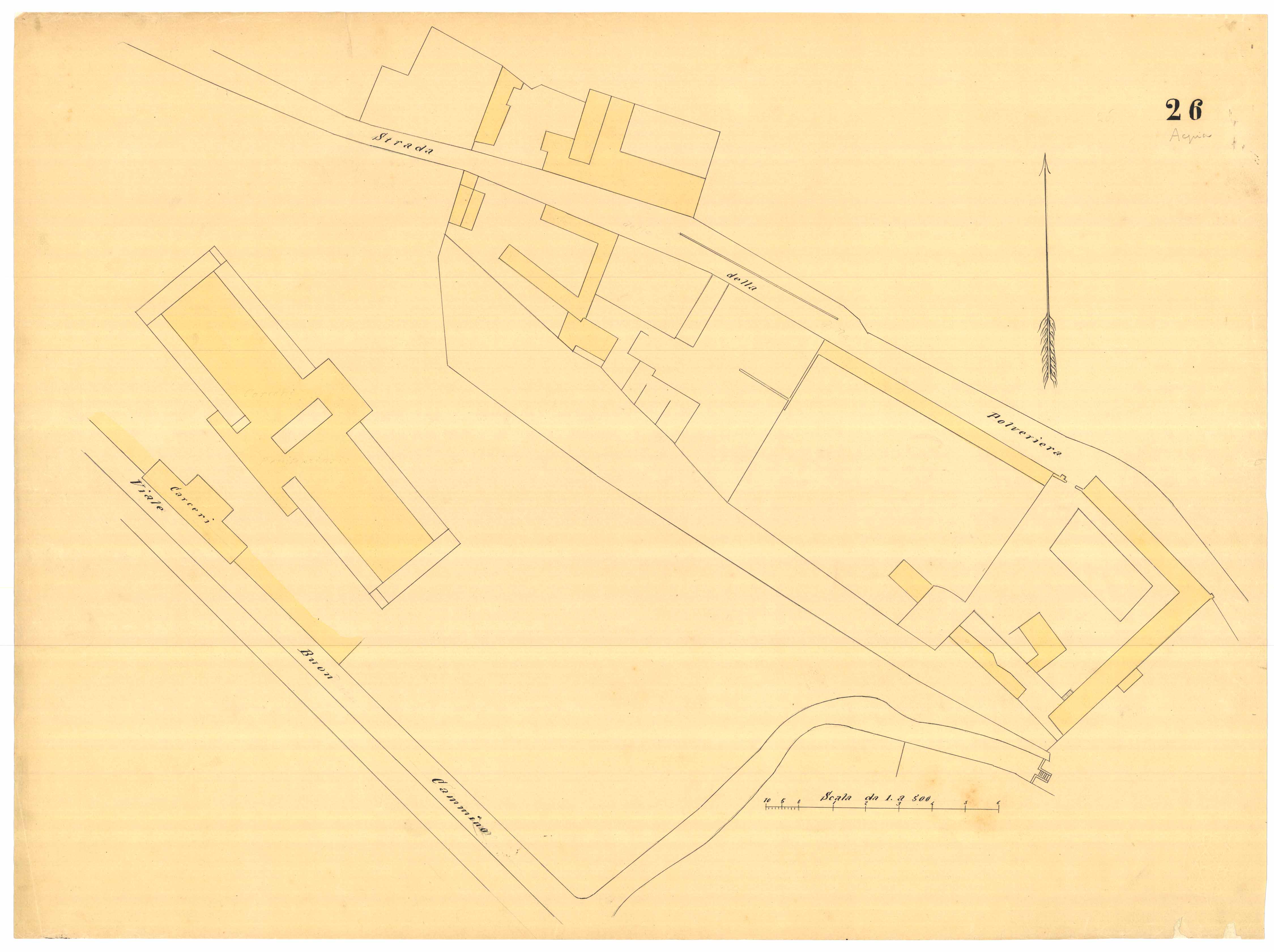 - La pianta comprende l'area estesa tra via degli Orti (attuale via S. Satta), via Marsiglia (sic)(in realtà via Muraglia attuale via Iglesias), vico del Campo (attuale via Alghero).