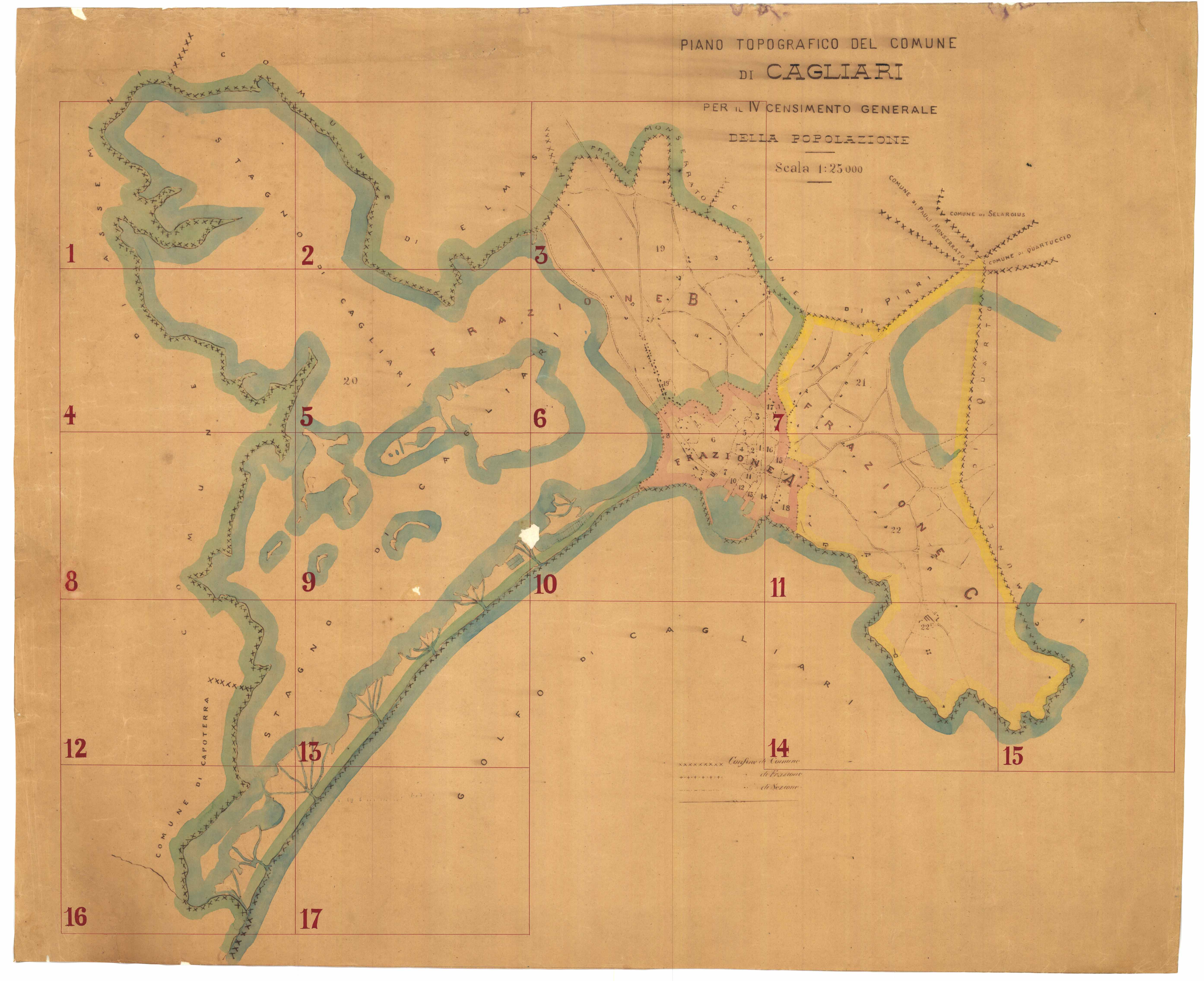 - Si tratta della pianta della città di cagliari con un cartiglio che contiene l'indicazione dei confini di comune , frazione e sezione..