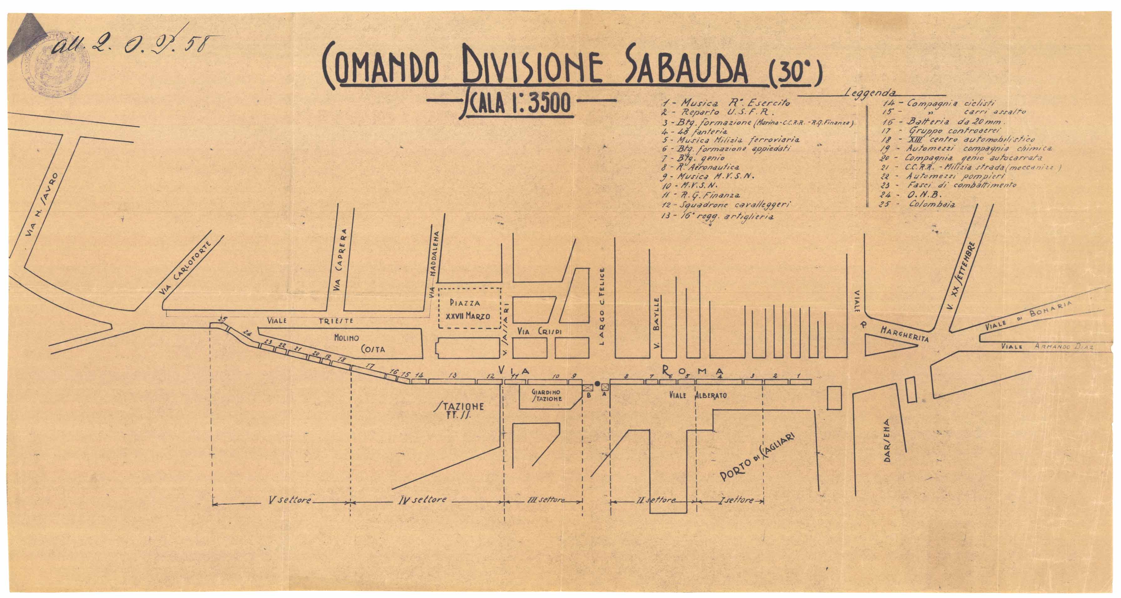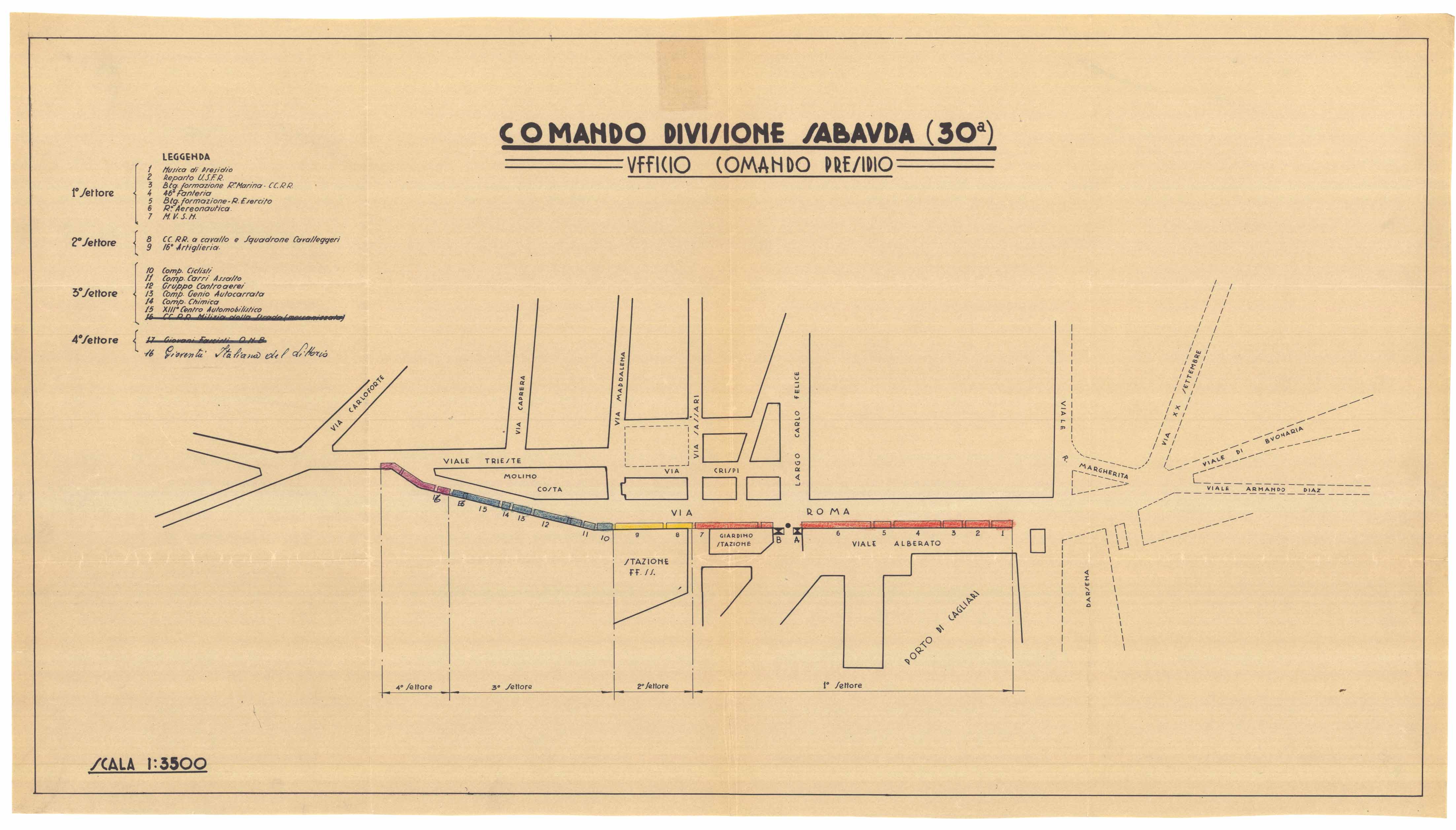 - Si tratta di una pianta dell'area compresa tra via Roma e le aree limitrofe realizzata per visualizzare le posizioni dei vari corpi in una parata militare, della quale viene fornita la legenda.