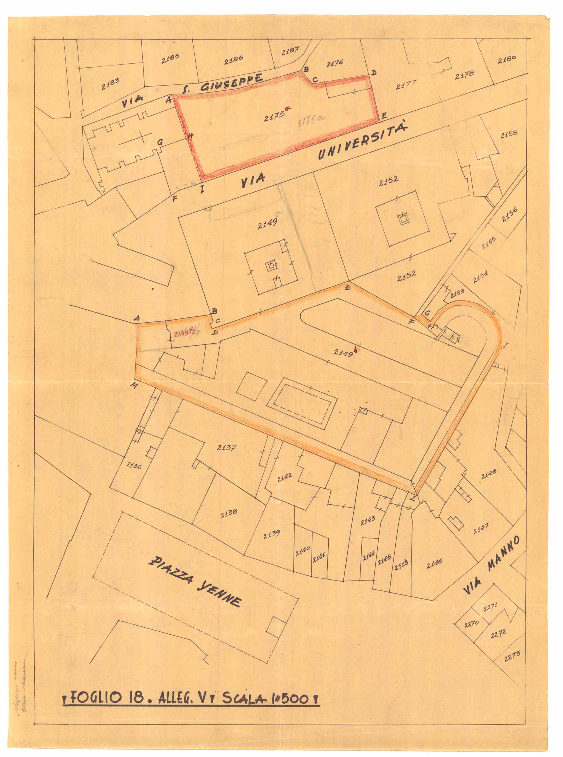 - Mappa catastale dell'area compresa tra via S. Giuseppe e piazza Yenne " Foglio 18- Alleg. V"