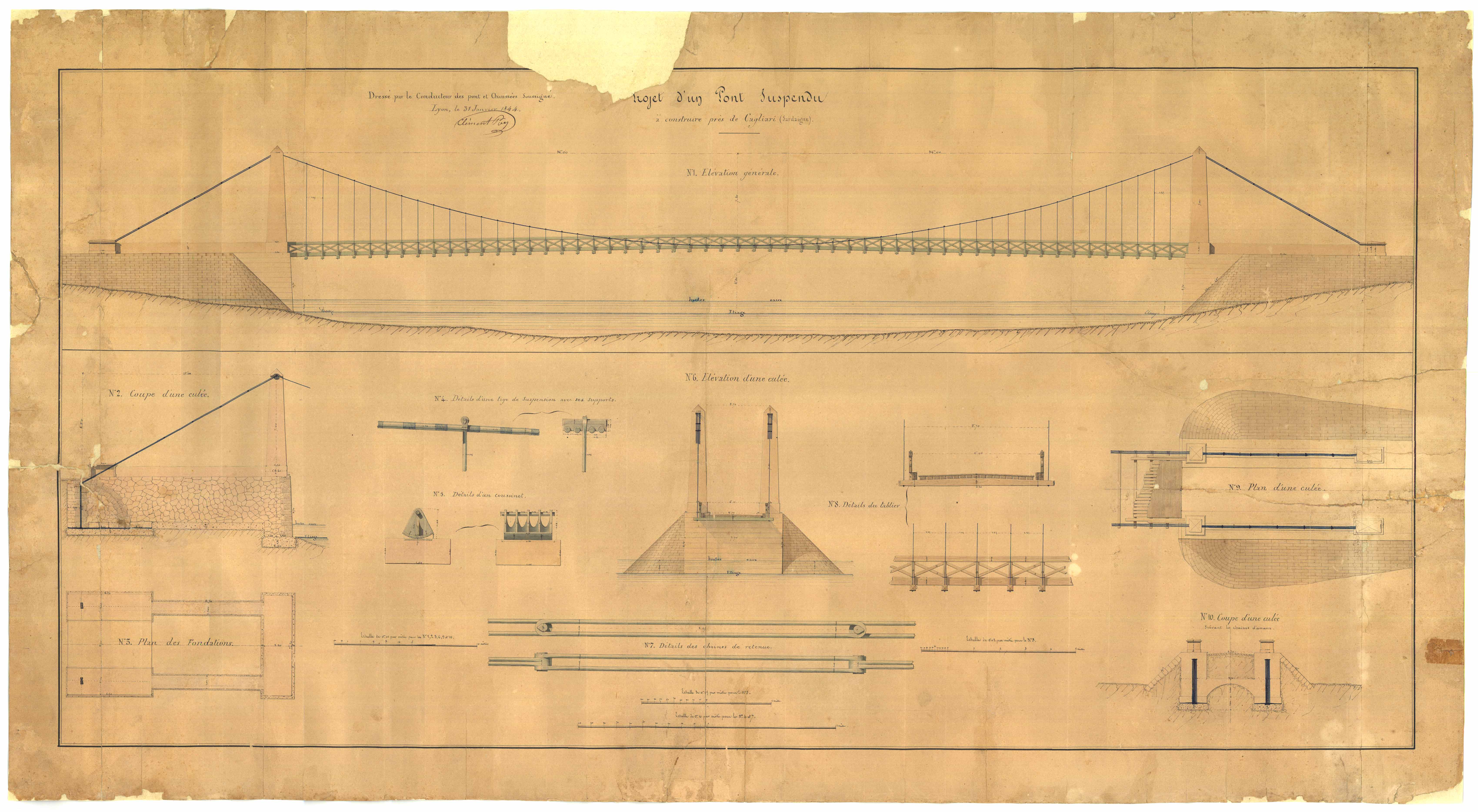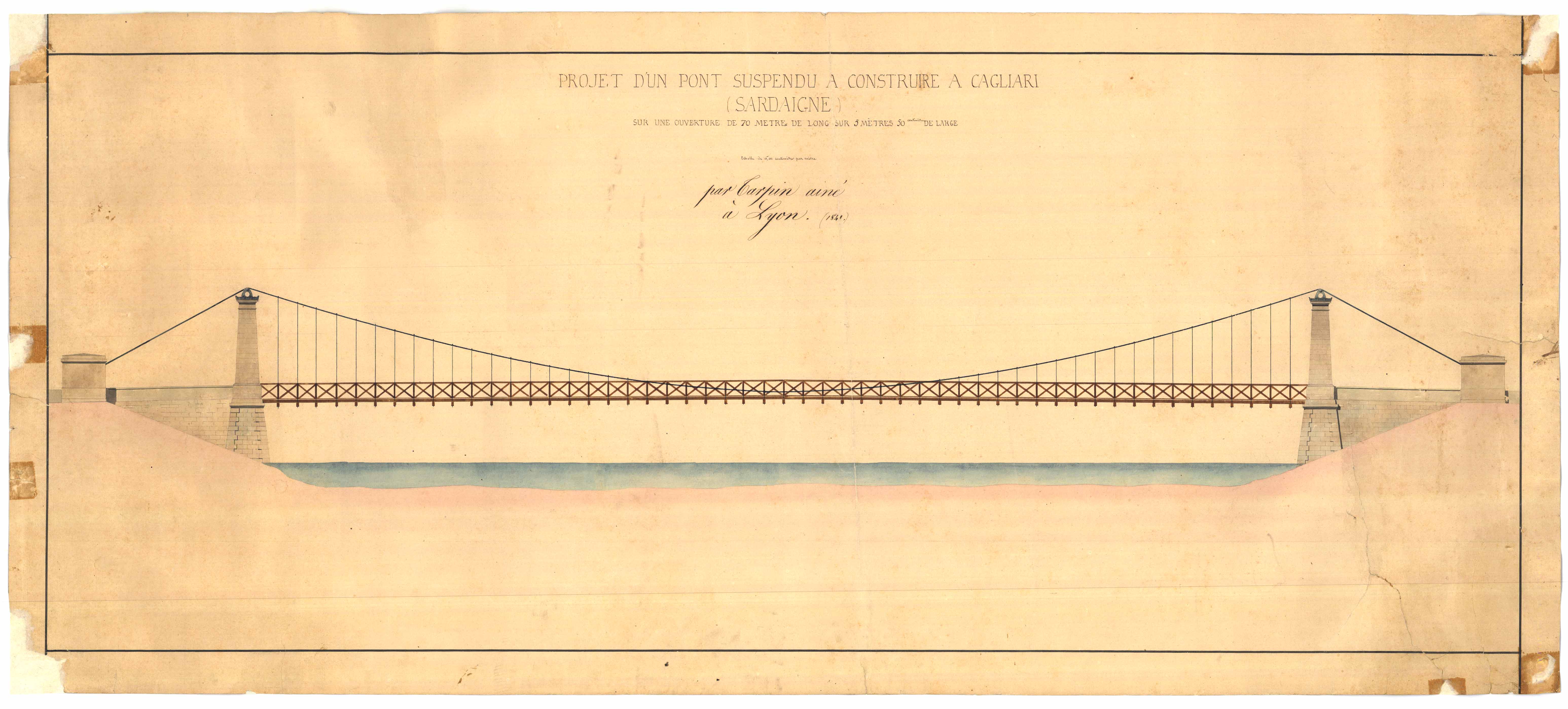 - Projet d'un pont suspendu a construire a cagliari (Sardaigne) sur une ouverture de 70 mètres de long sur 5 mètres, 50 centimètres de large