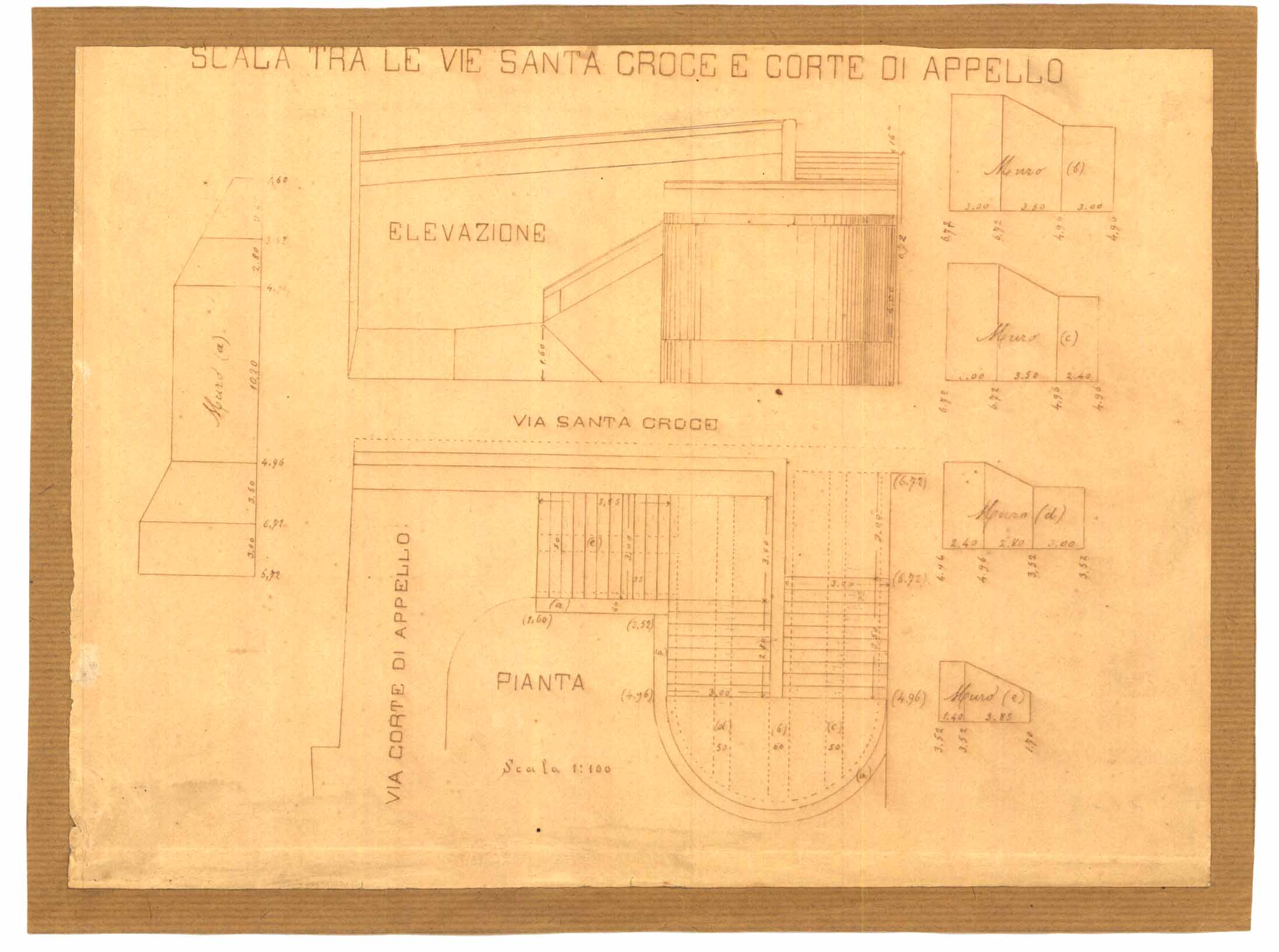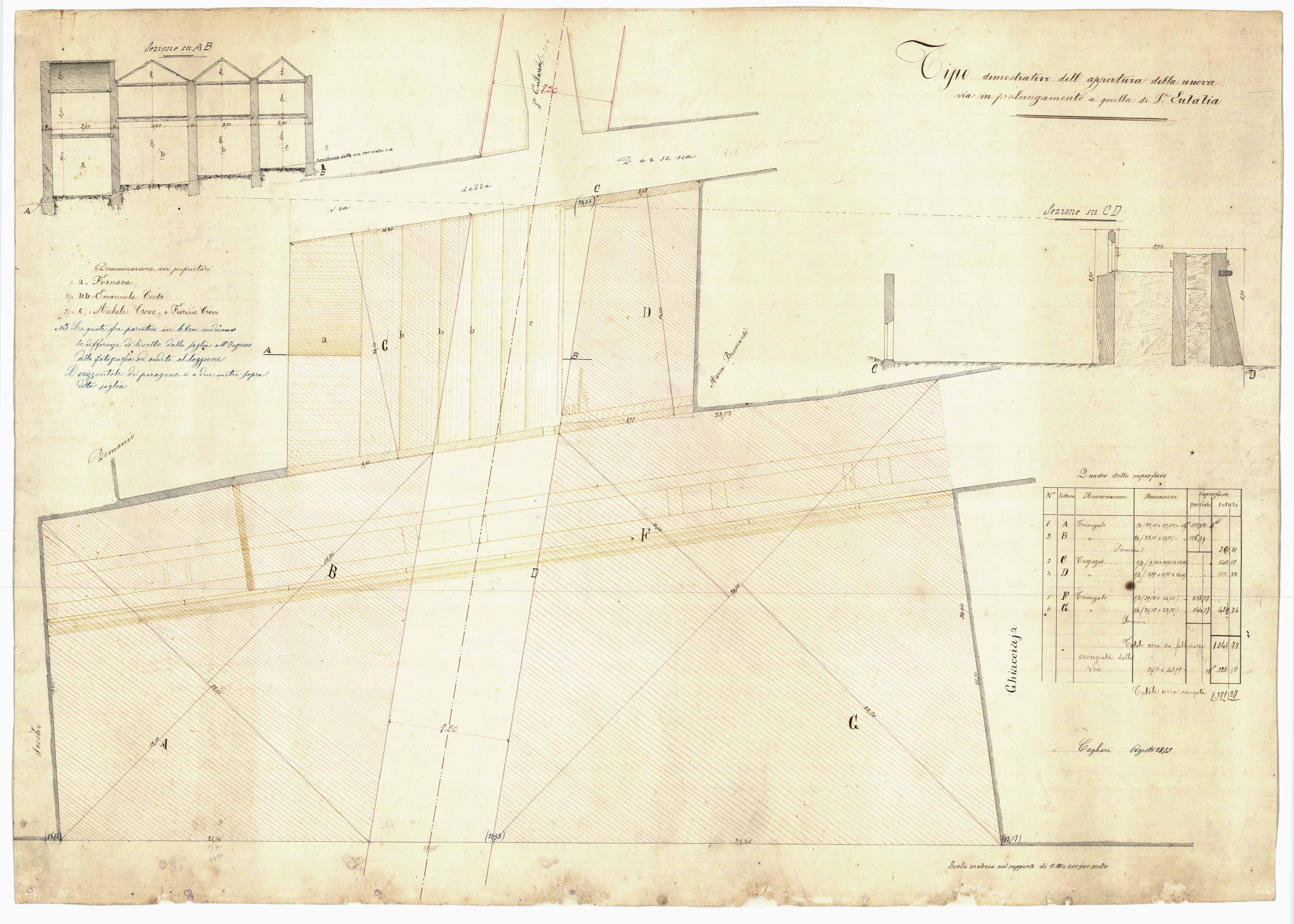 - Il disegno comprende le sezioni e la planimetria dell'area destinata all'apertura della via dei Pisani in prolungamento di via S. Eulalia nel quartiere della Marina.
