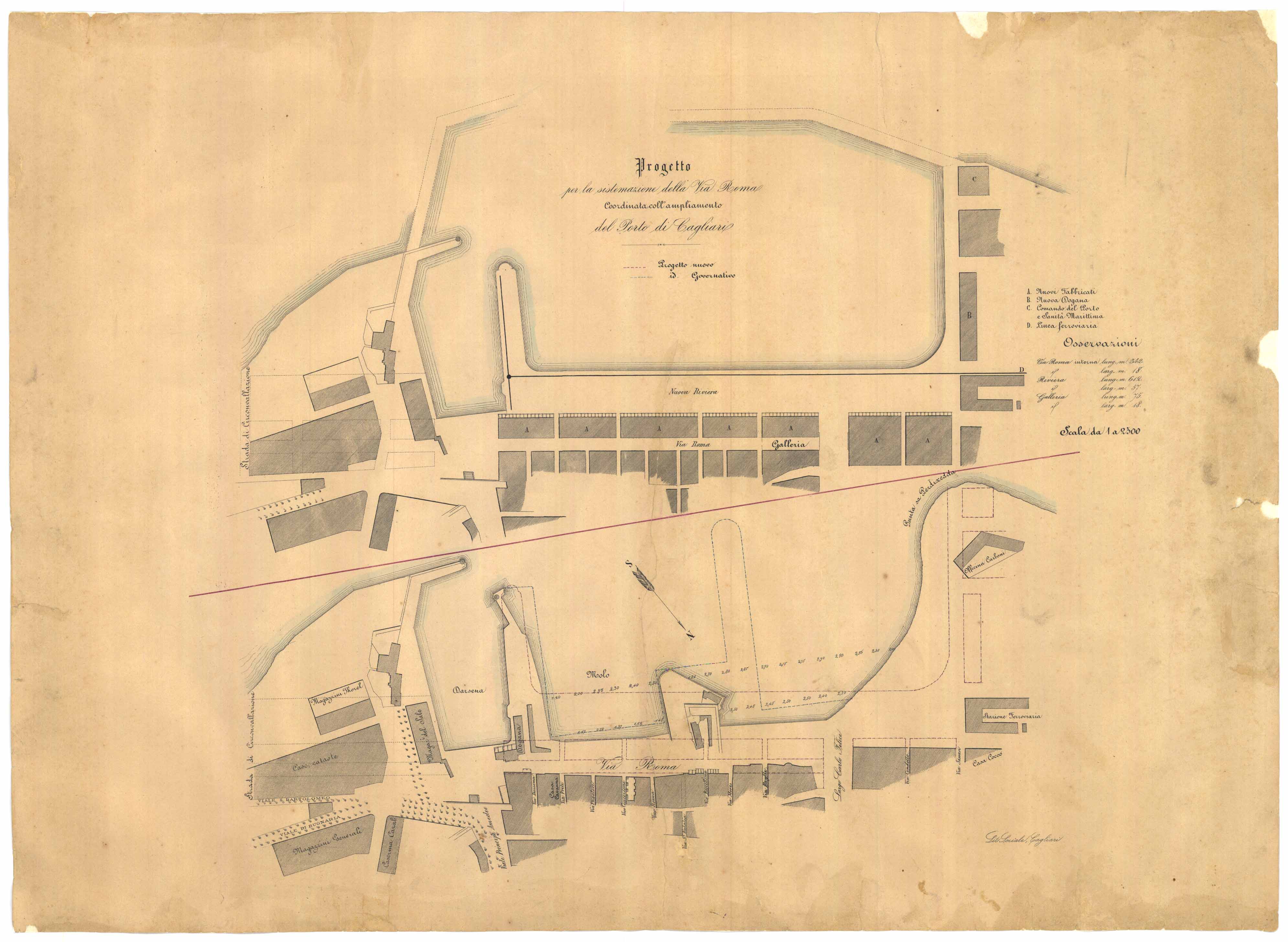 - Nella tavola è rappresentato il progetto di sistemazione urbanistica di Marina e Stampace basso, utilizzando una stampa predisposta dalla società dell'acquedotto di Cagliari del 13 dicembre 1869.