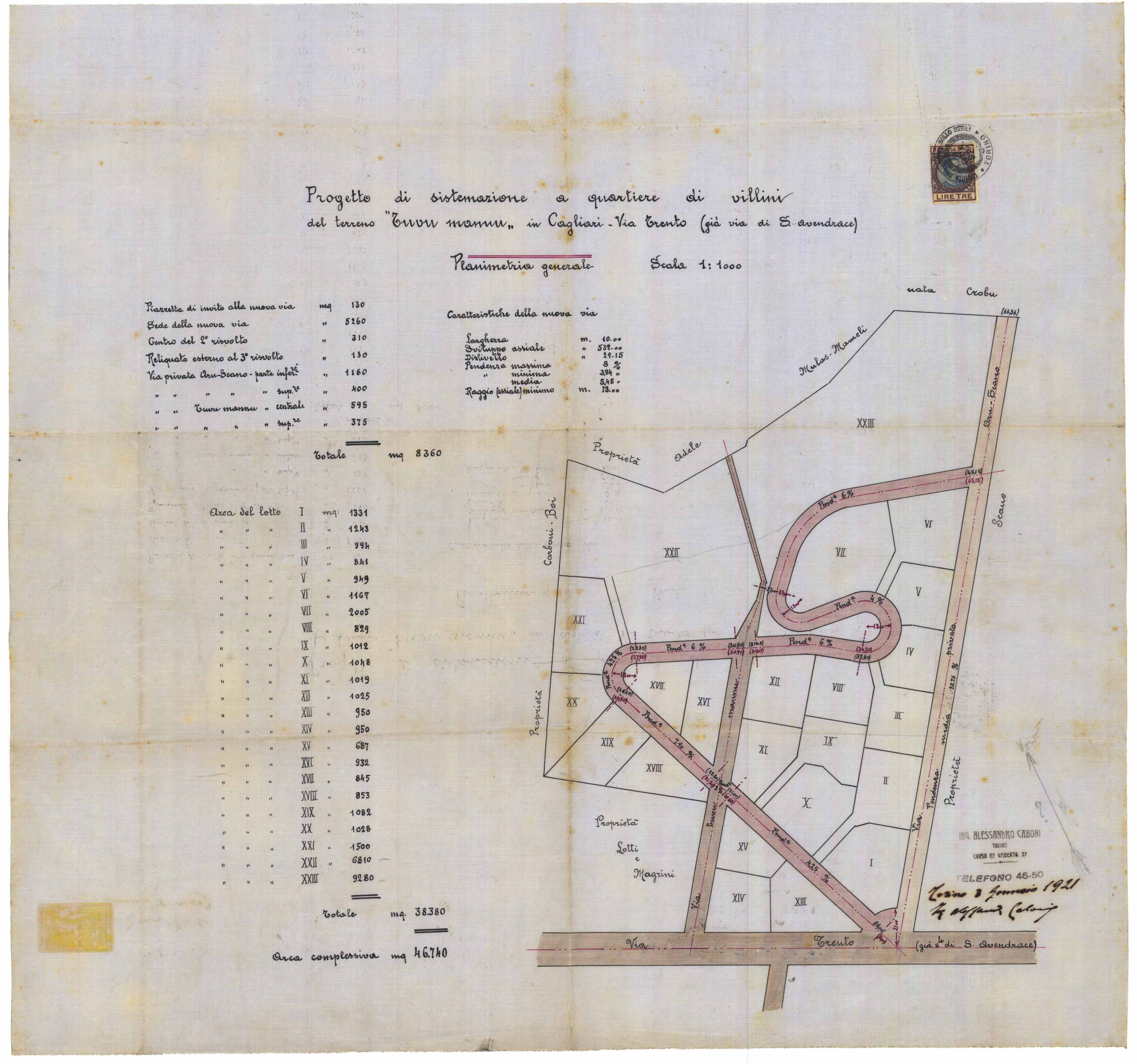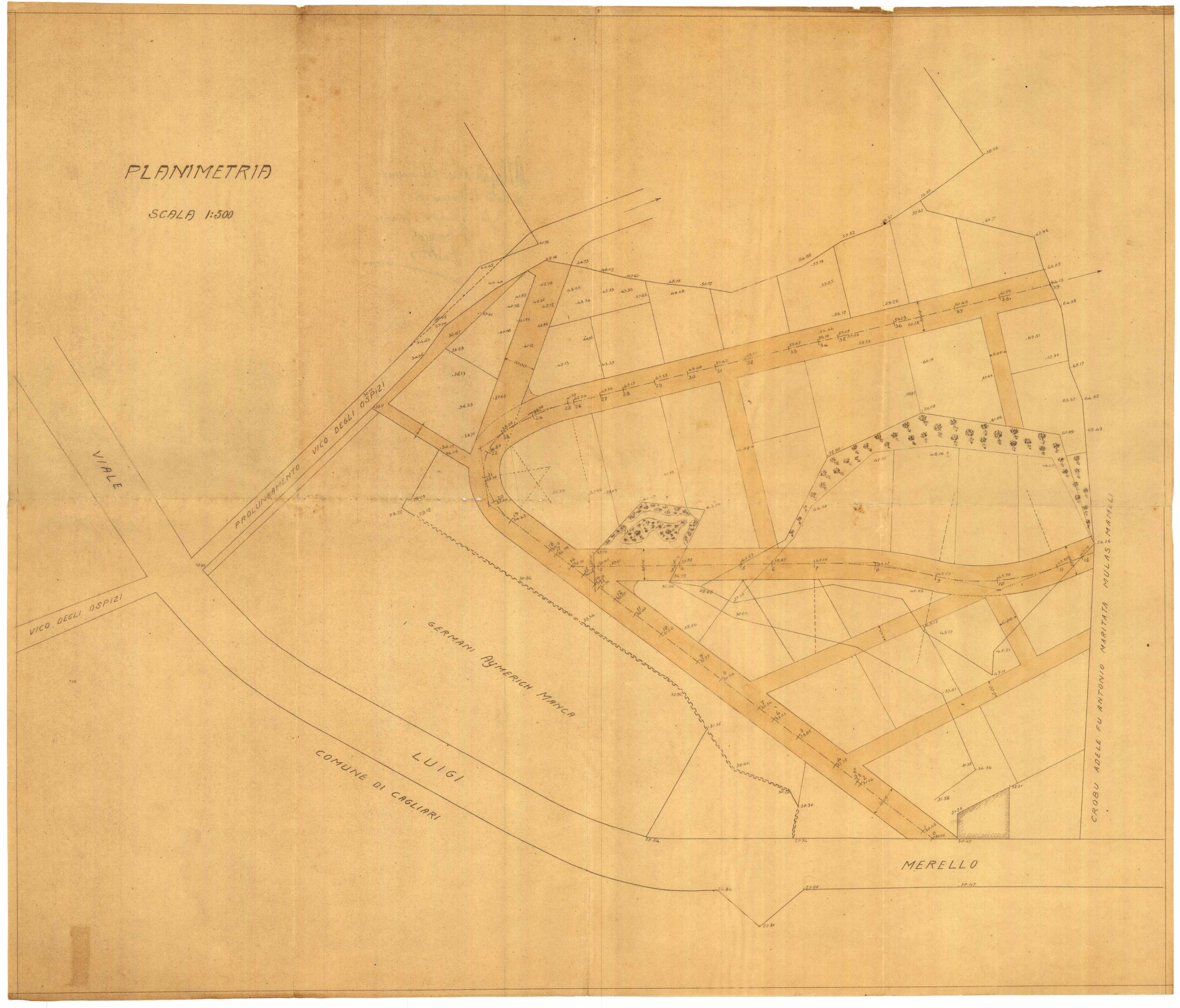 - Il progetto per sistemare il viale Merello con l'apertura di nuove strade. nel retro della tavola è riportata la seguente nota: "alegato alla deliberazione in data 1 giugno 1923 per la cooperativa Karalis"