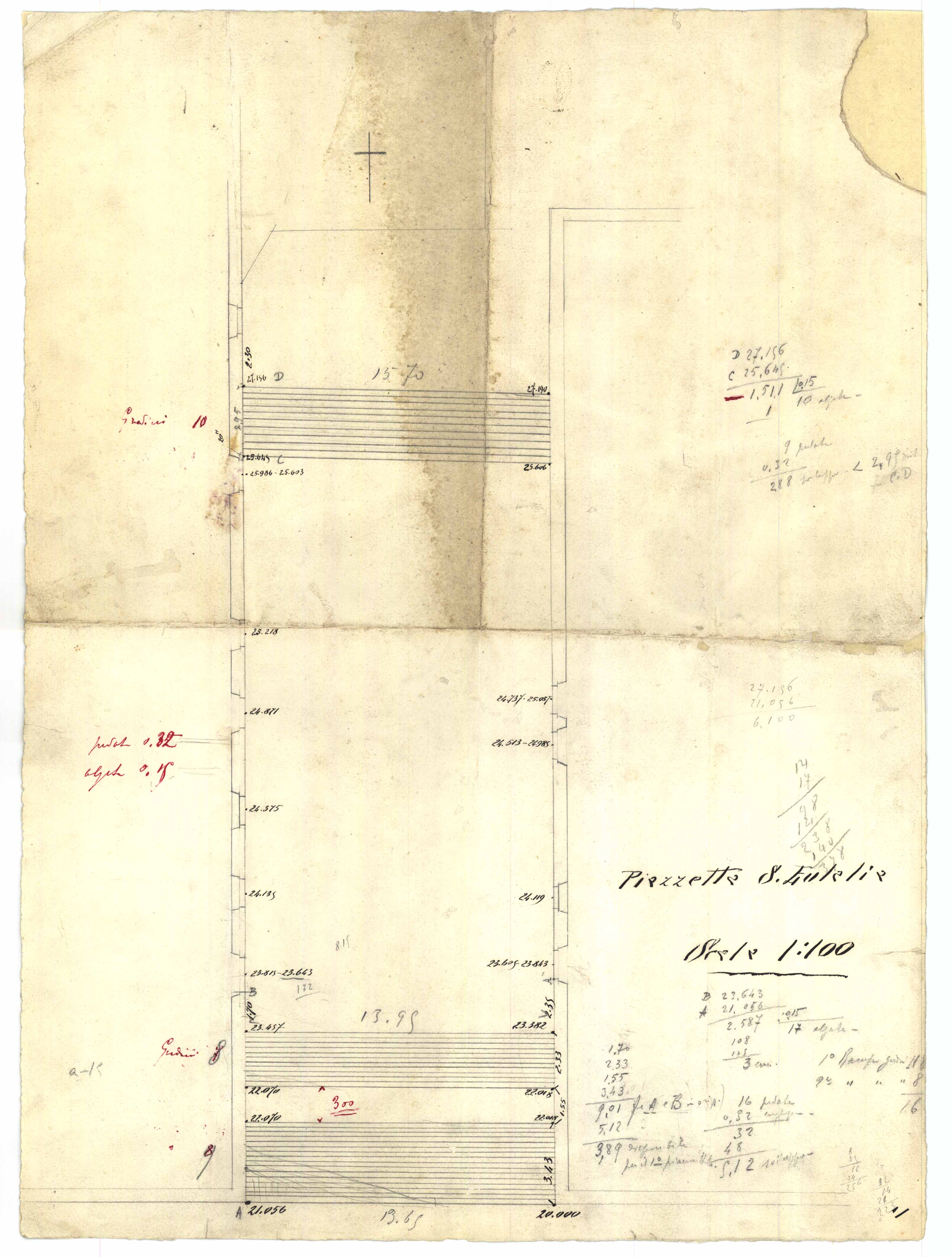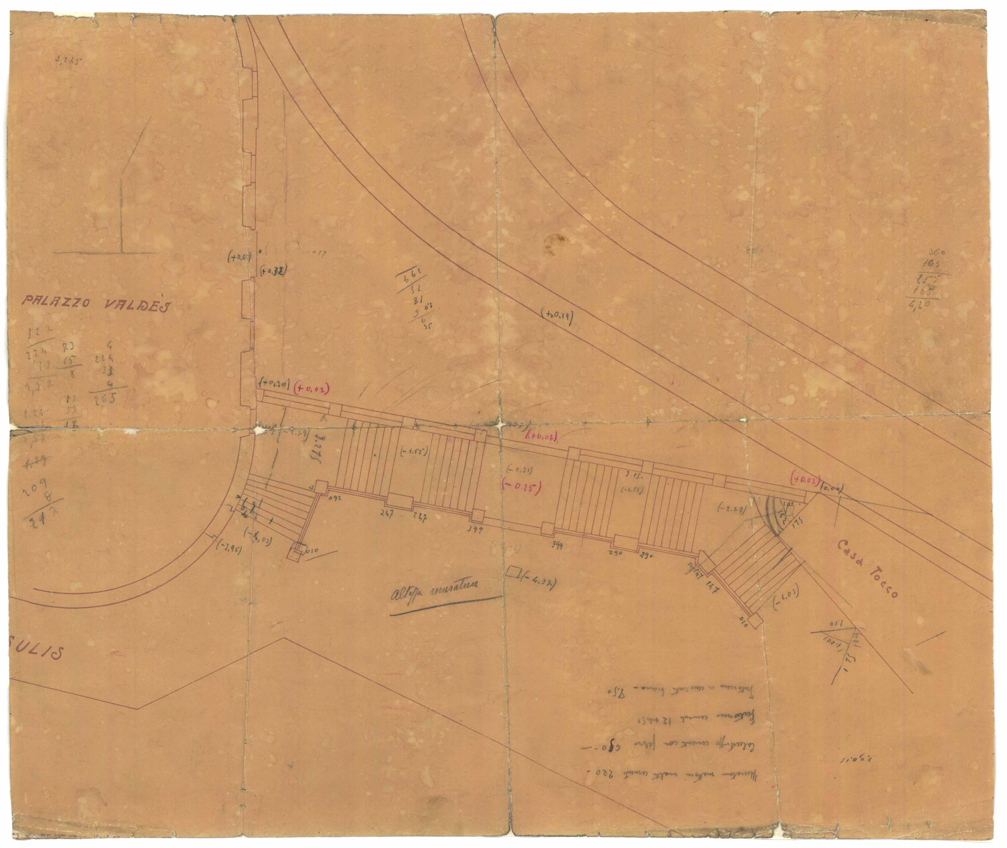 - Piano di sistemazione del'area delle scalette di piazza Marghinotti-via S. Giovanni. Sono annotati a matita le misure e le quantitàdei materiali occorrenti per la realizzazione.