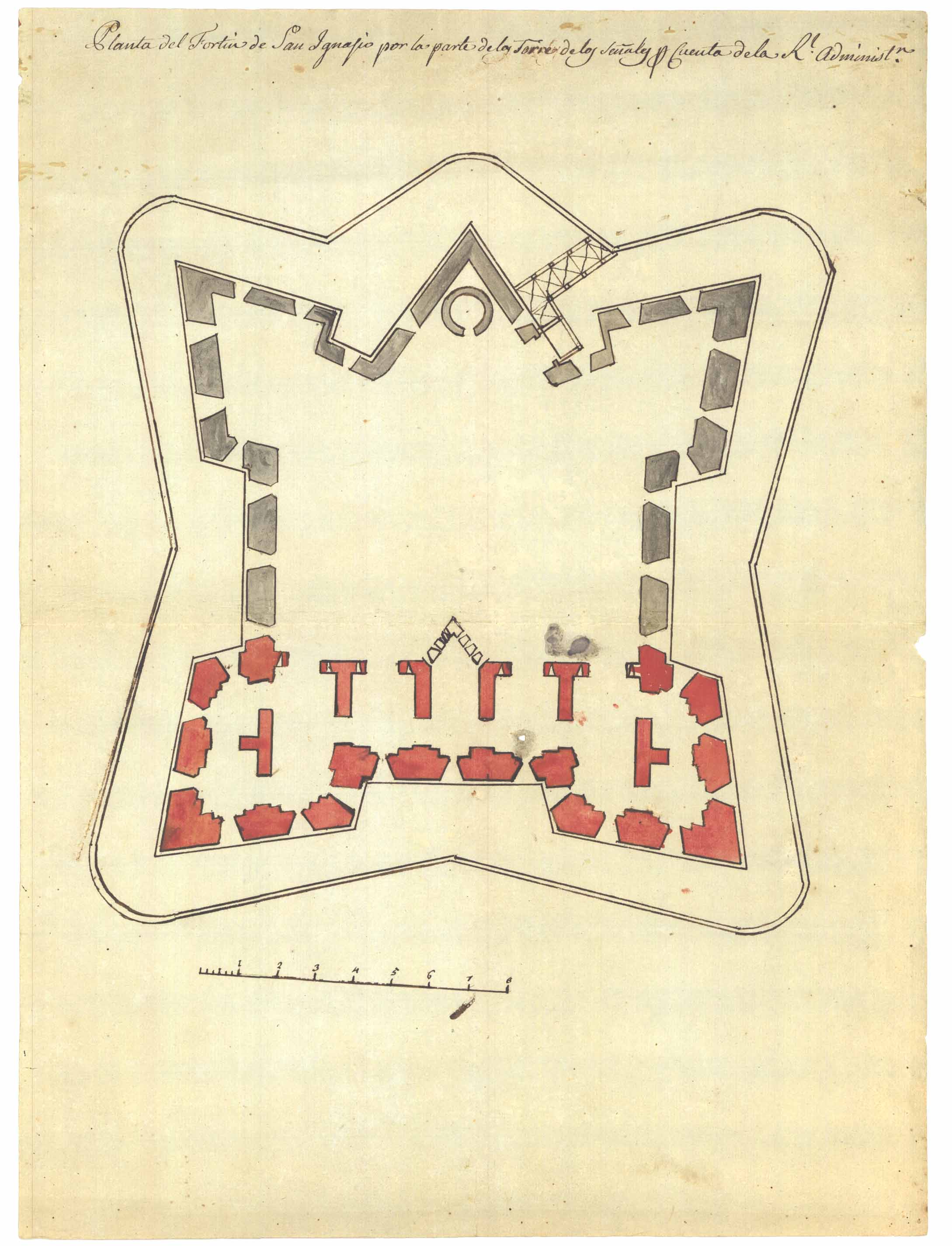 Sezione F: Strutture monumentali e fortificazioni.- Planta del fortin de san ignazio por la parte de las torre de los senal per cuenta da la R. Administ.n