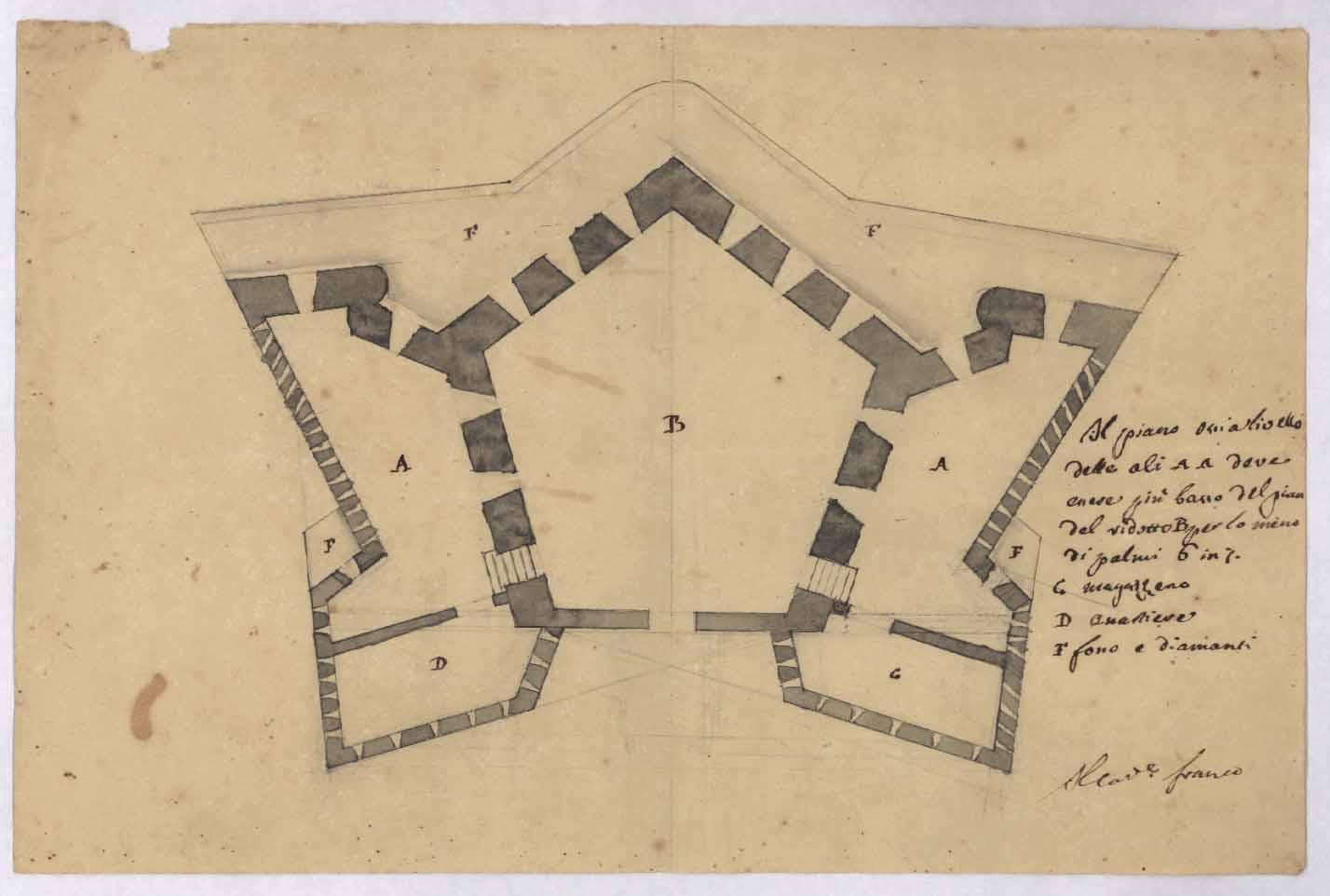 - Progetto con la pianta del fortino di Sant'Ignazioe a margine le annotazioni per l'esecuzione dei lavori .
