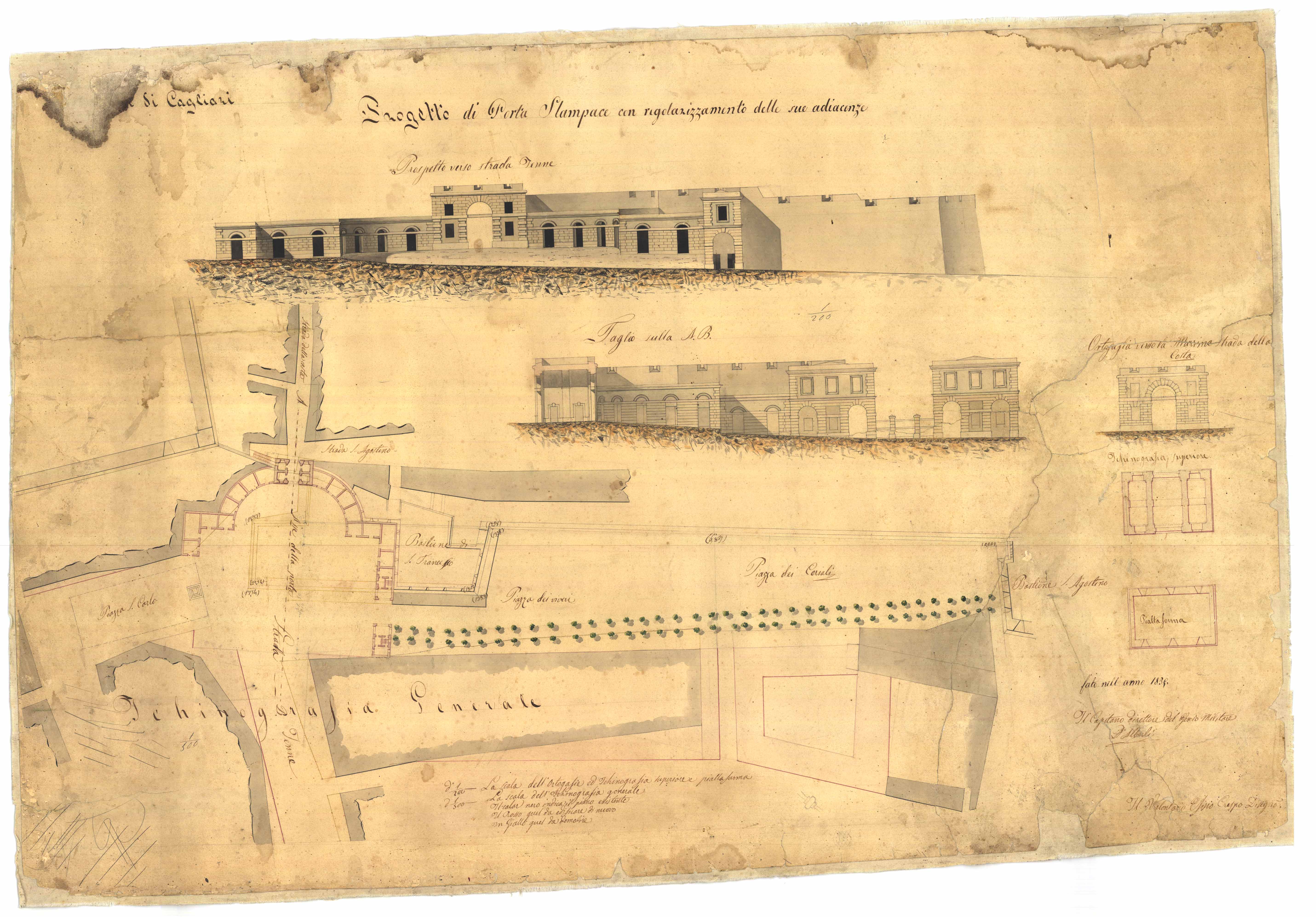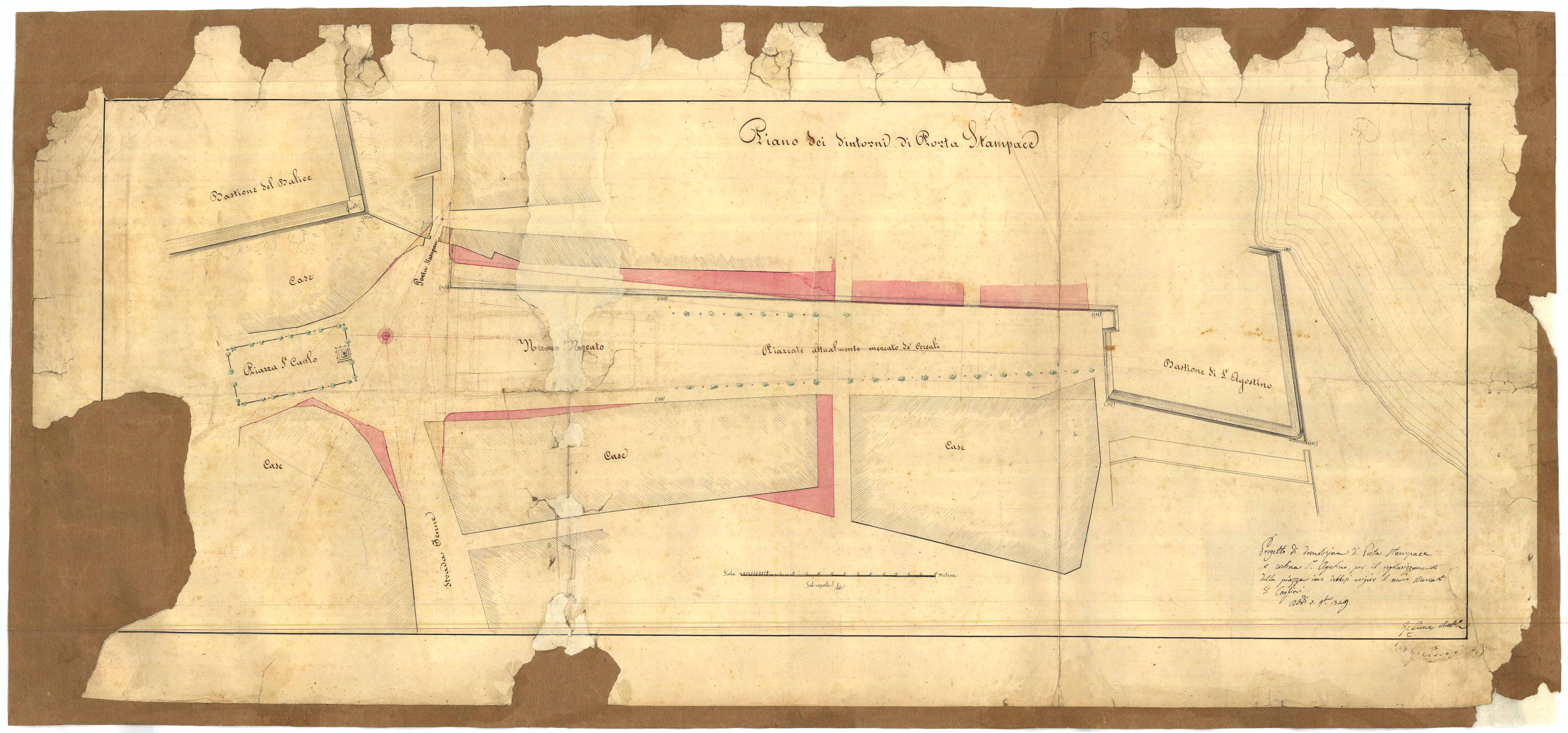 - Progetto per la regolazione del piano urbanistico realizzato dal Cima, che prevedeva, come troviamo a margine, la demolizione della Porta Stampace e della cortina S. Agostino per il regolarizzamento della piazza dove doveva erigersi il nuovo mercato di Cagliari.