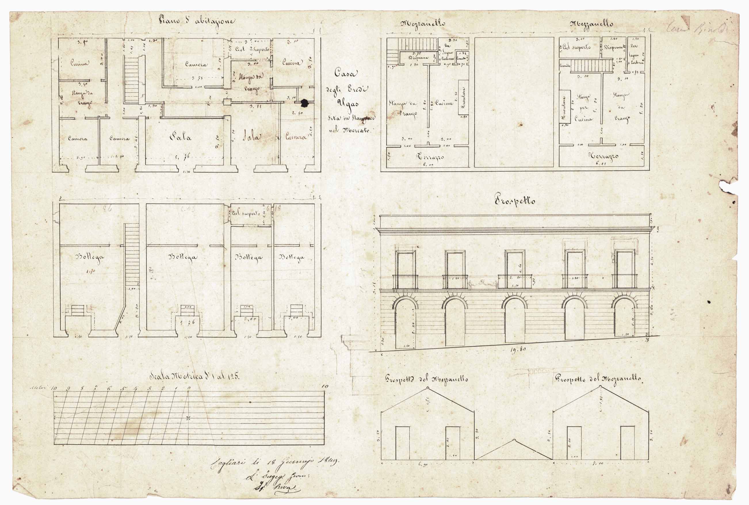 - Disegno dei vari prospetti e delle planimetrie dei tre livelli, che costituiscono la casa abitativa degli eredi Ugas.