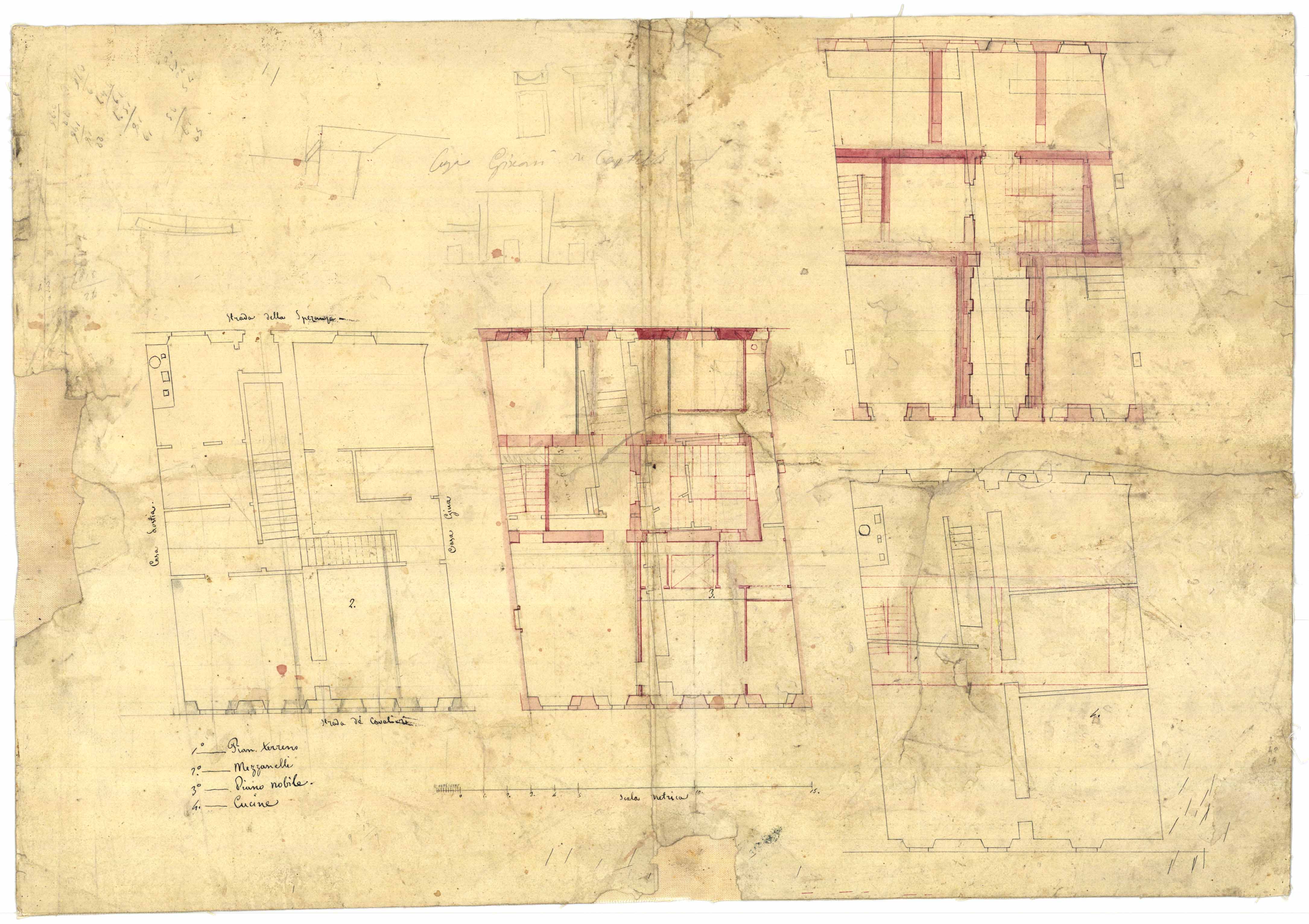 - Disegno progettuale in prospetto, in sezione e in pianta del pino terreno e del piano alto delle case civili da costruirsi sotto gli spalti del terrapieno.