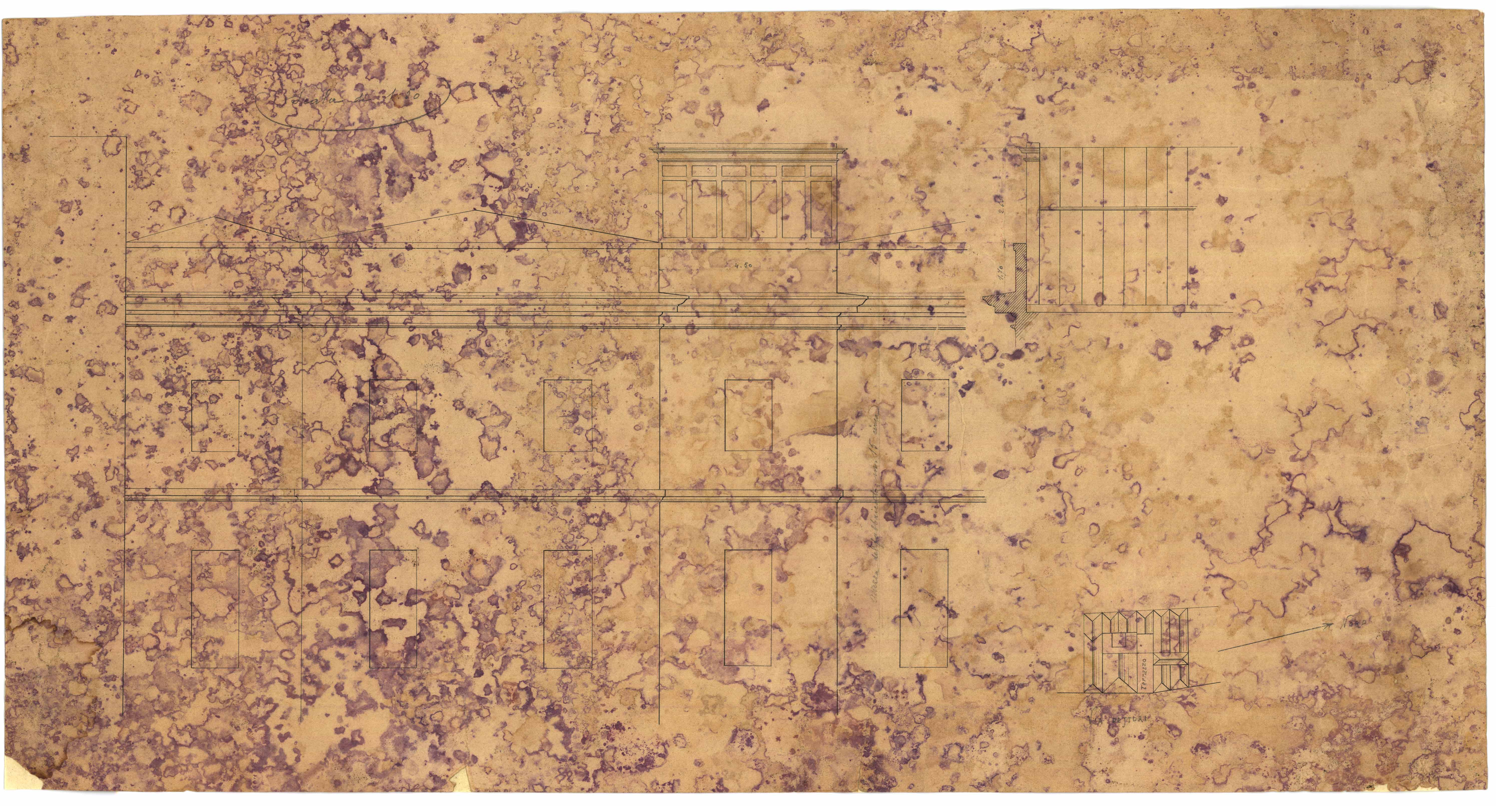 - Disegno del prospetto, della pianta, della vista esterna della testata di levante e della sezione trasversale di una galleria sulla via Dettori.