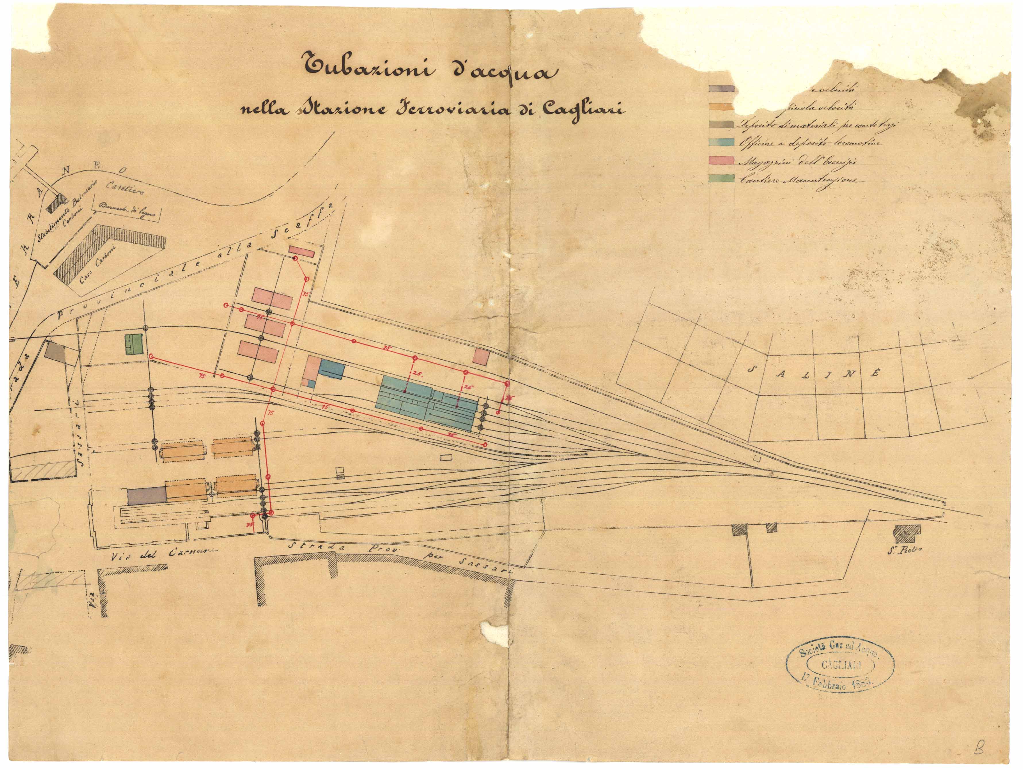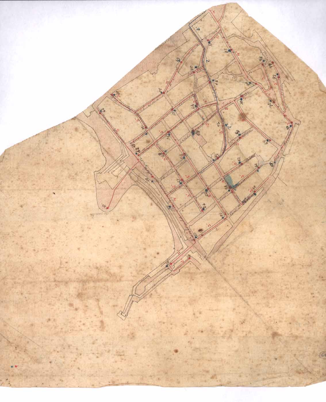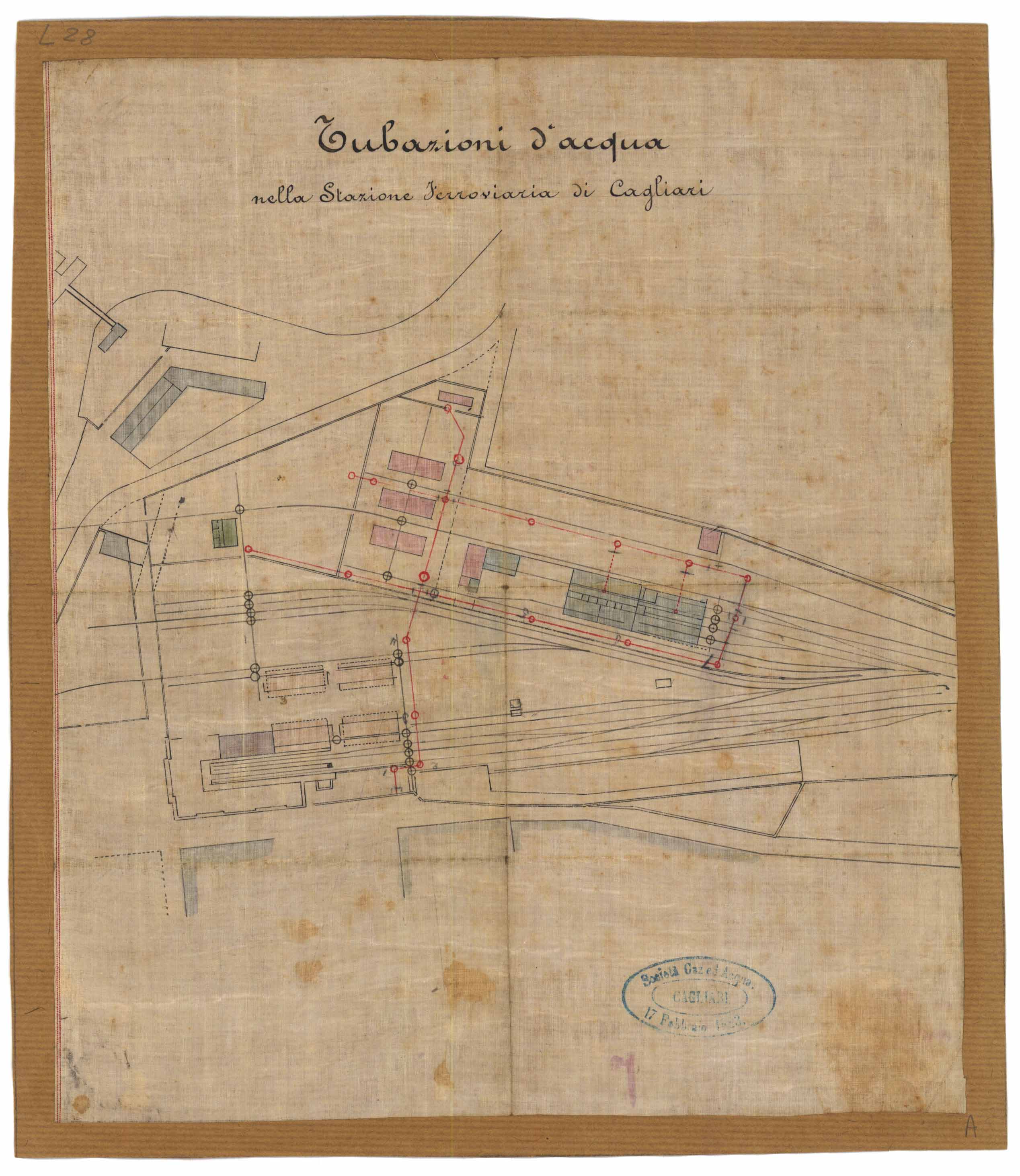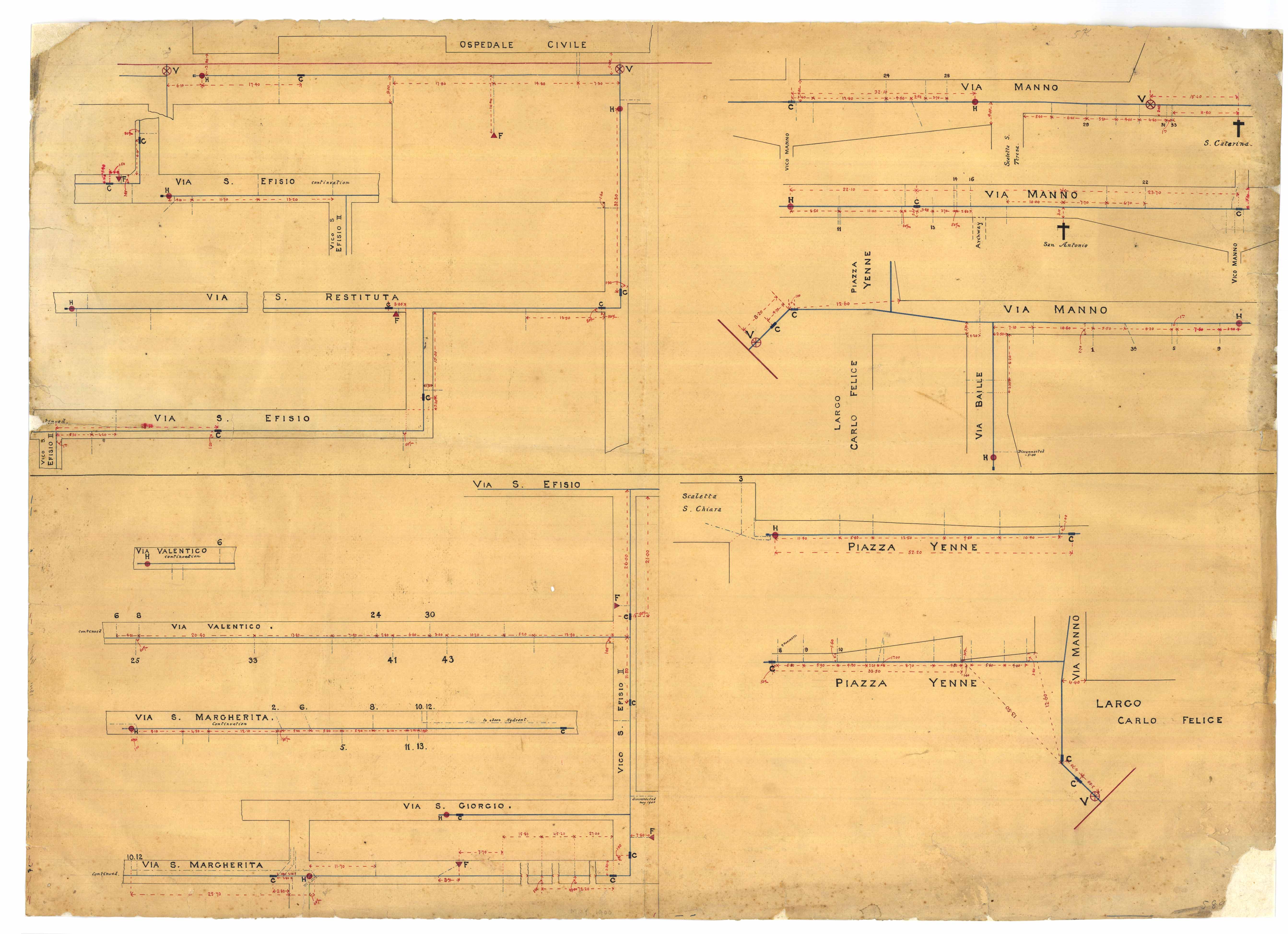 - Planimetria dei quartieri di Castello e Villanova con l'indicazione della rete idrica dell'acquedotto. In particolare viene indicato in rosso l'allaccio delle fontanelle pubbliche e in blu quello per gli edifici pubblici. La tavola è stata tagliata separando le planimetrie dei due quartieri