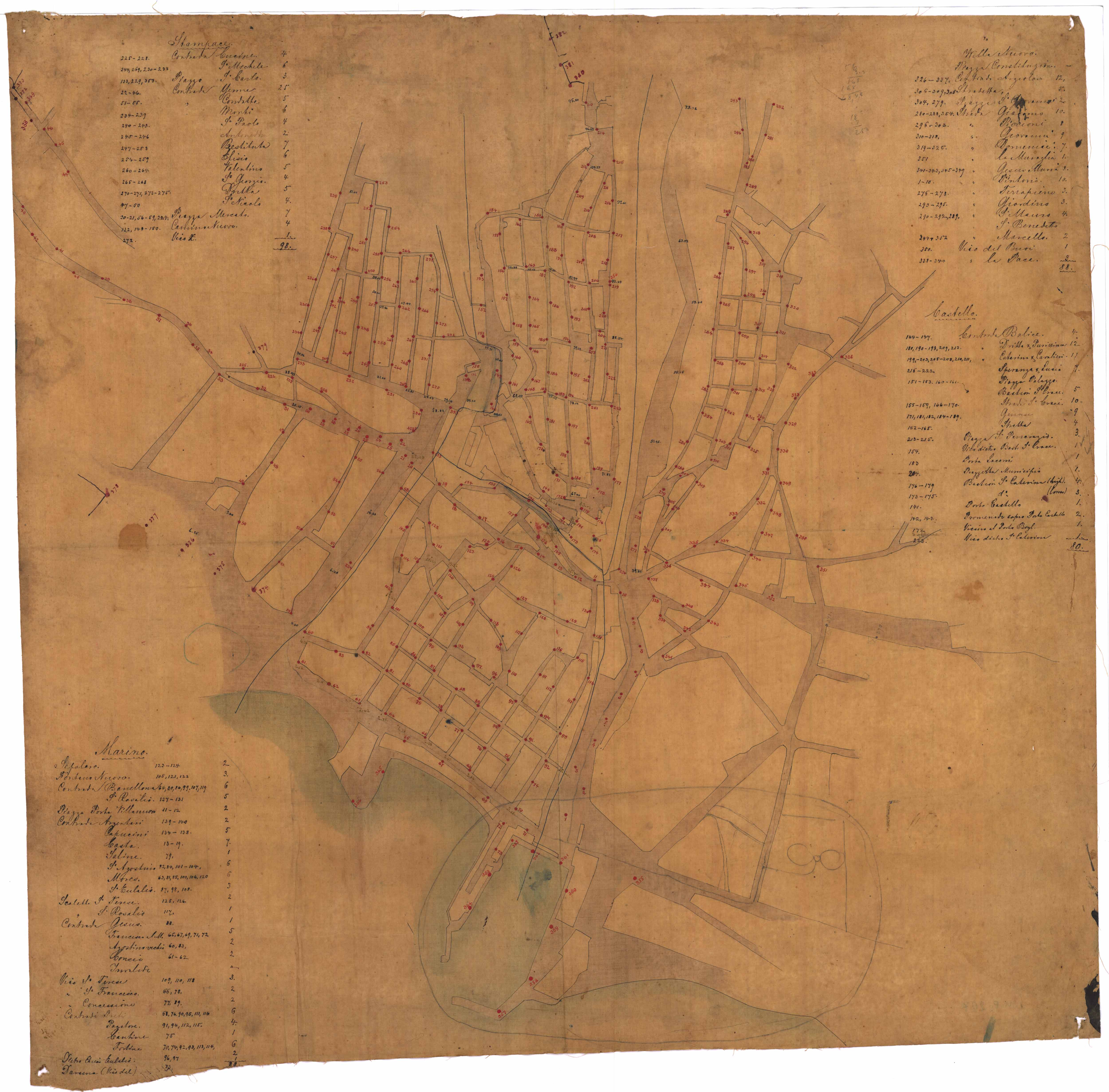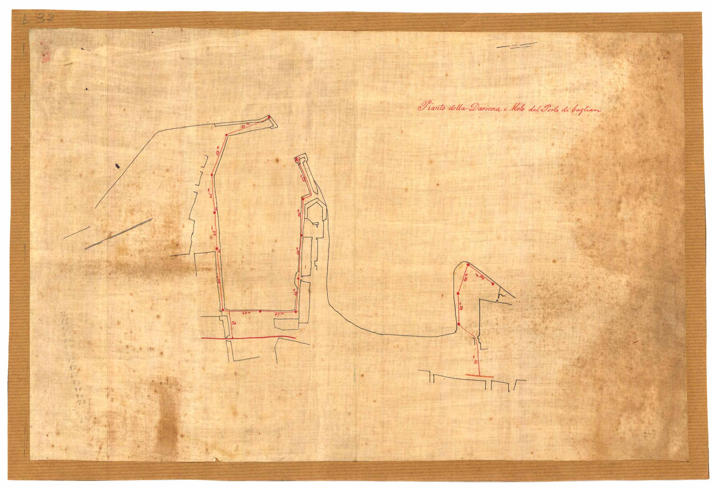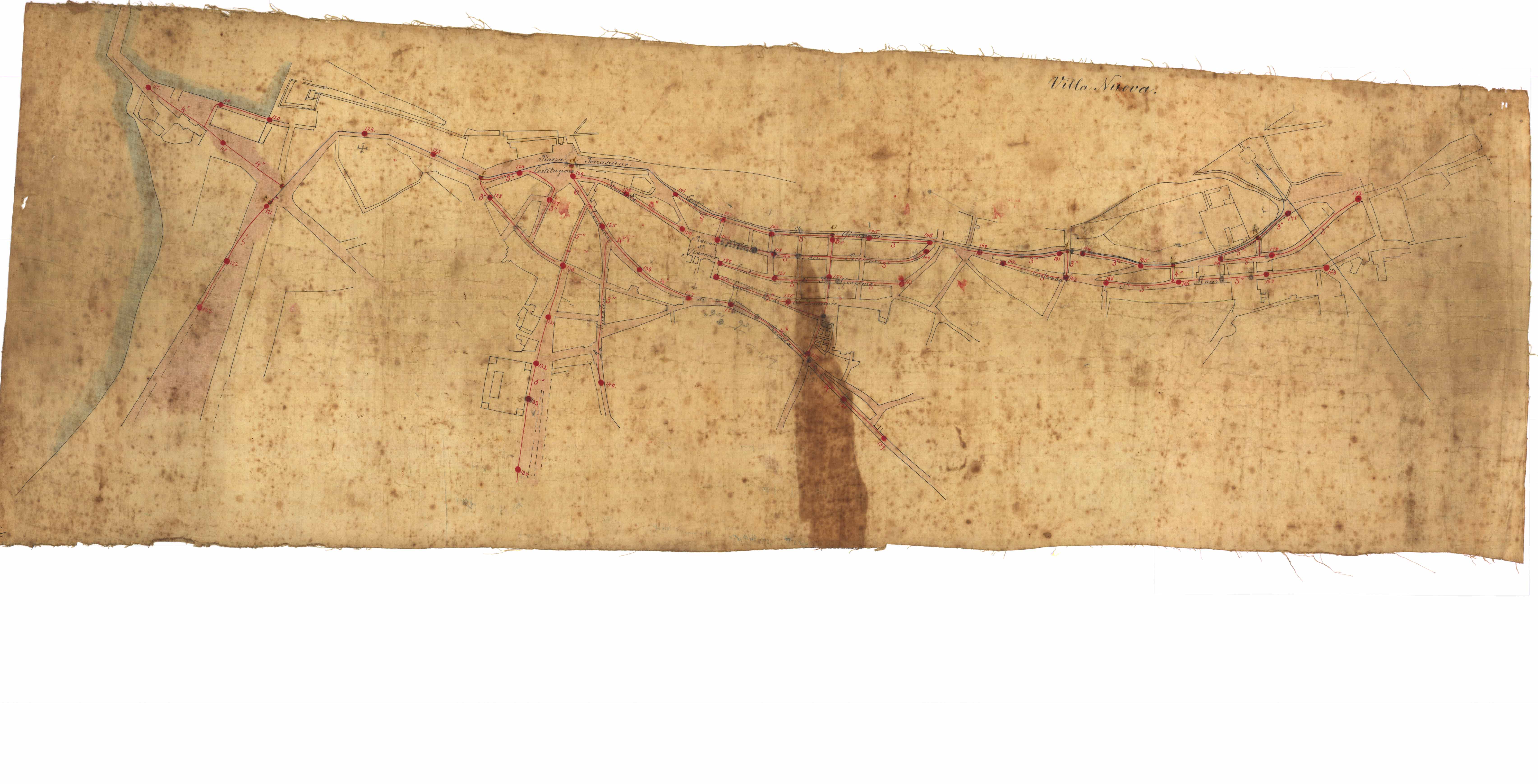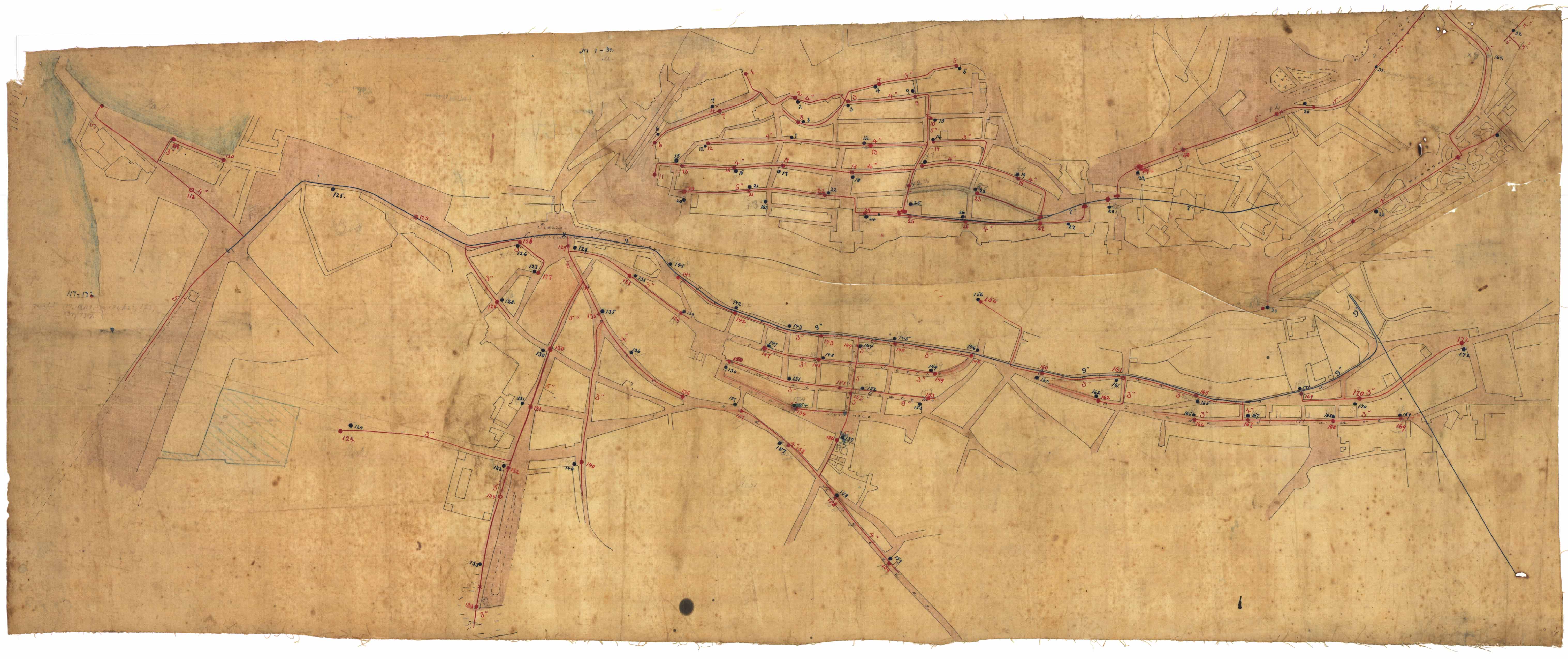 - Planimetria dei quartieri di Castello e Villanova con l'indicazione della rete idrica dell'acquedotto. In particolare viene indicato in rosso l'allaccio delle fontanelle pubbliche e in blu quello per gli edifici pubblici. La tavola è stata tagliata separando le planimetrie dei due quartieri