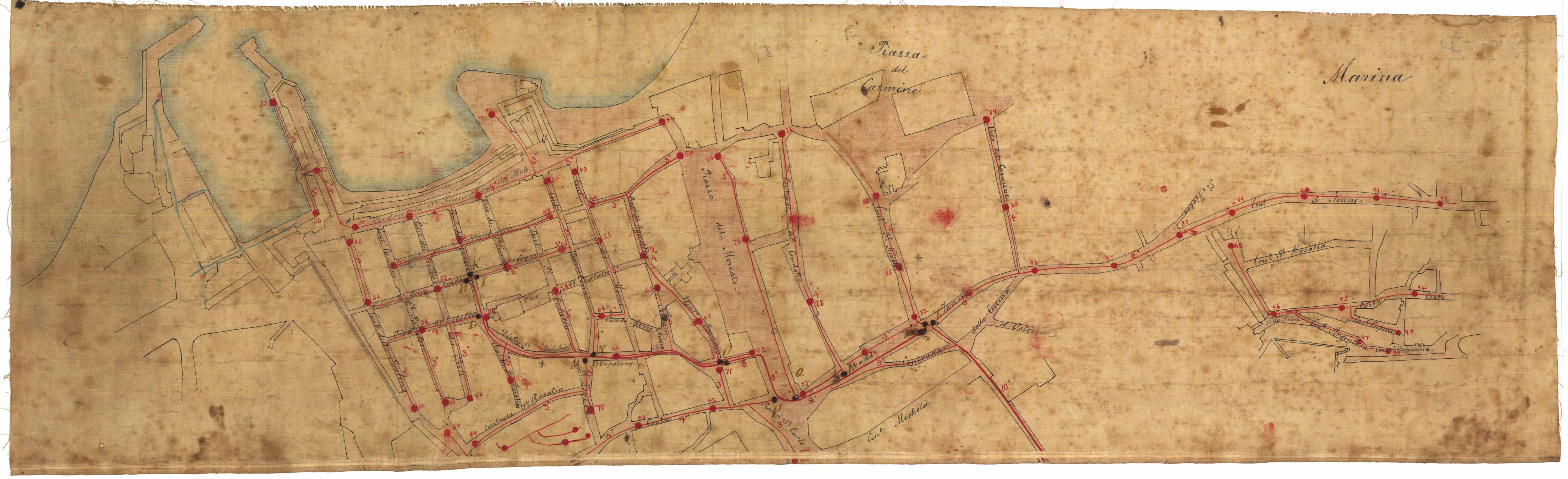 - Planimetria del quartiere Marina con l'indicazione dell'acquedotto con in rosso le fontanelle e in blu gli edifici pubblici.