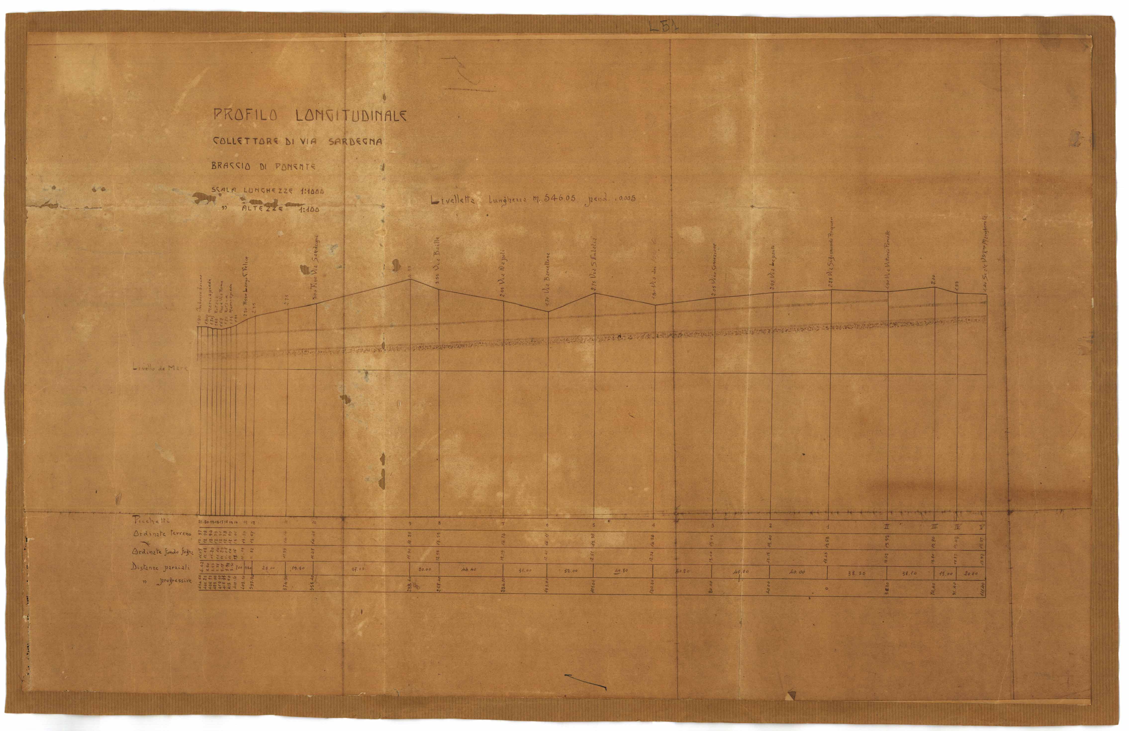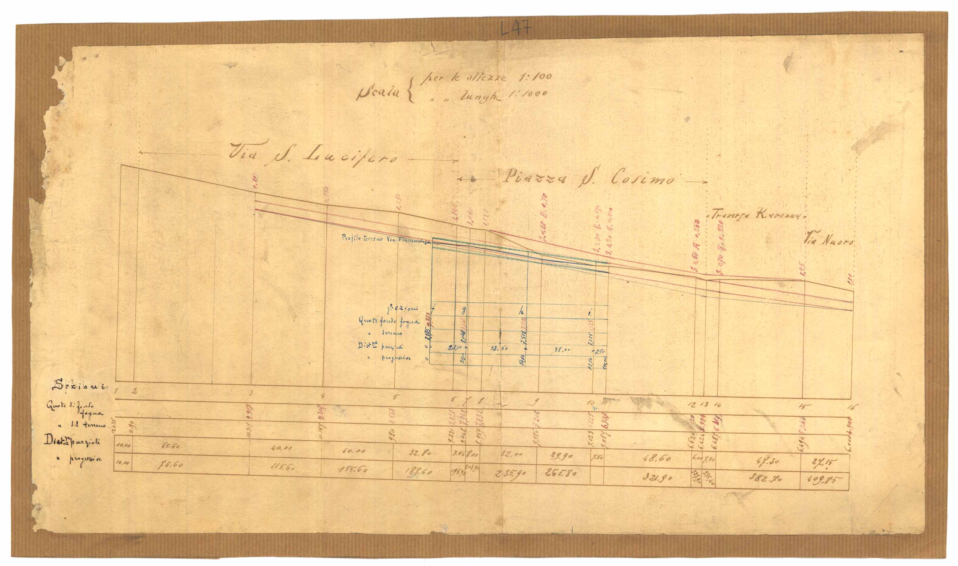 - Disegno della sezione longitudinale delle vie San Lucifero, Piazza S. Cosimo, traversa via Ravenna e Via Nuoro per la sistemazione fognaria.