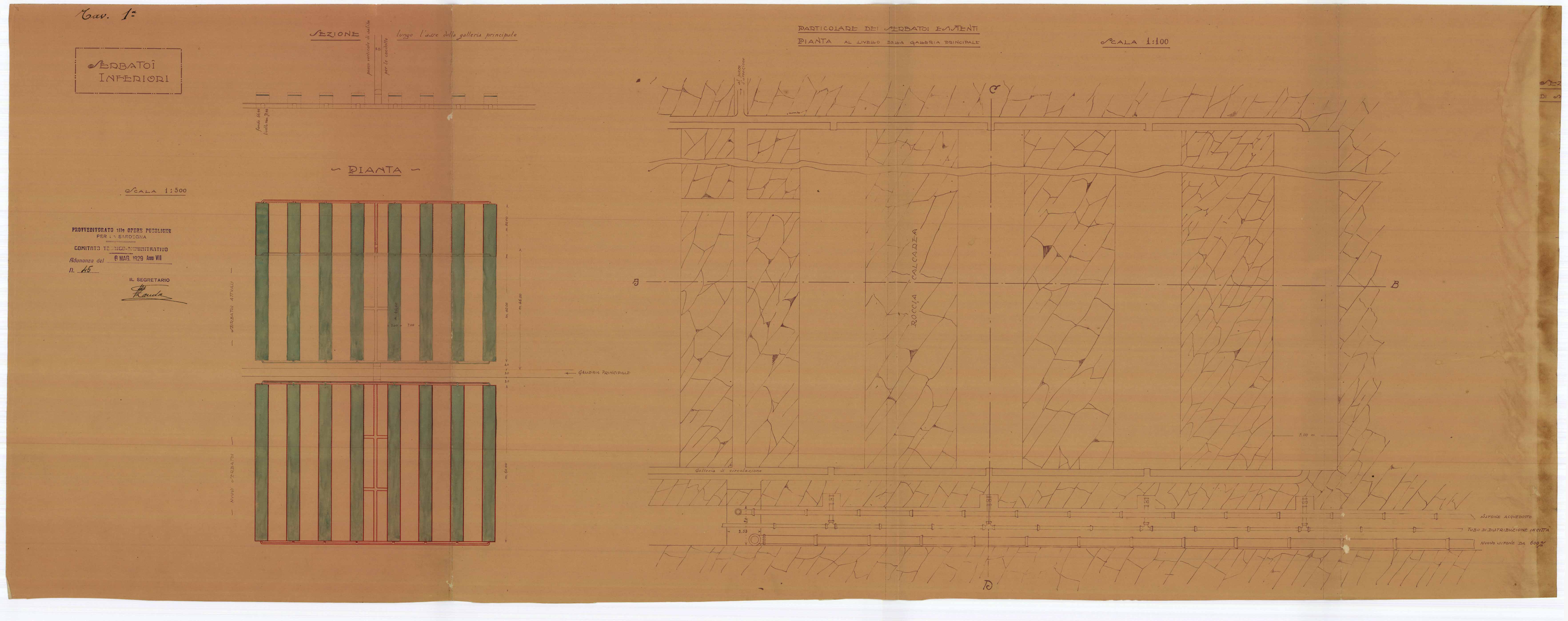 - Disegno dei serbatoi inferiori, del particolare dei serbatoi esistenti e della pianta al livello della galleria principale.